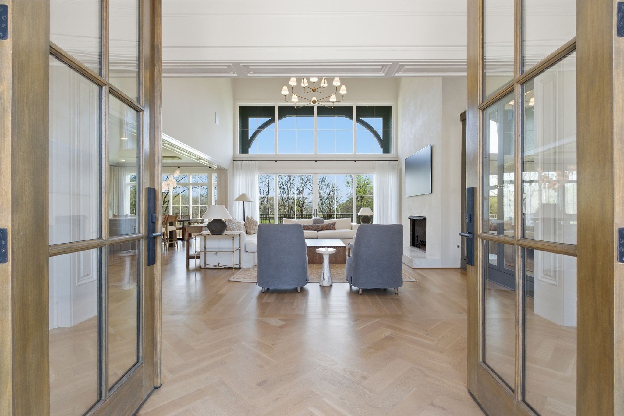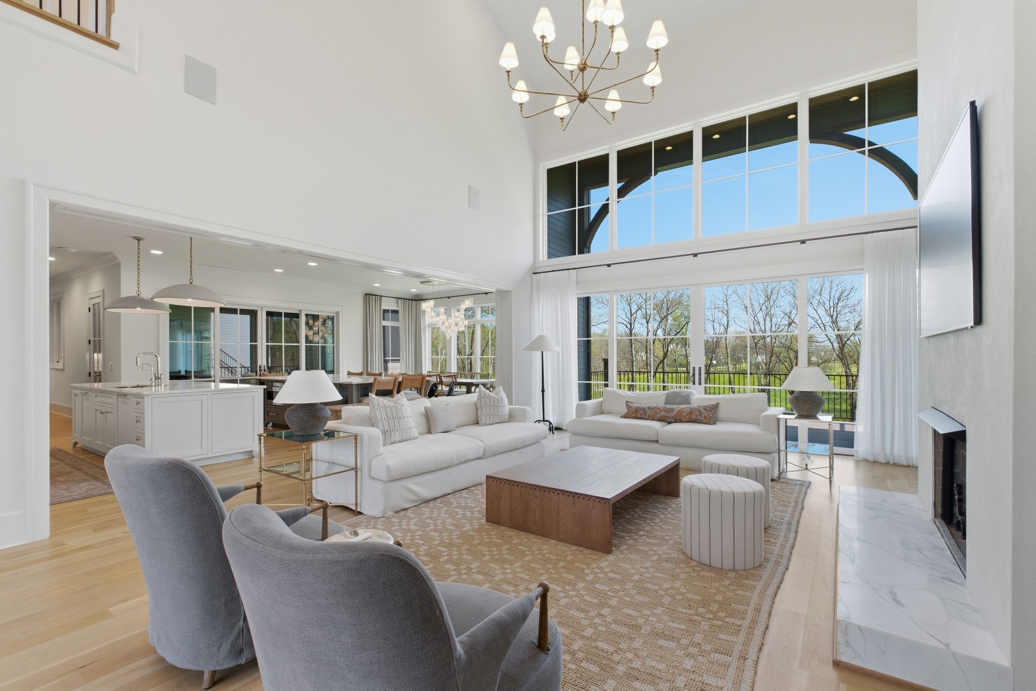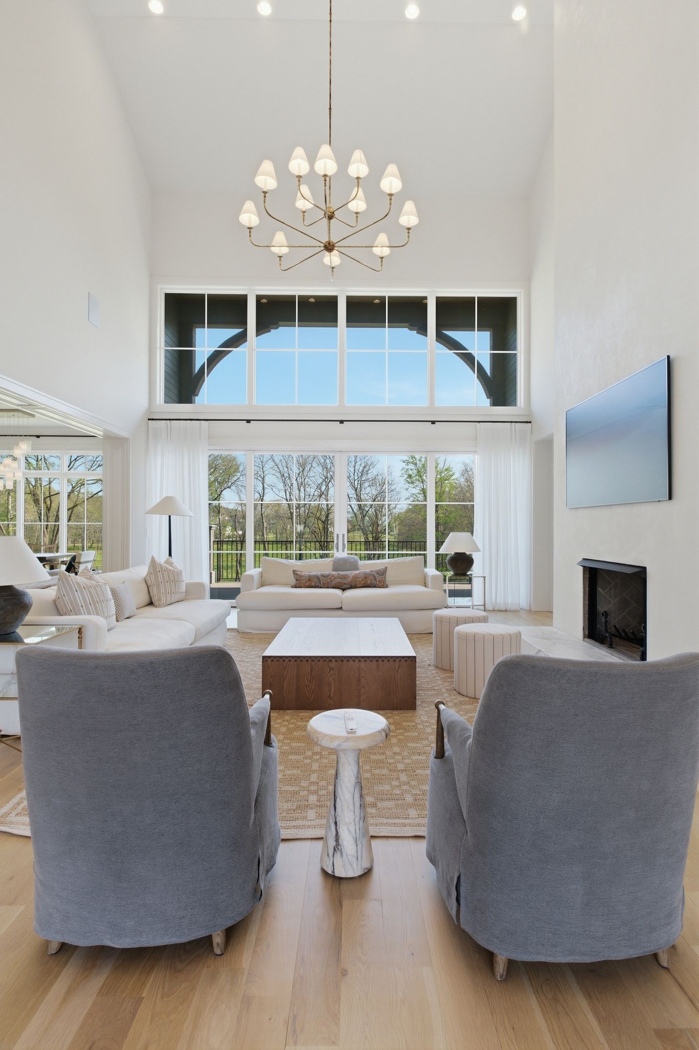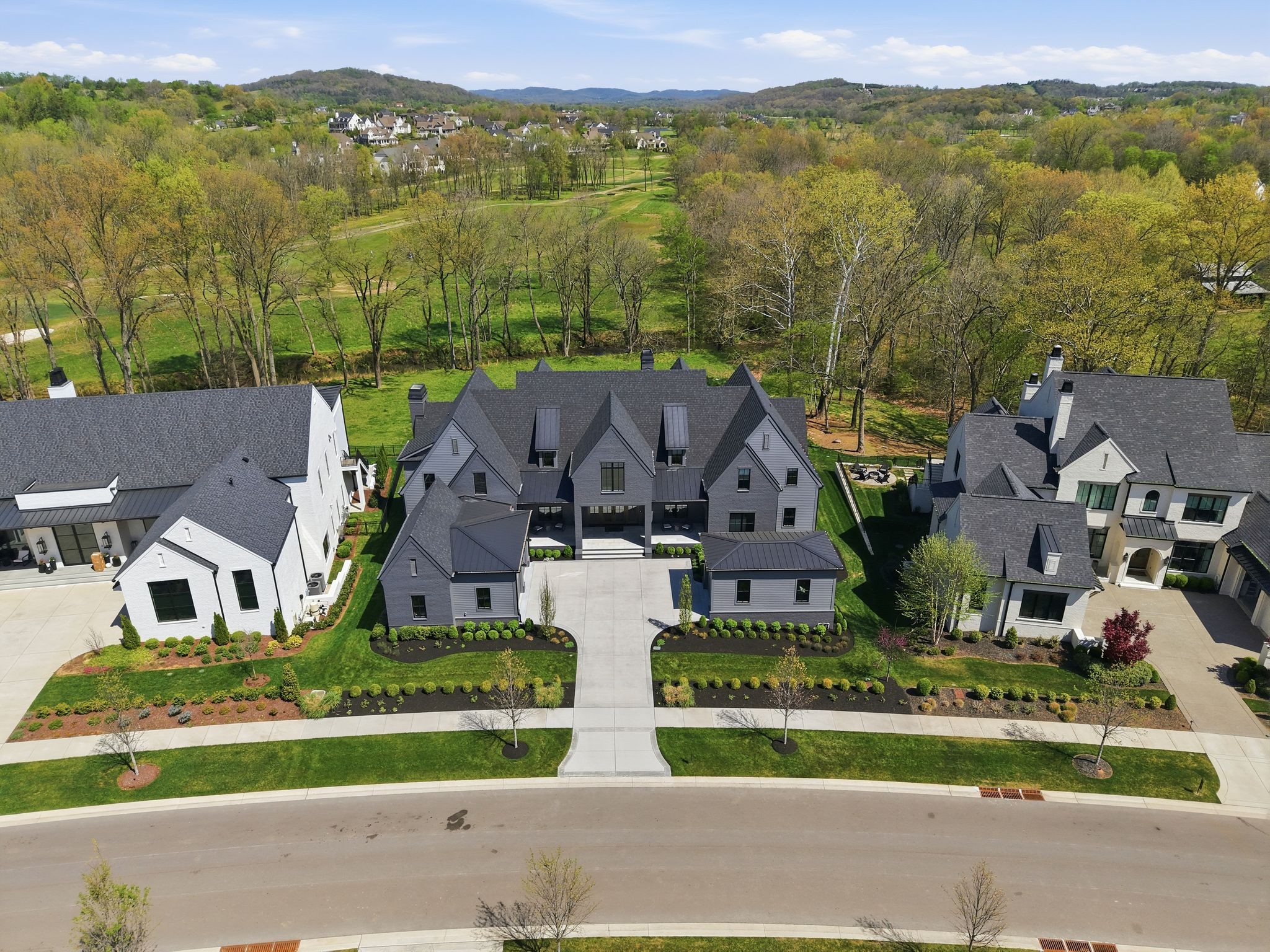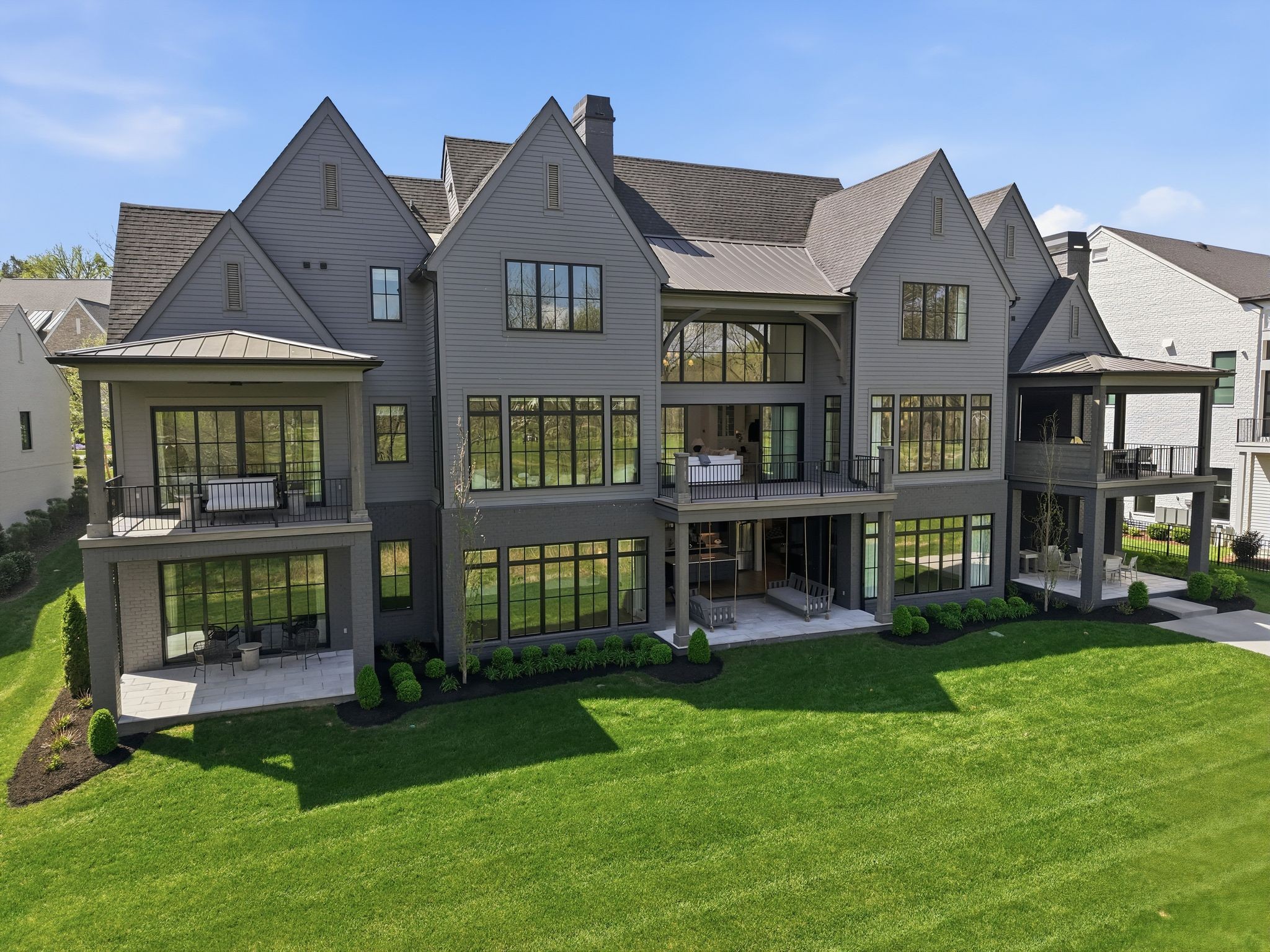 This magnificently designed Modern English Romantic residence offers 8,314 square feet of refined living in one of The Grove’s most picturesque settings. Upon entry, you’re immediately captivated by sweeping golf course views framed through the dramatic two-story family room, extending seamlessly across the covered terrace to the 16th green and fairway beyond. The main level showcases a luxurious primary suite with a vaulted ceiling, private covered porch overlooking the course, and dual walk-in closets. Additional highlights include a private study, expansive great room, and elevator access to all three levels. The outdoor living space is thoughtfully appointed with a covered porch featuring a built-in ceiling heater, fireplace, grill, and electric screens—creating a true year-round retreat. Upstairs, three ensuite bedrooms, a loft with dual swings, and a dedicated home office provide both comfort and flexibility. The lower level is designed for elevated entertaining, offering an additional ensuite bedroom, custom bunk room, full bar, three covered porches, and generous storage. A truly exceptional offering in The Grove, blending timeless design with modern luxury.