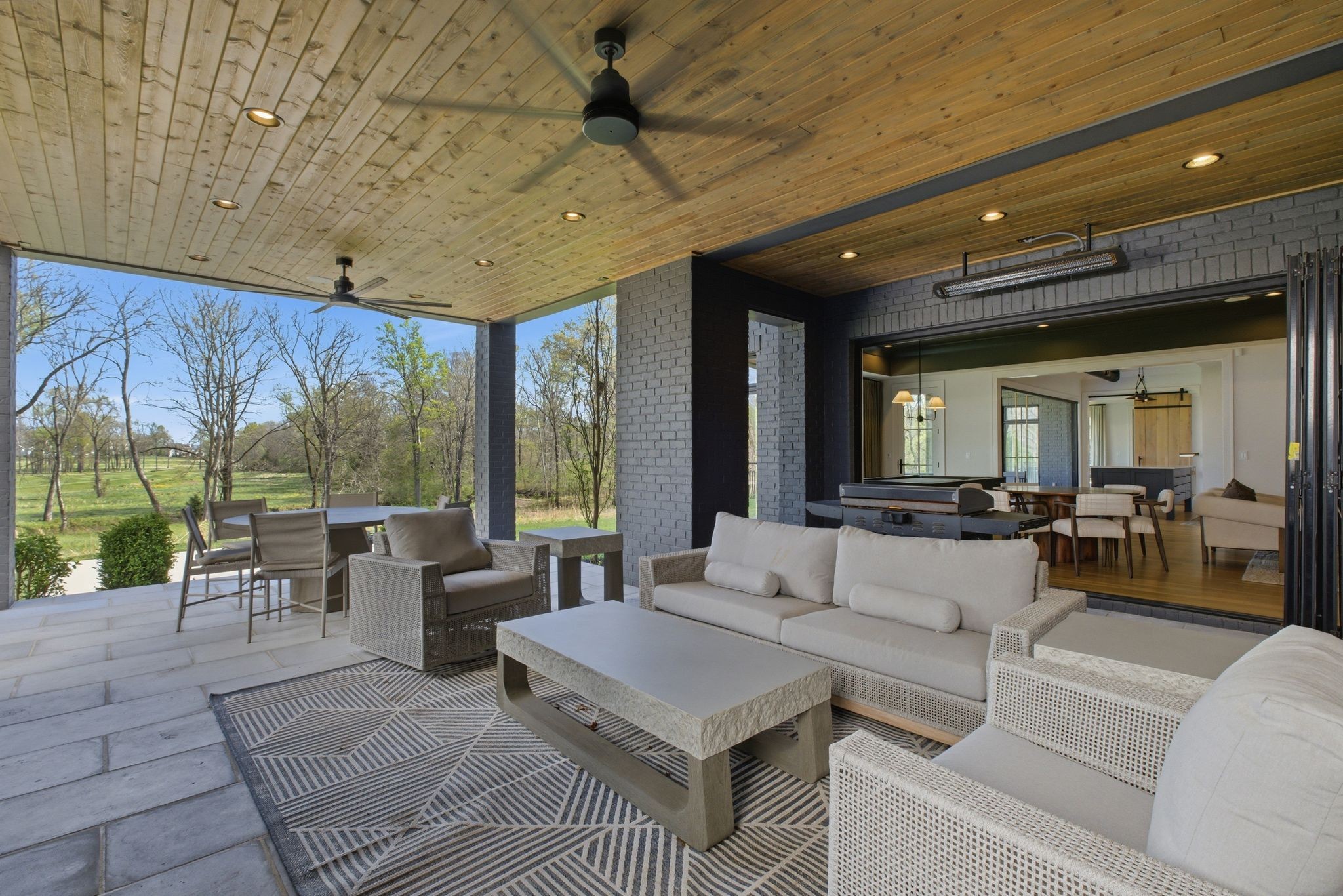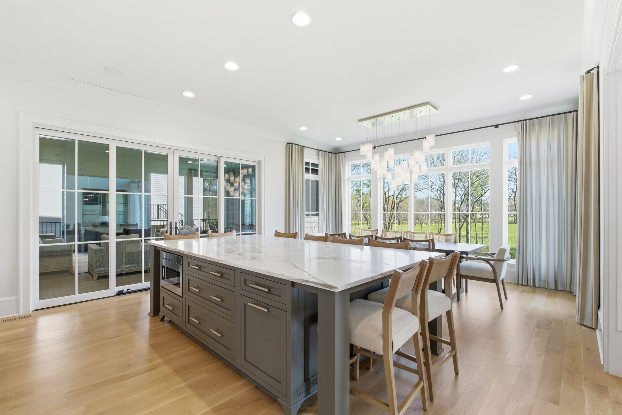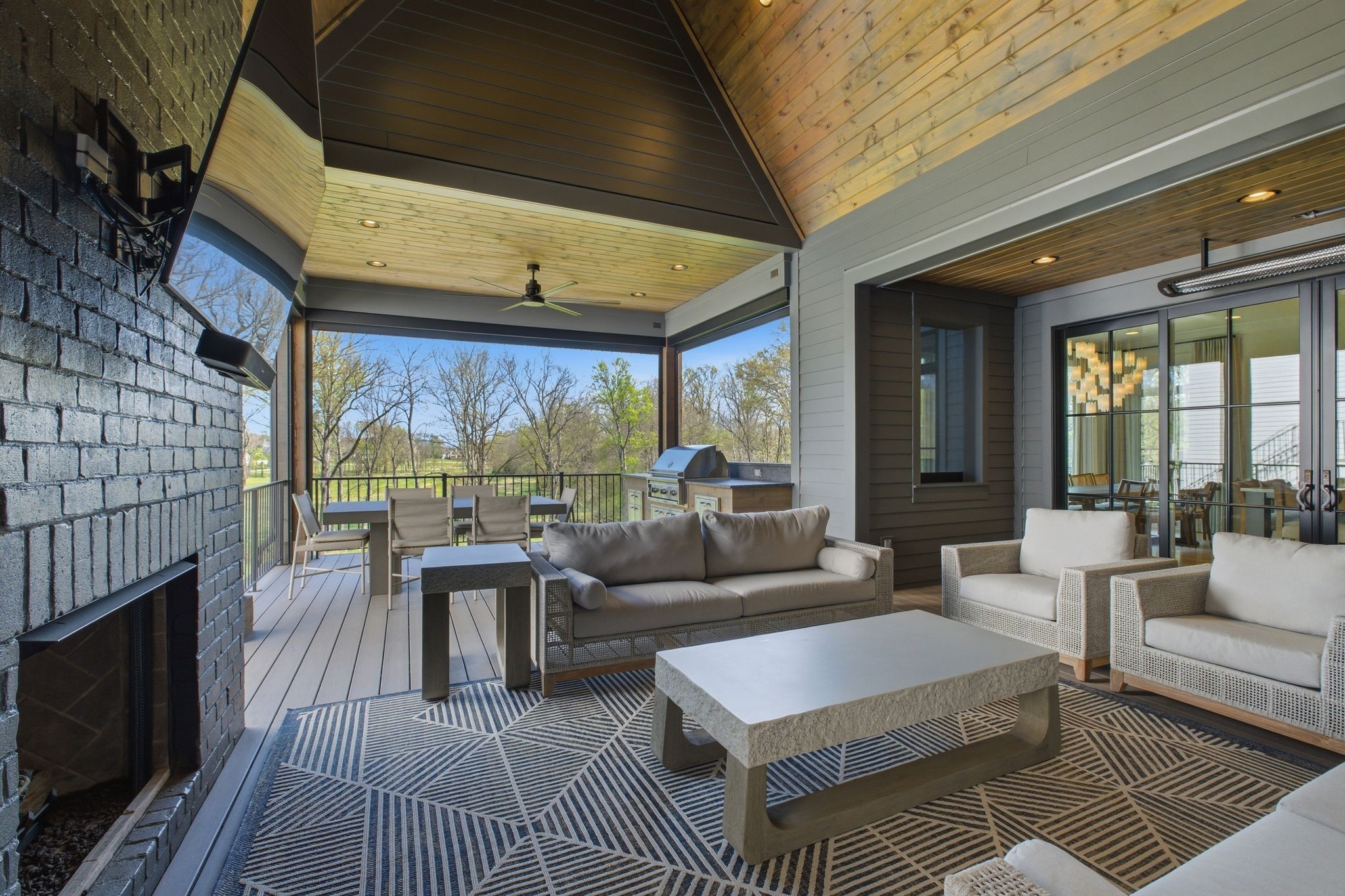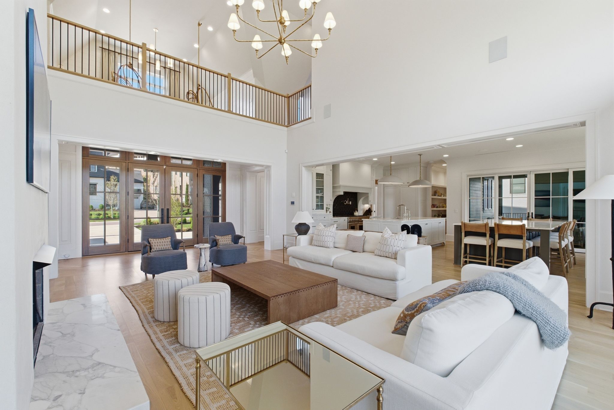 This magnificently designed Modern English Romantic residence offers 8,314 square feet of refined living in one of The Grove’s most picturesque settings. Upon entry, you’re immediately captivated by sweeping golf course views framed through the dramatic two-story family room, extending seamlessly across the covered terrace to the 16th green and fairway beyond. The main level showcases a luxurious primary suite with a vaulted ceiling, private covered porch overlooking the course, and dual walk-in closets. Additional highlights include a private study, expansive great room, and elevator access to all three levels. The outdoor living space is thoughtfully appointed with a covered porch featuring a built-in ceiling heater, fireplace, grill, and electric screens—creating a true year-round retreat. Upstairs, three ensuite bedrooms, a loft with dual swings, and a dedicated home office provide both comfort and flexibility. The lower level is designed for elevated entertaining, offering an additional ensuite bedroom, custom bunk room, full bar, three covered porches, and generous storage. A truly exceptional offering in The Grove, blending timeless design with modern luxury.