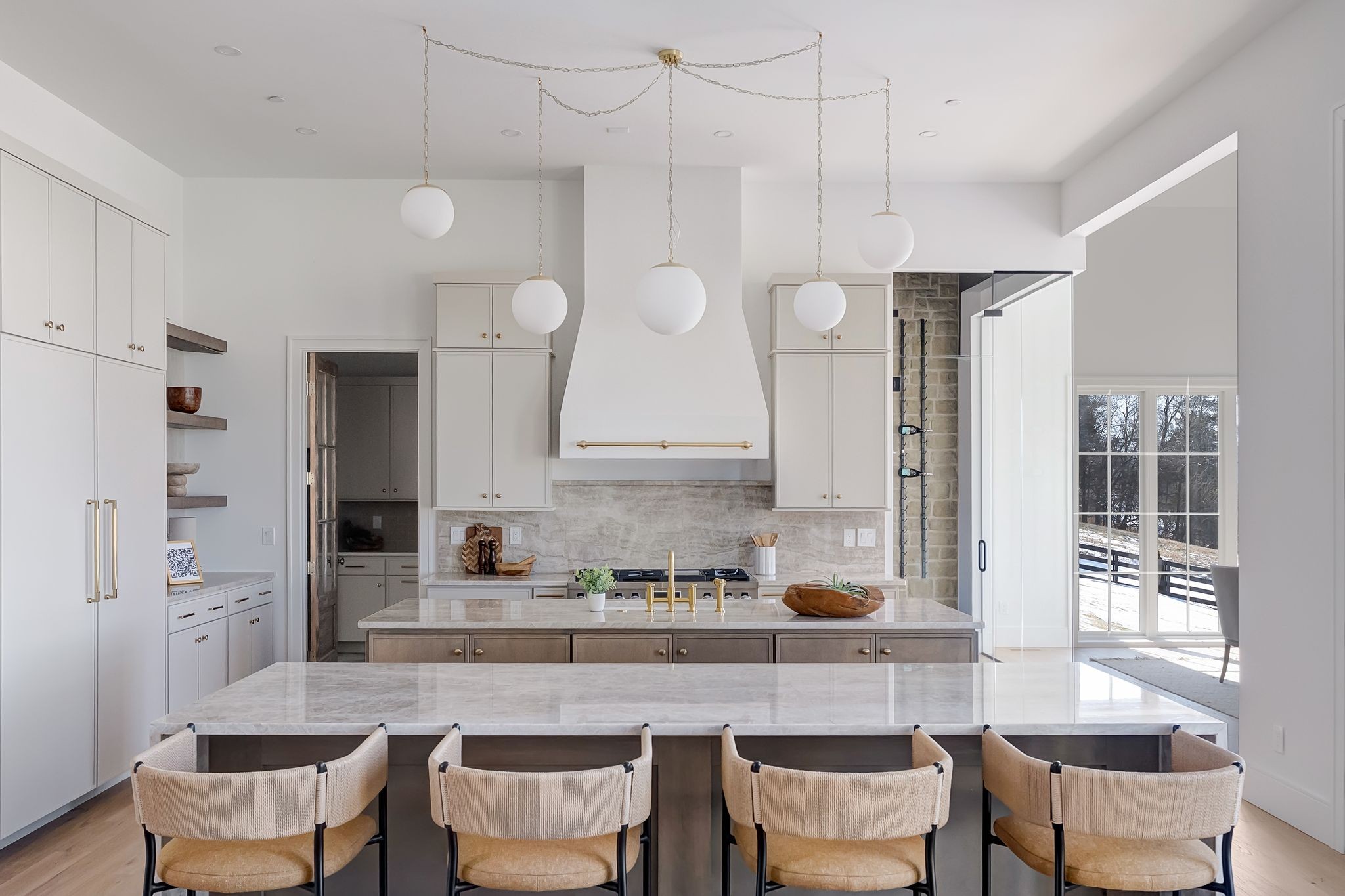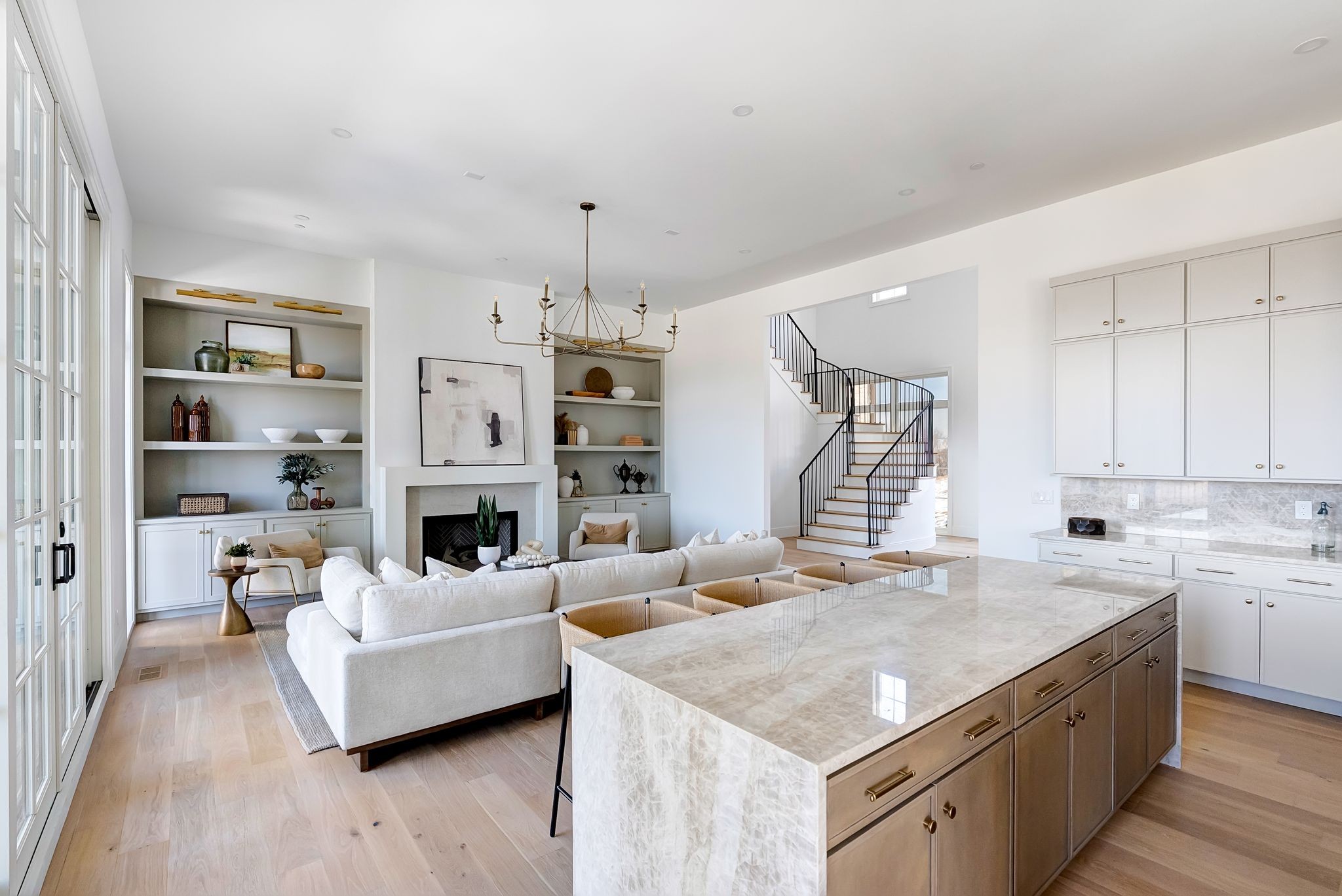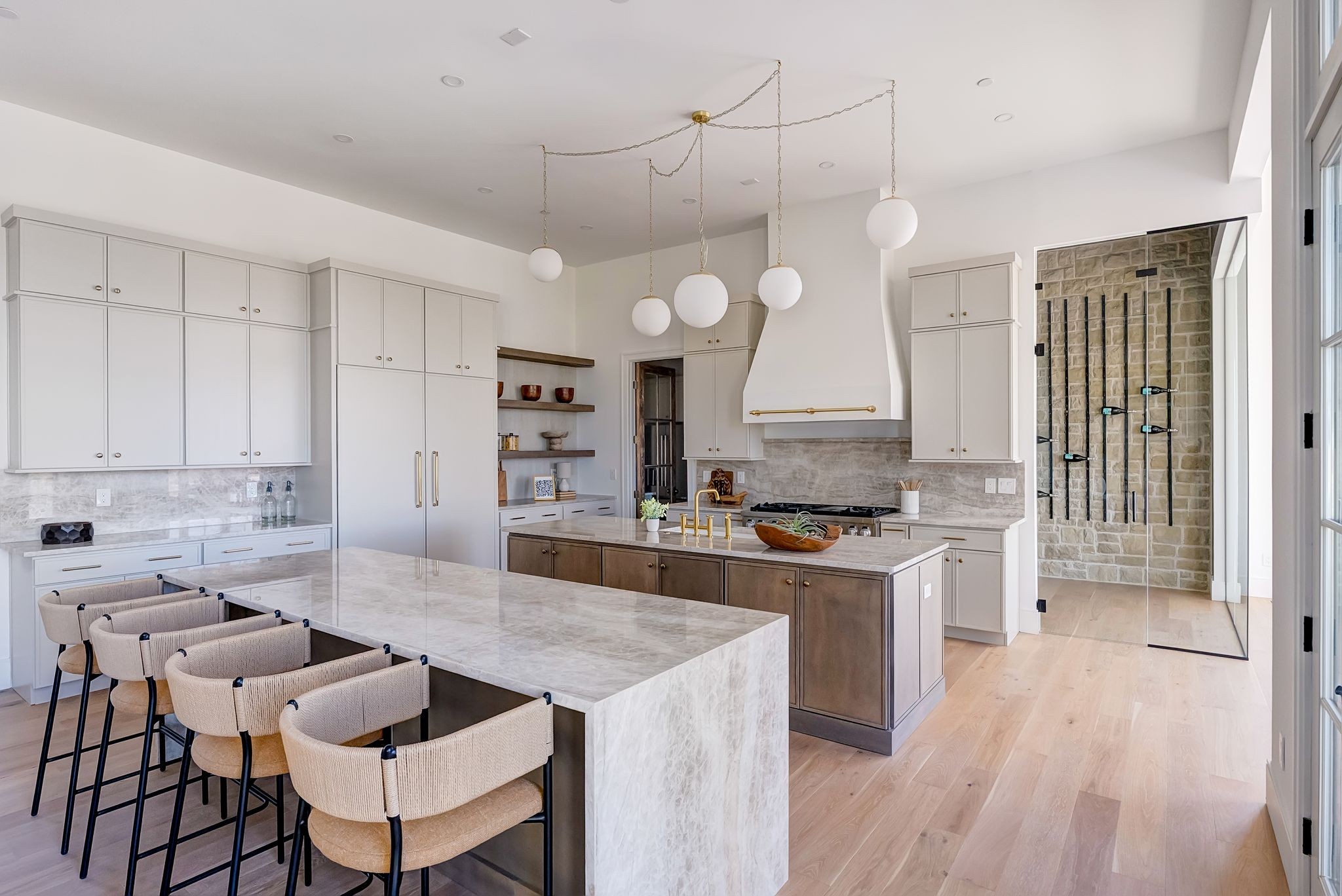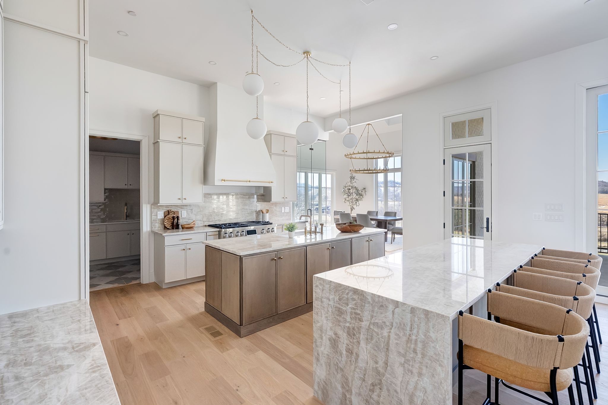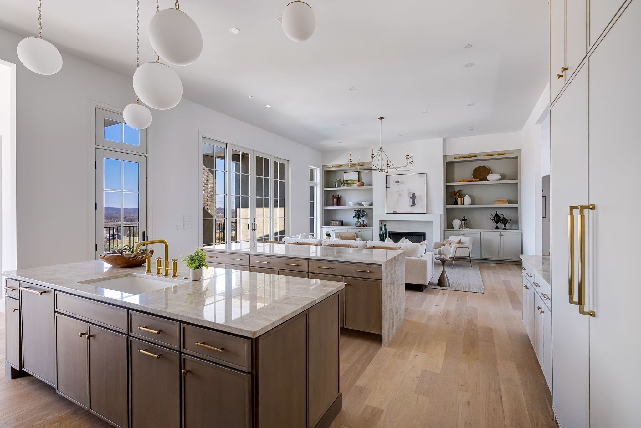 The Tudor-inspired exterior blends natural stone and brick selected to complement the landscape and capture warm sunset views. Inside, the home centers around a chef’s kitchen featuring a double-island layout designed for functionality, flow, and gathering. Fully panelized appliances maintain a seamless aesthetic while a full scullery with secondary kitchen allows for effortless entertaining while keeping the main space pristine.