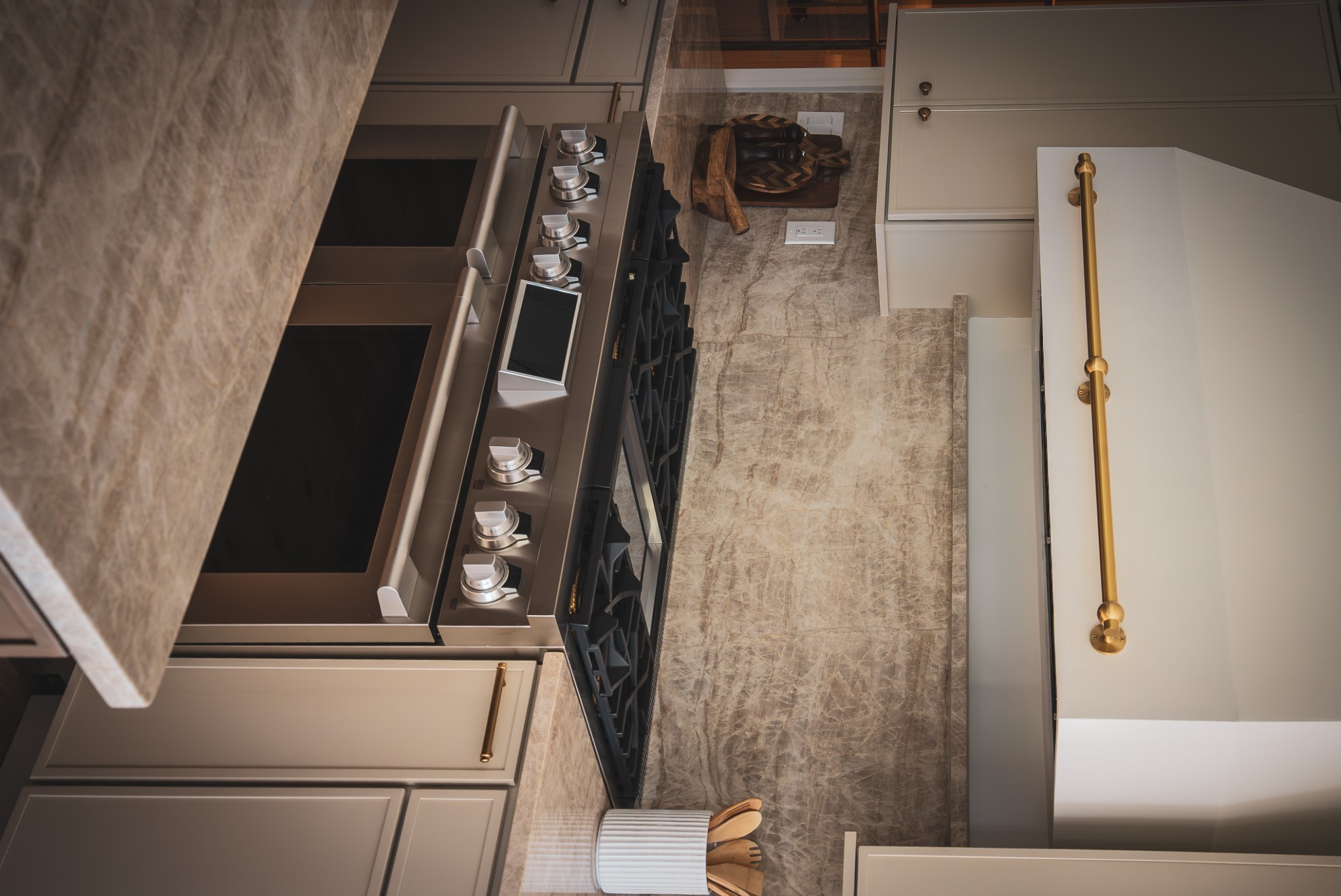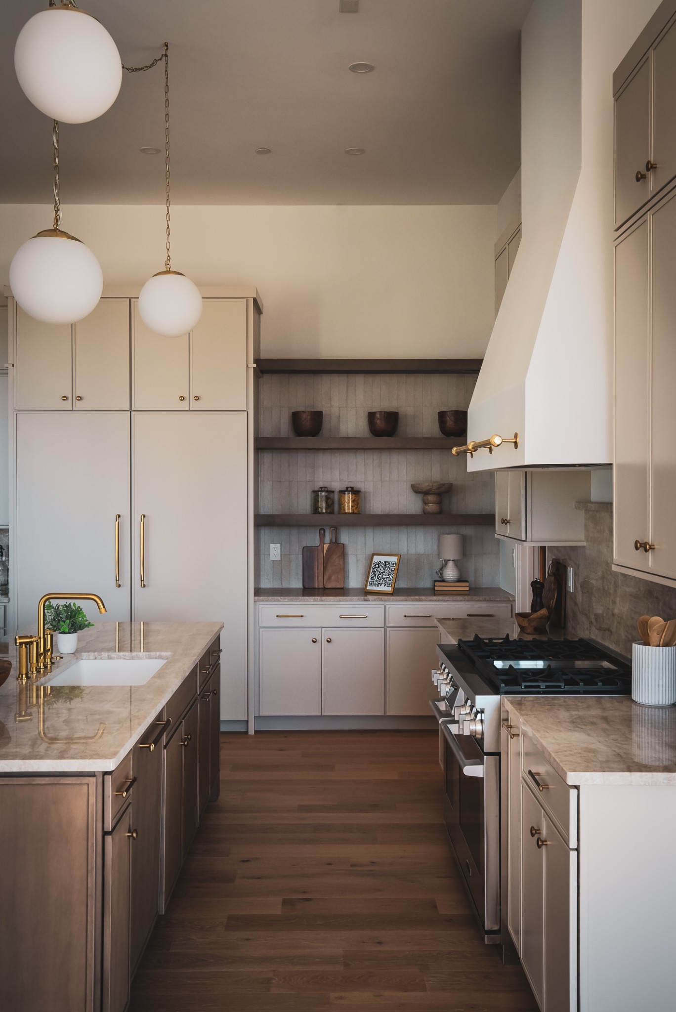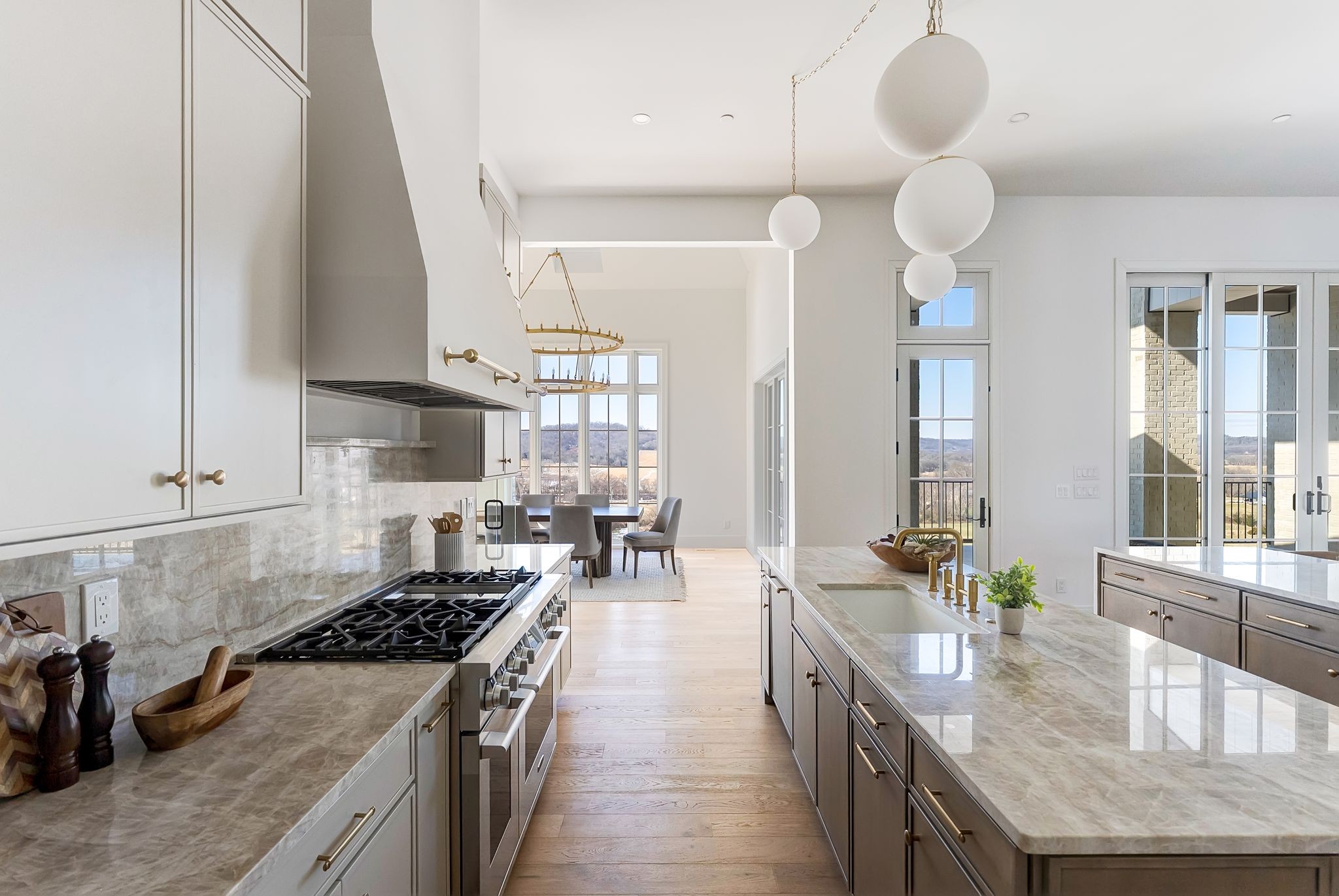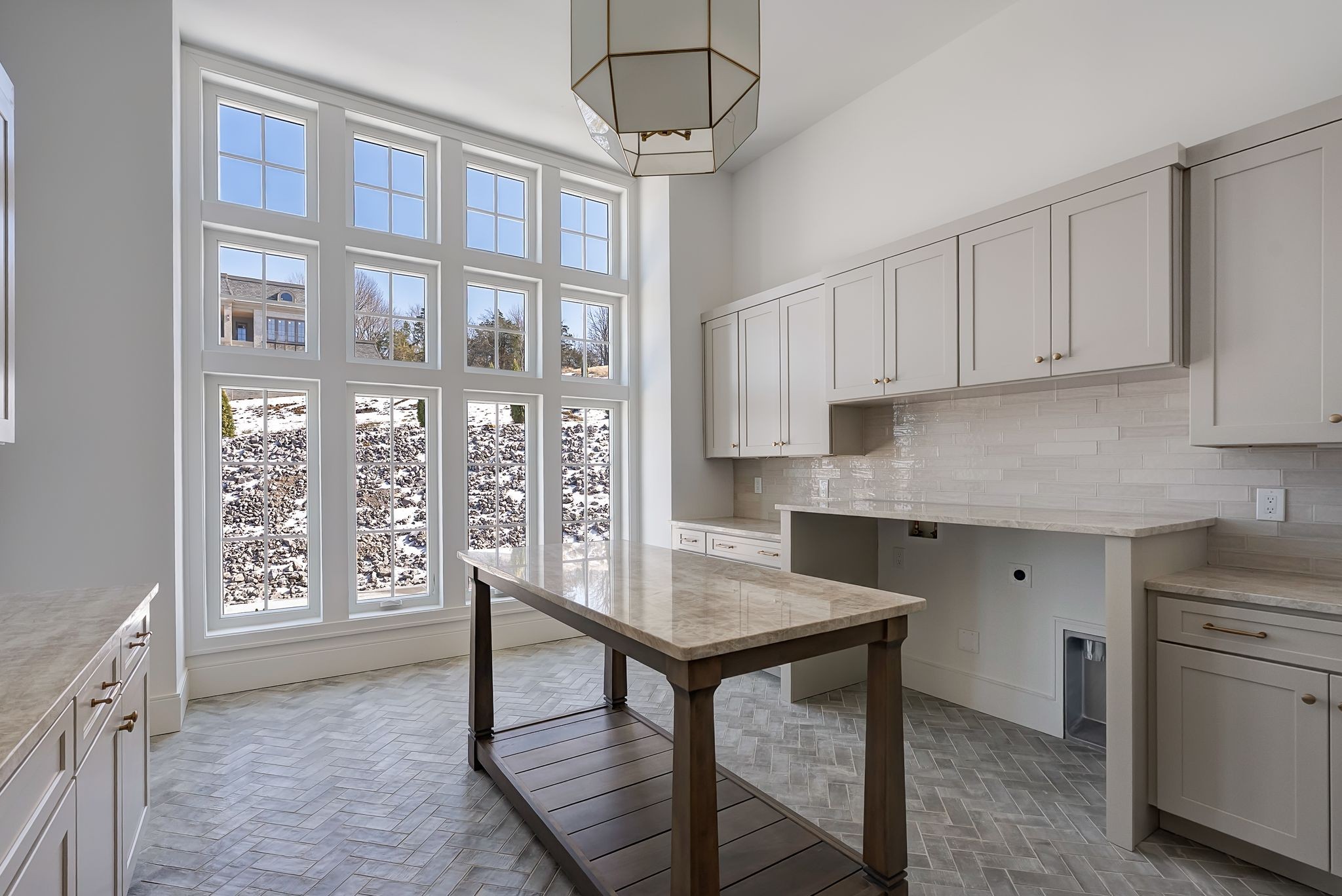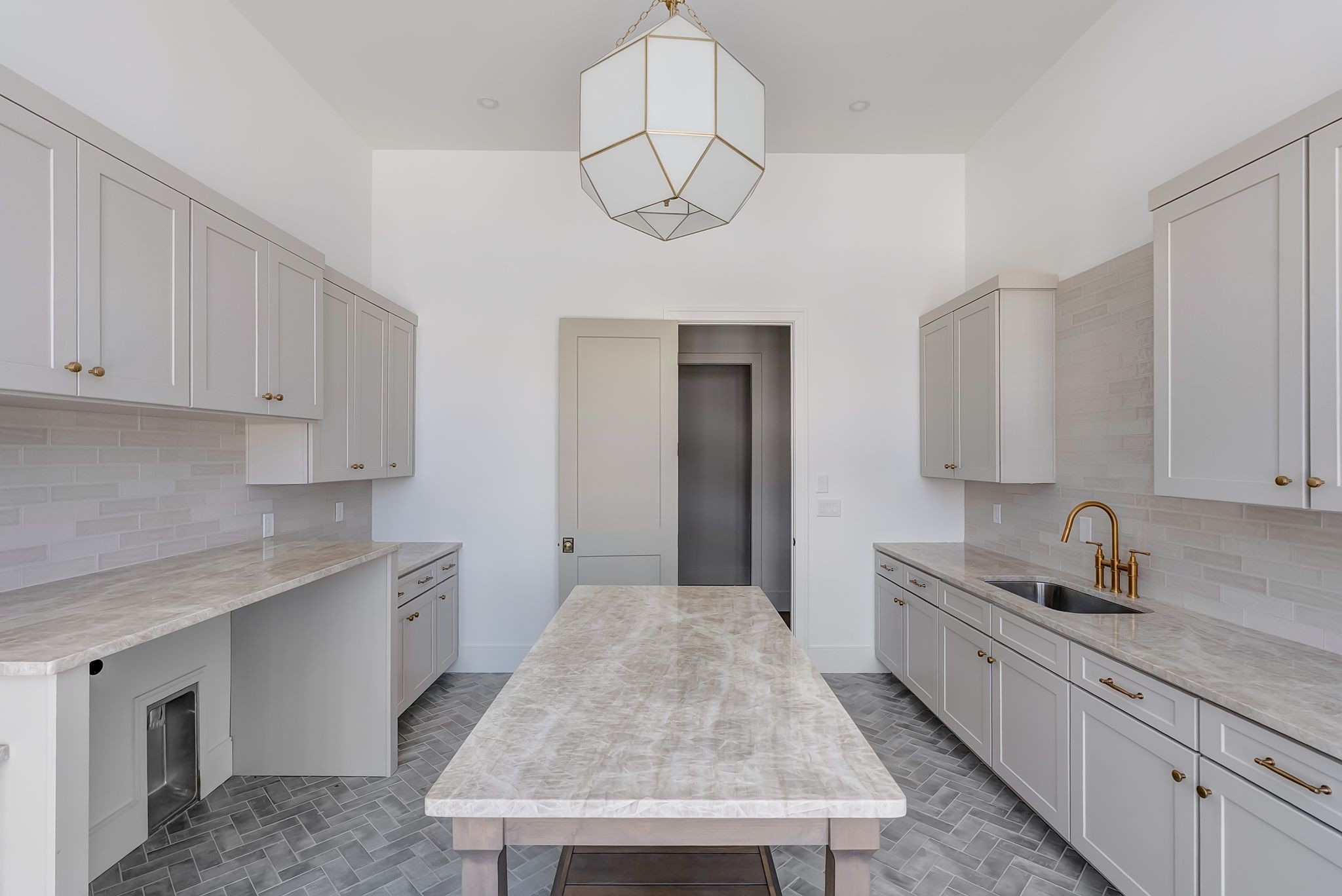 The Tudor-inspired exterior blends natural stone and brick selected to complement the landscape and capture warm sunset views. Inside, the home centers around a chef’s kitchen featuring a double-island layout designed for functionality, flow, and gathering. Fully panelized appliances maintain a seamless aesthetic while a full scullery with secondary kitchen allows for effortless entertaining while keeping the main space pristine.