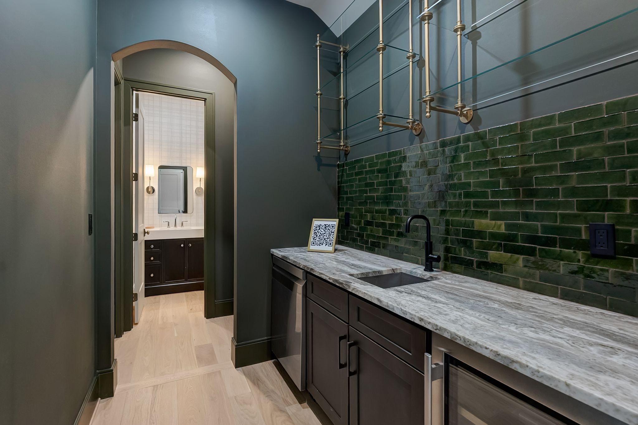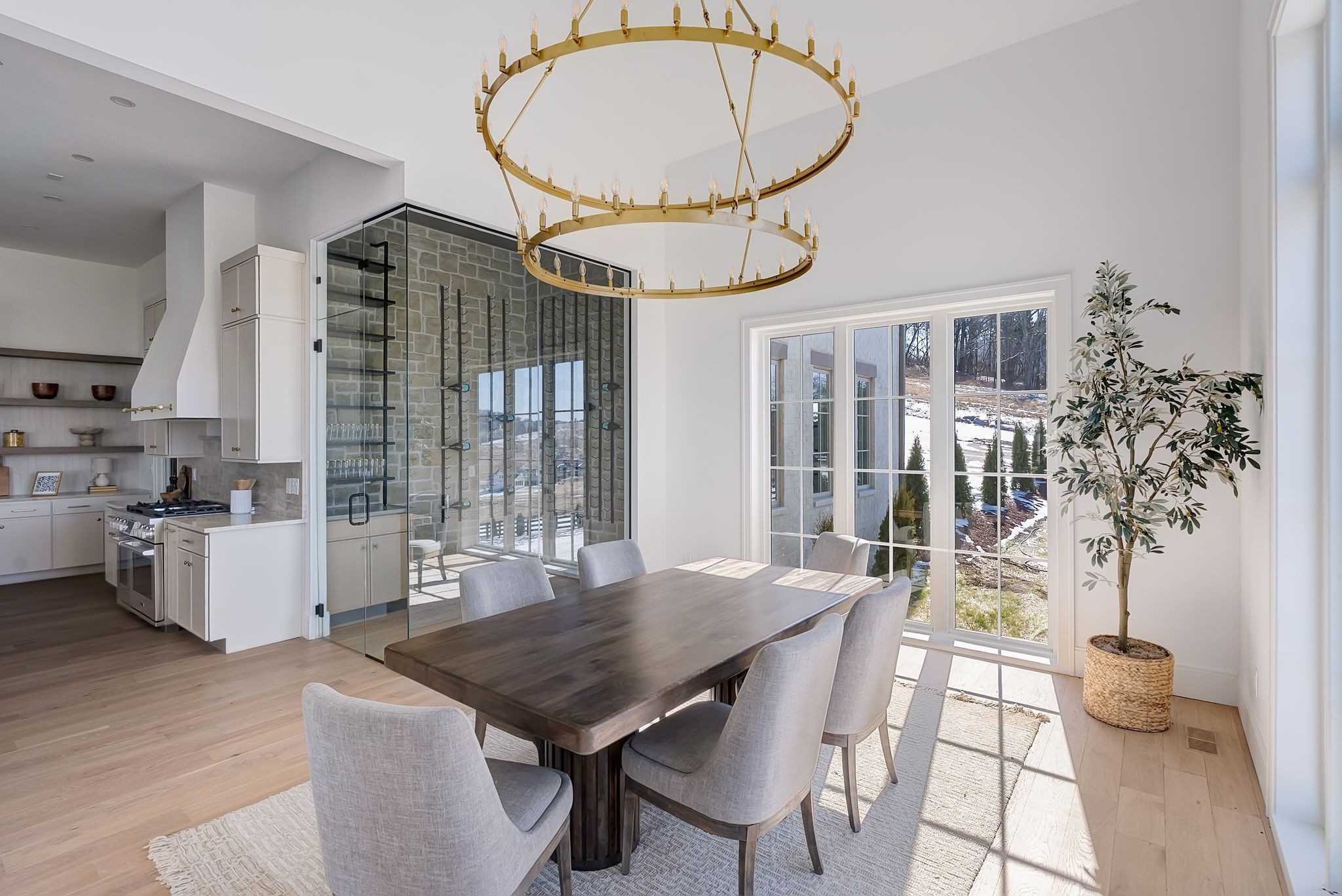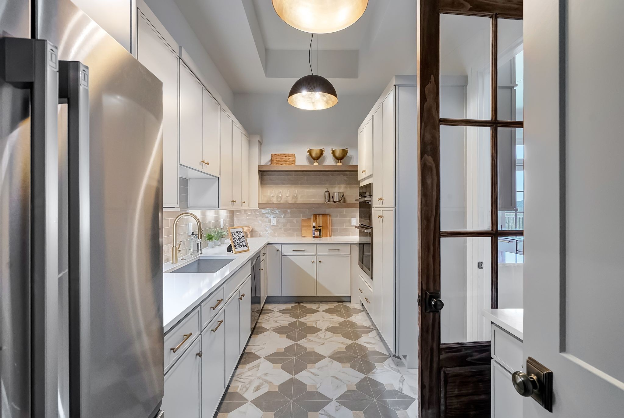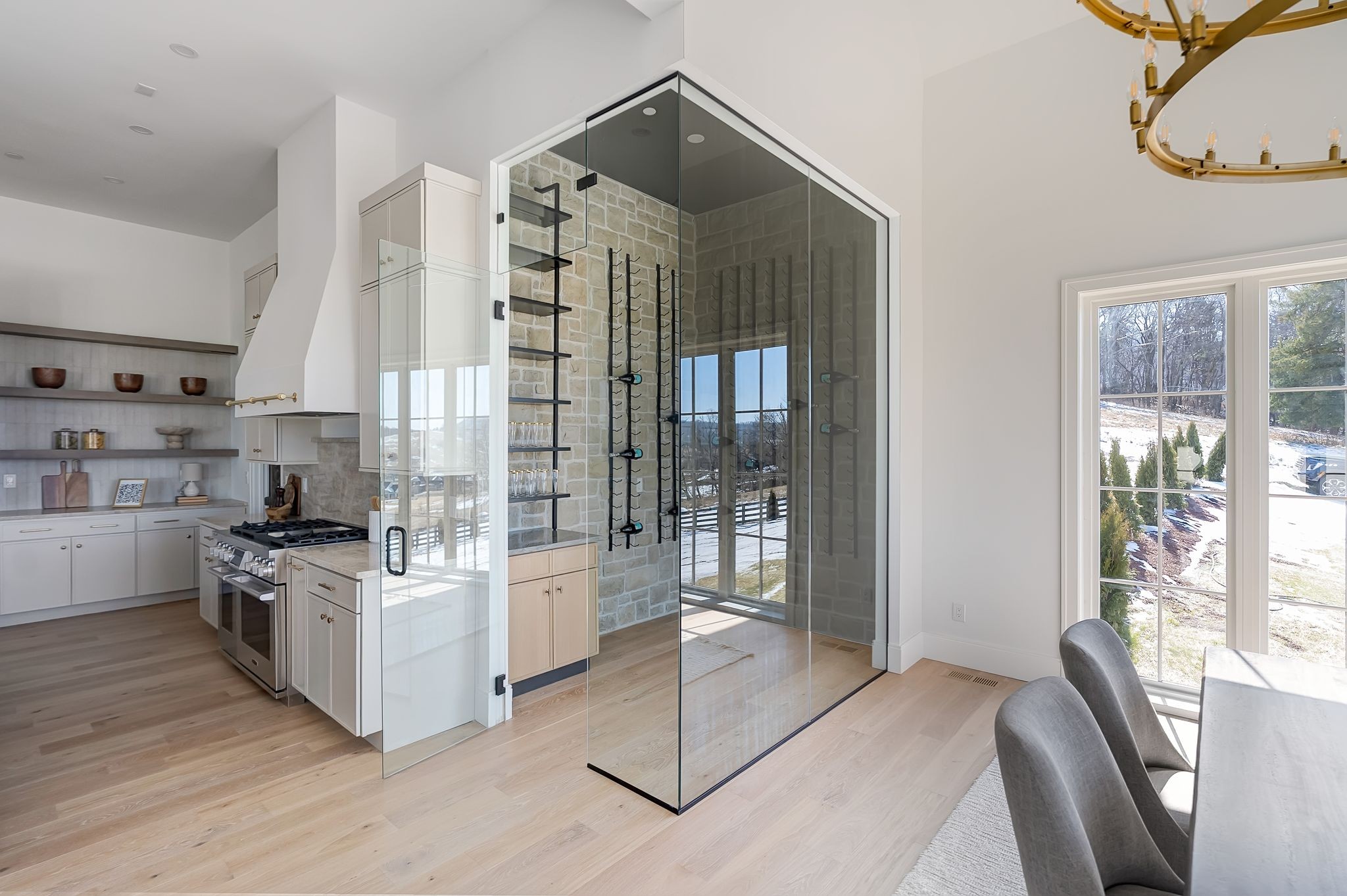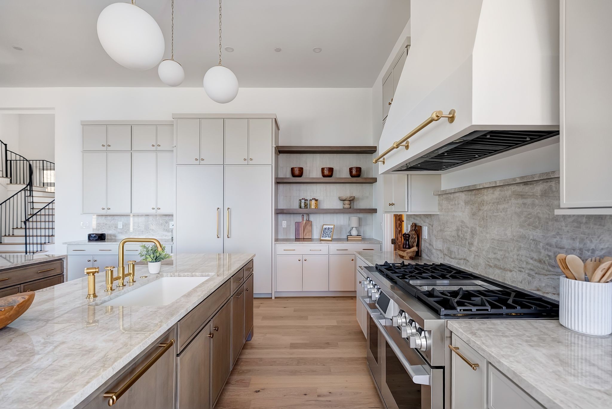 The Tudor-inspired exterior blends natural stone and brick selected to complement the landscape and capture warm sunset views. Inside, the home centers around a chef’s kitchen featuring a double-island layout designed for functionality, flow, and gathering. Fully panelized appliances maintain a seamless aesthetic while a full scullery with secondary kitchen allows for effortless entertaining while keeping the main space pristine.