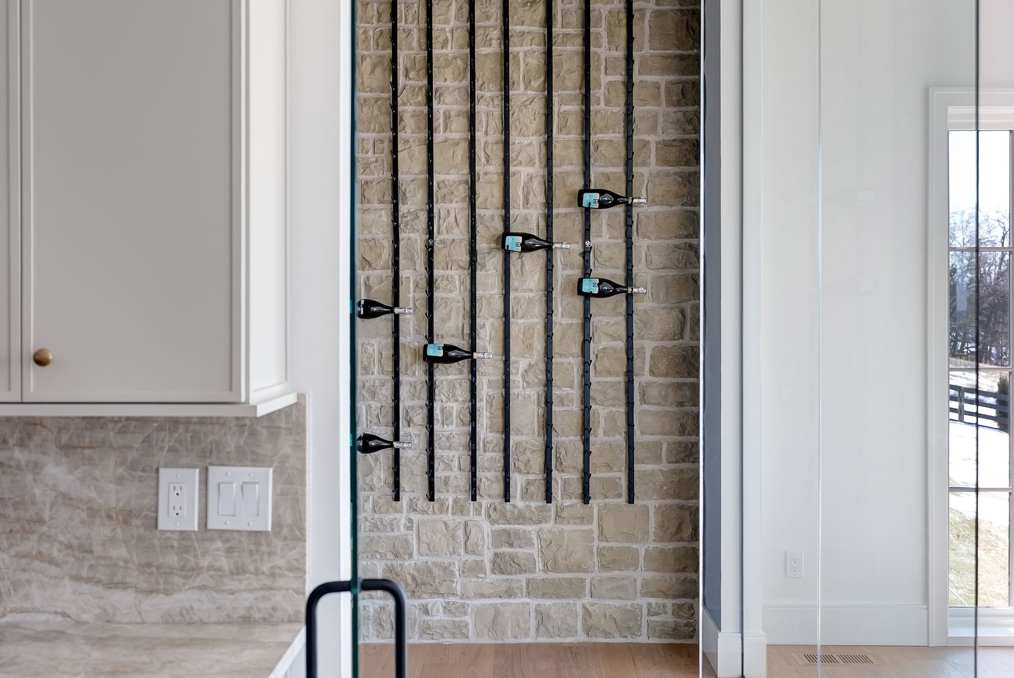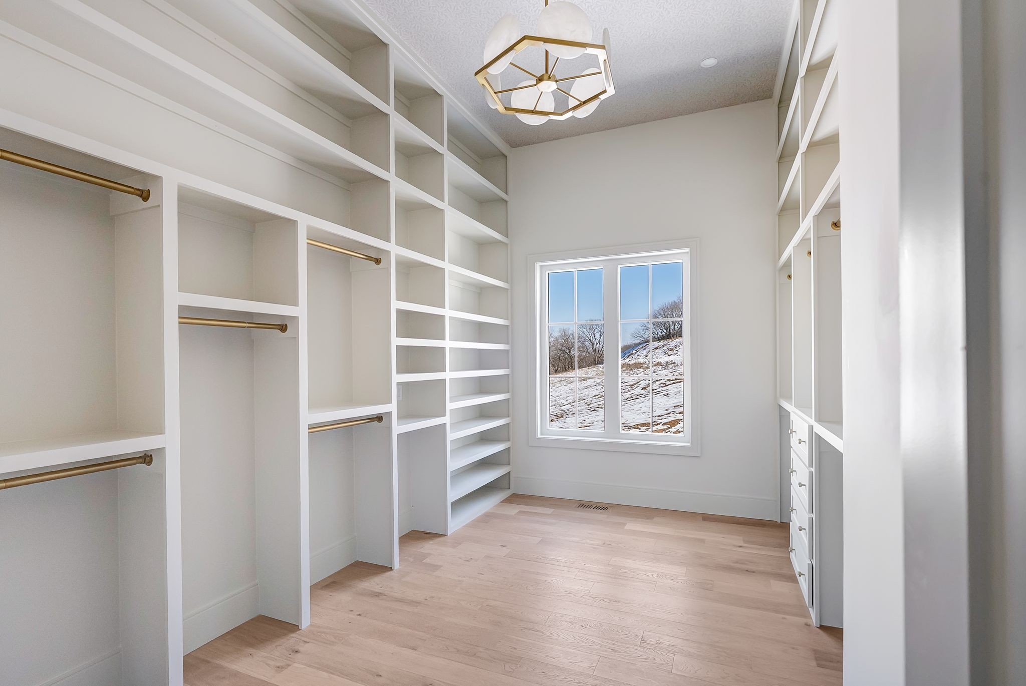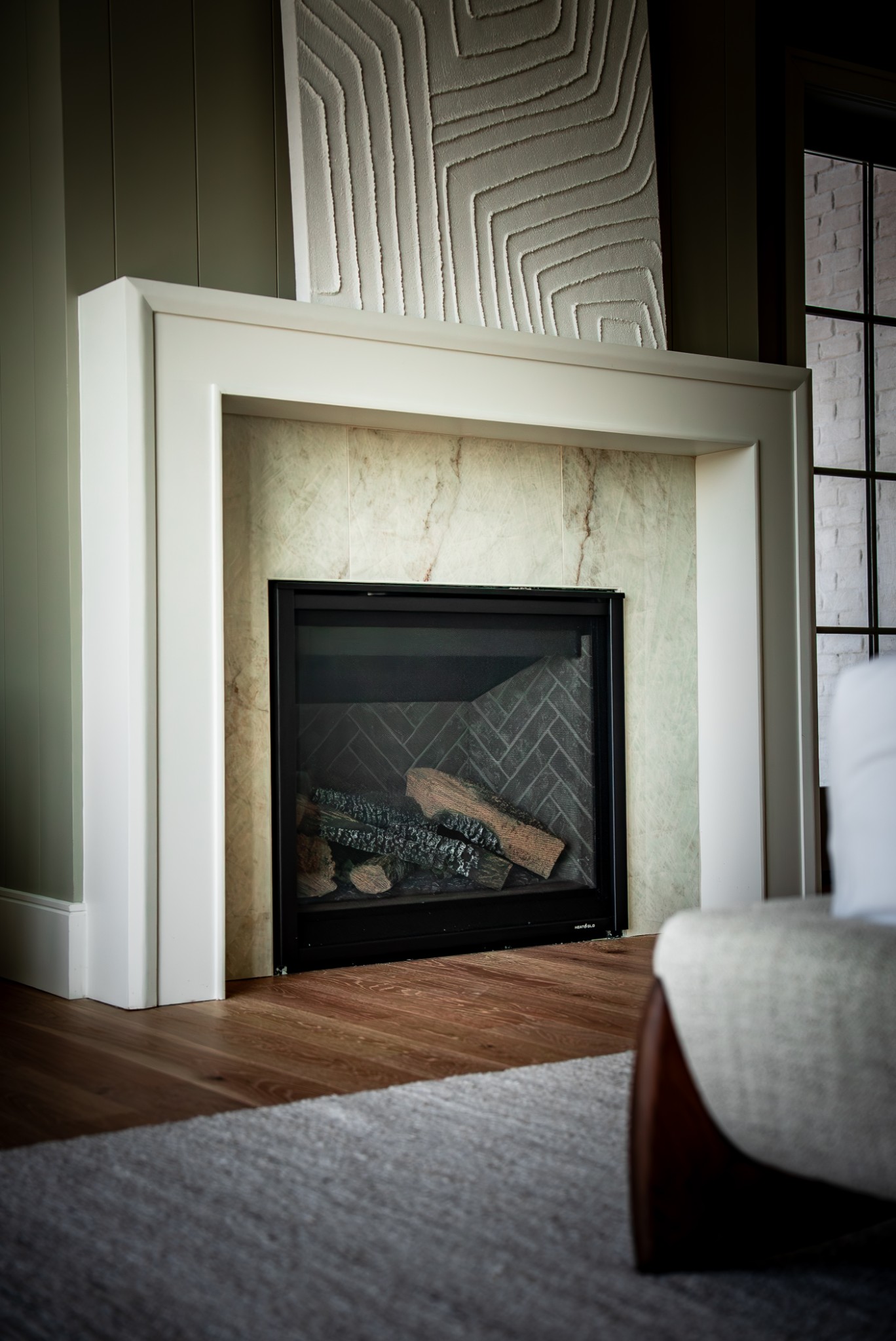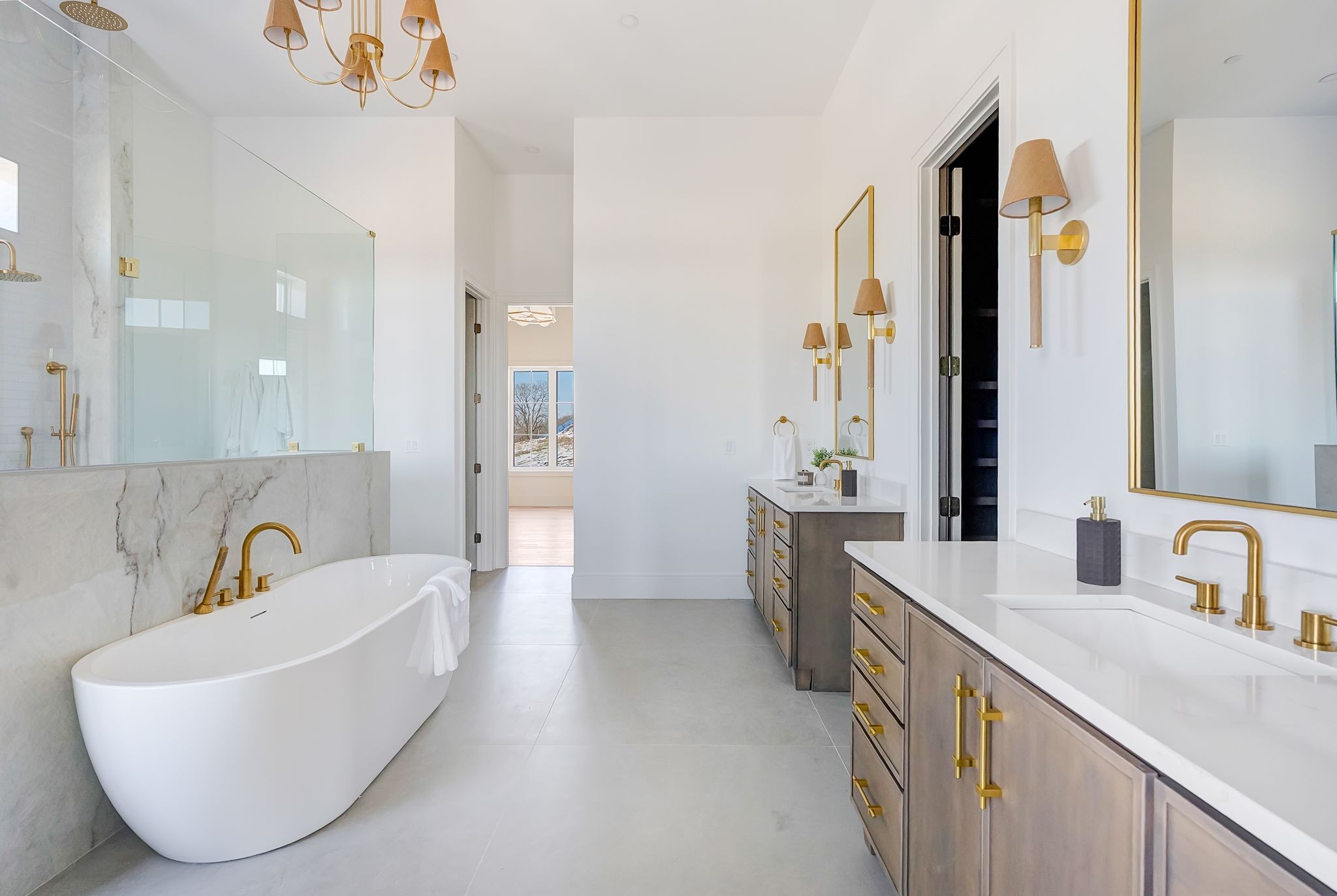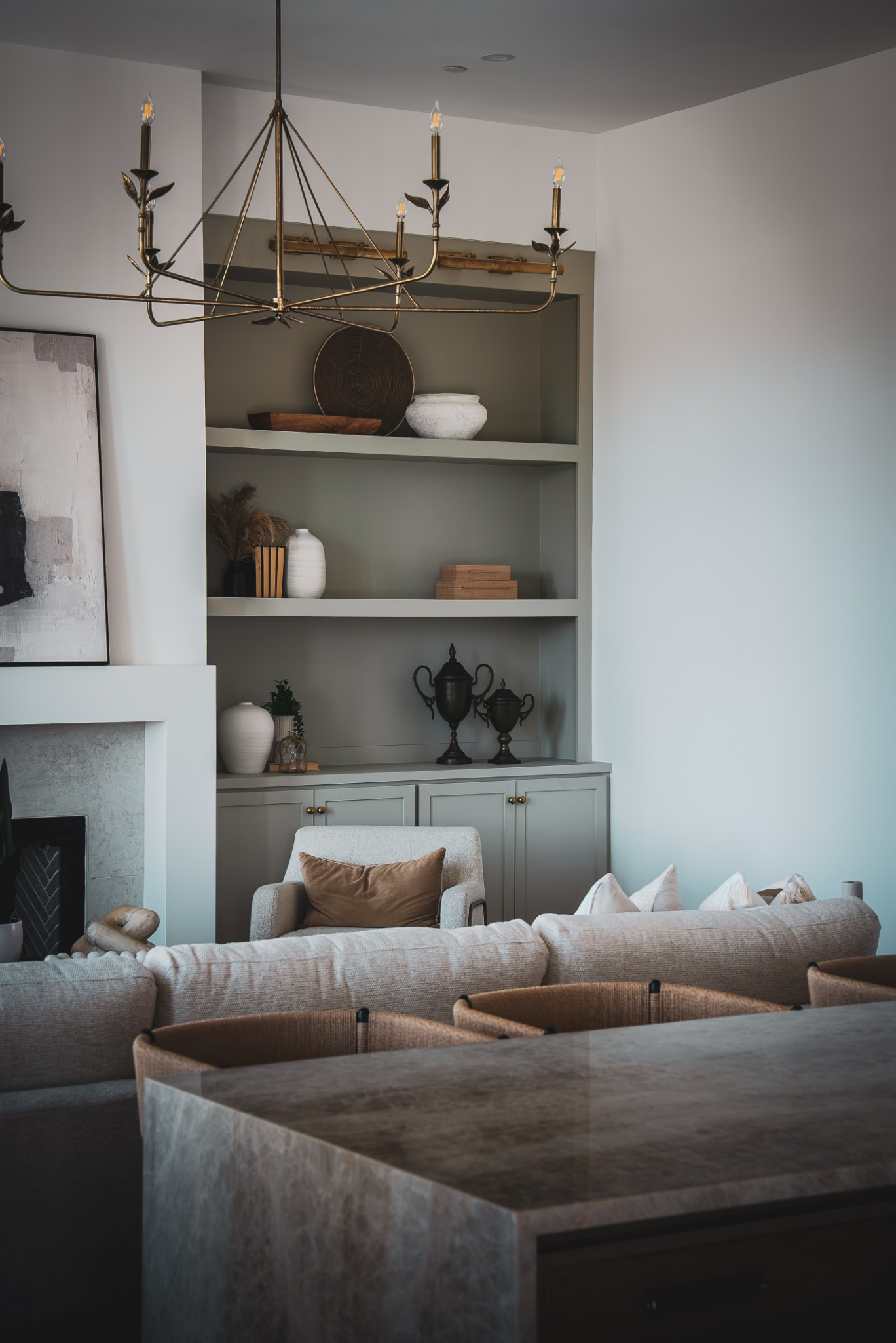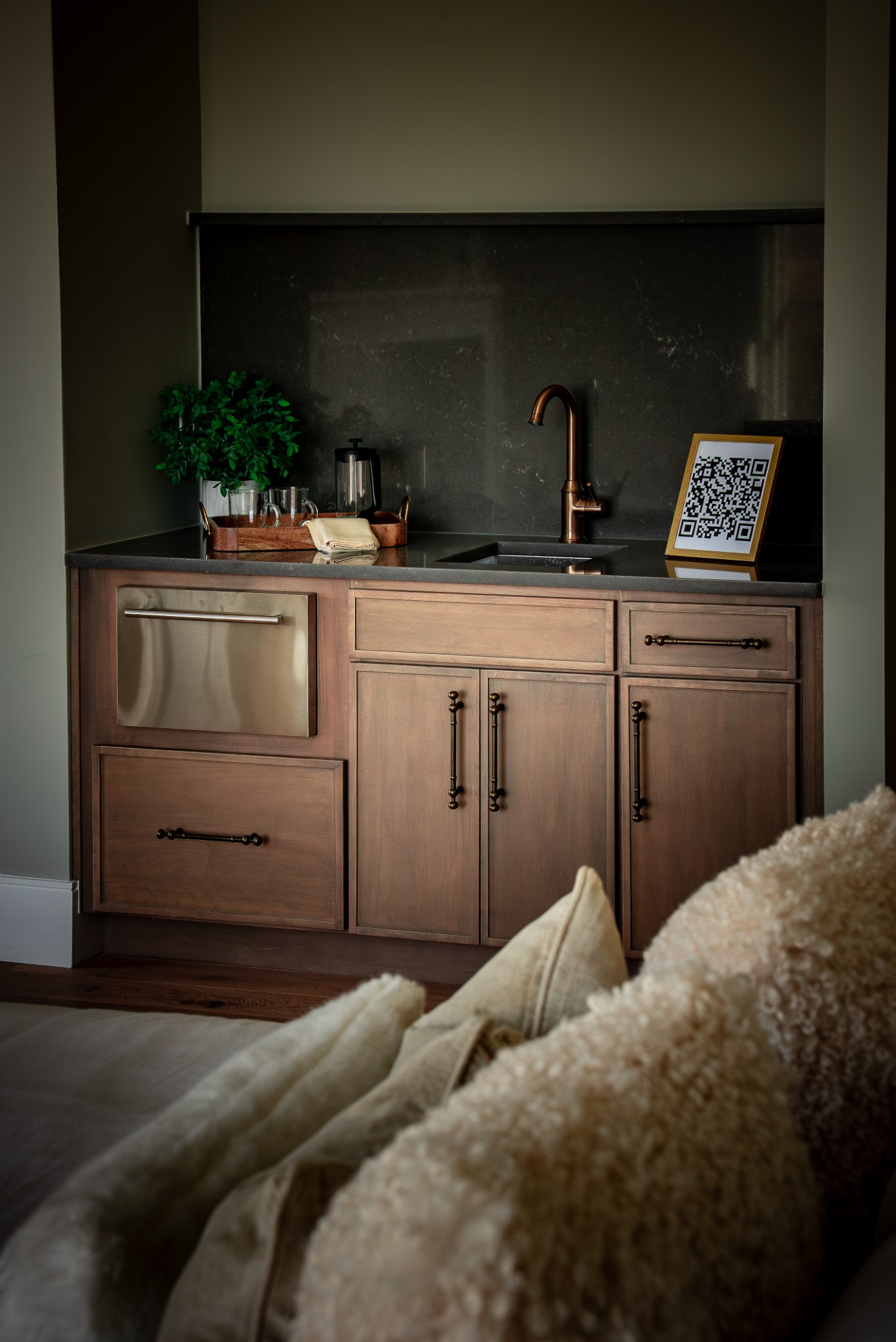 The Tudor-inspired exterior blends natural stone and brick selected to complement the landscape and capture warm sunset views. Inside, the home centers around a chef’s kitchen featuring a double-island layout designed for functionality, flow, and gathering. Fully panelized appliances maintain a seamless aesthetic while a full scullery with secondary kitchen allows for effortless entertaining while keeping the main space pristine.
