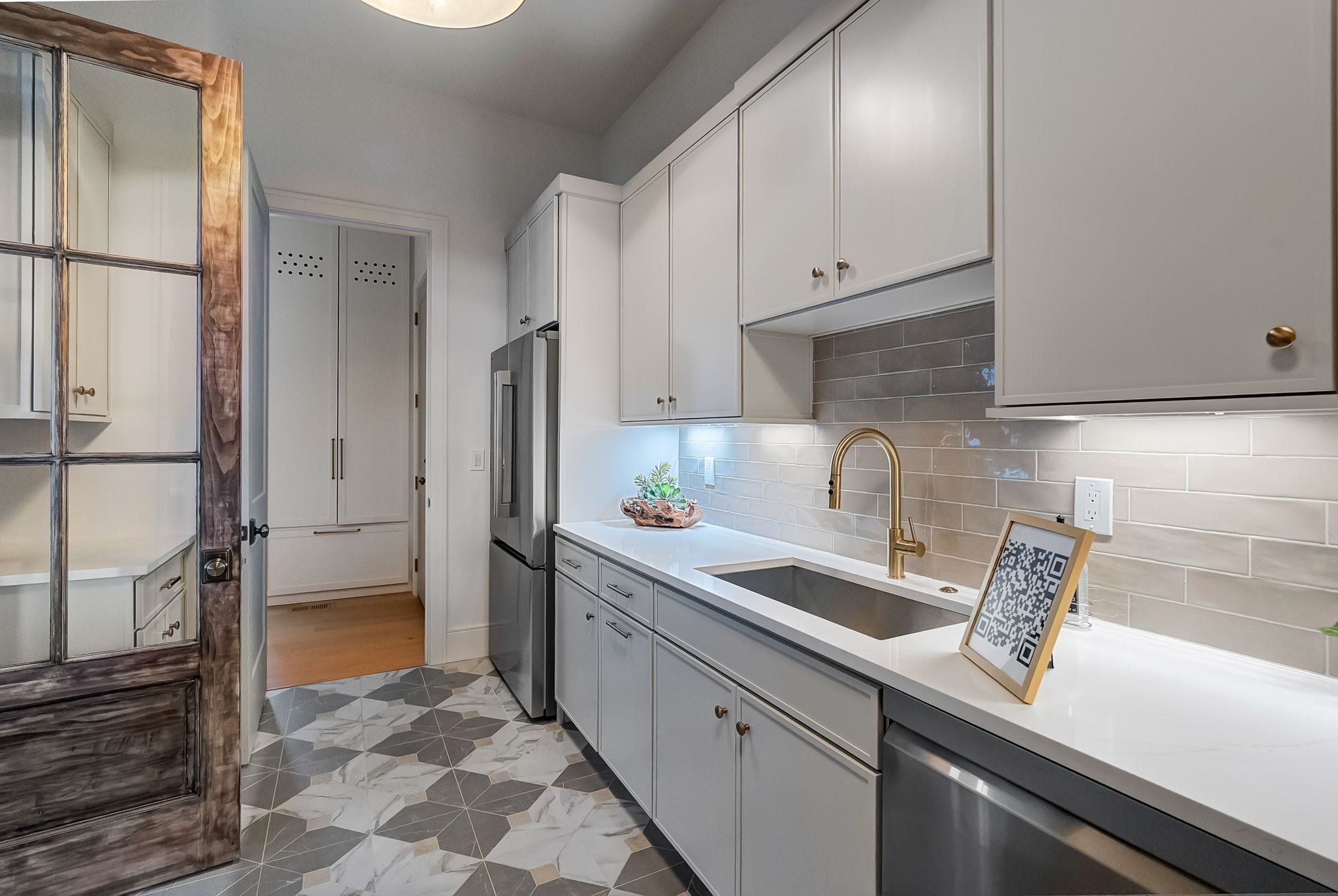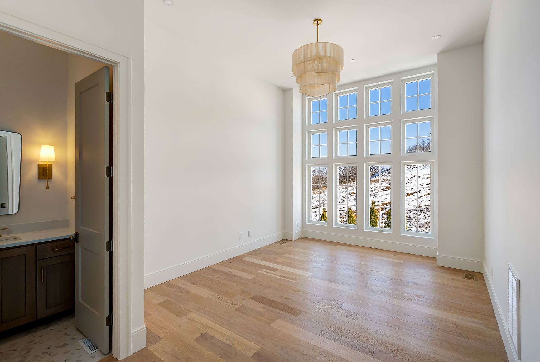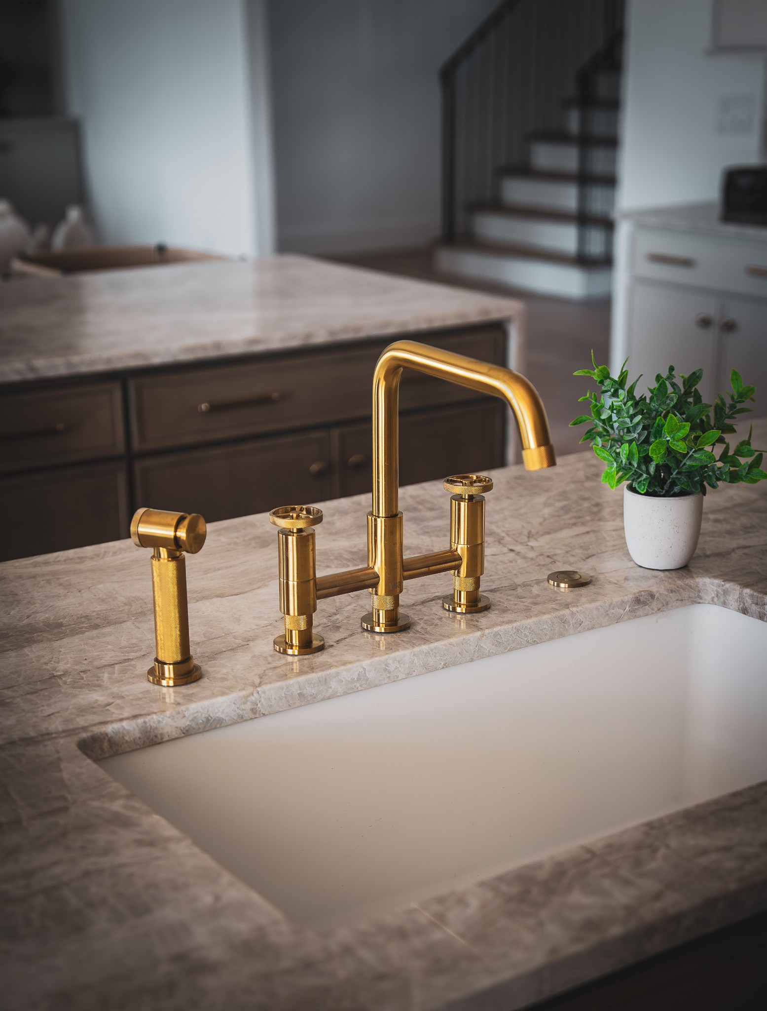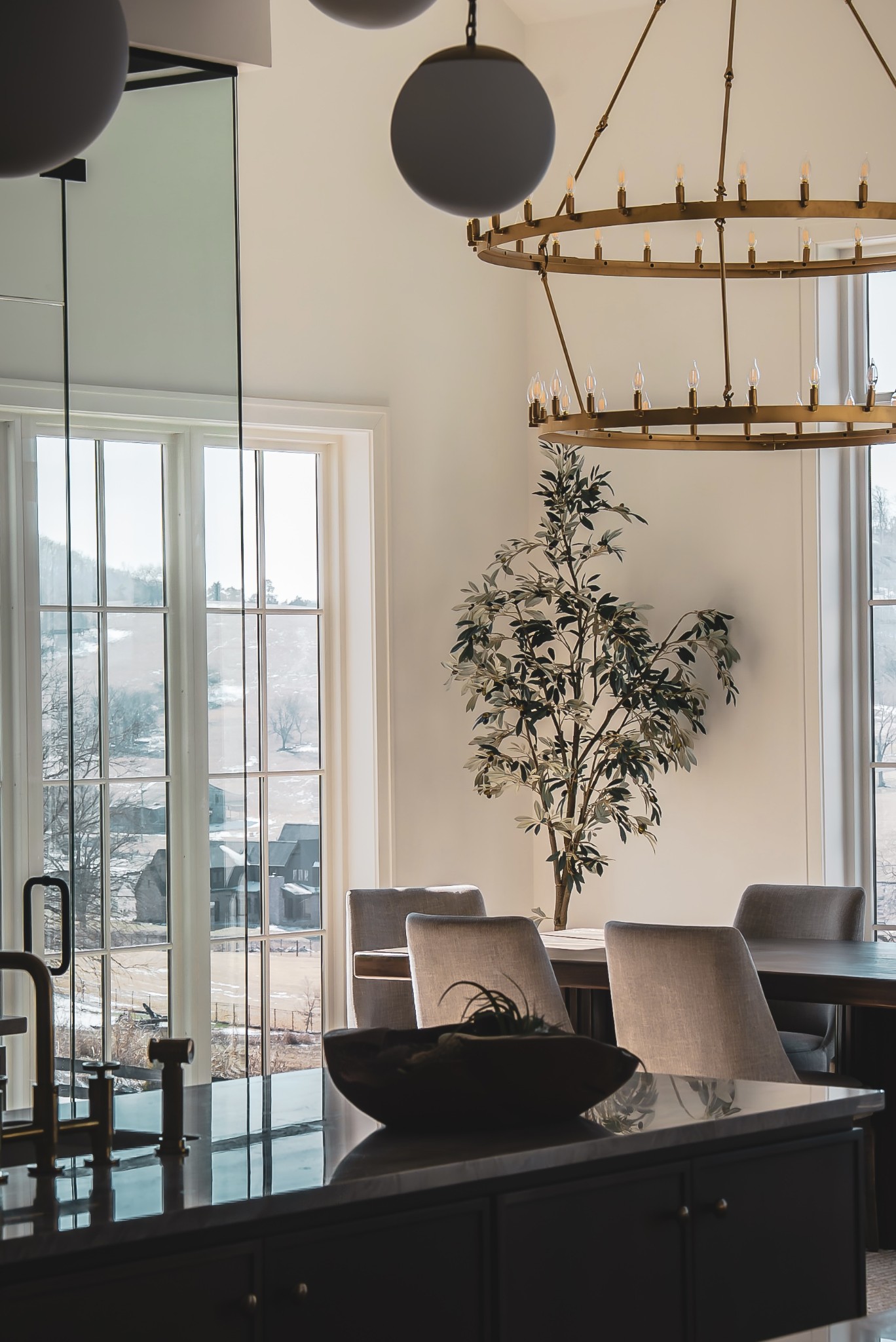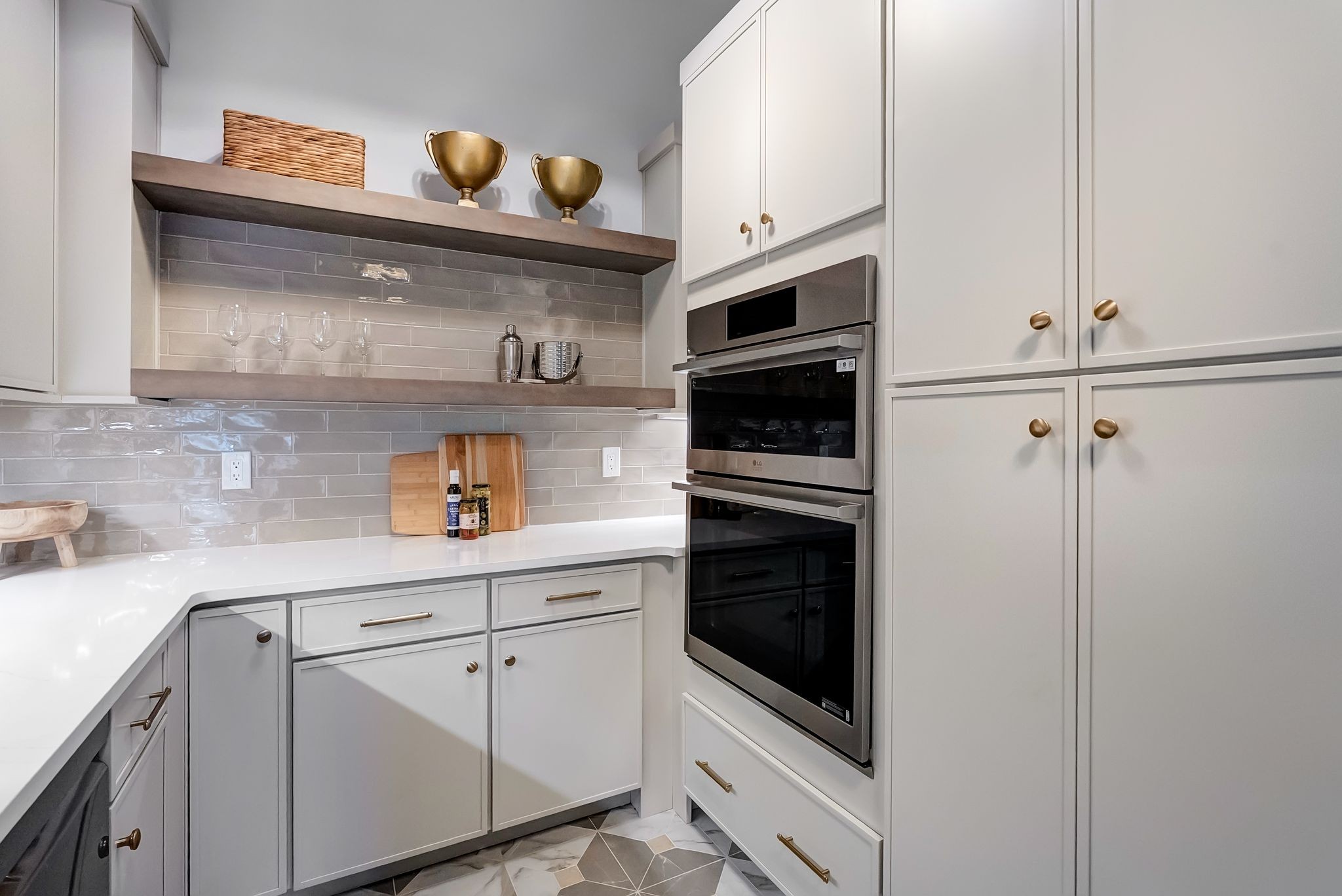 The Tudor-inspired exterior blends natural stone and brick selected to complement the landscape and capture warm sunset views. Inside, the home centers around a chef’s kitchen featuring a double-island layout designed for functionality, flow, and gathering. Fully panelized appliances maintain a seamless aesthetic while a full scullery with secondary kitchen allows for effortless entertaining while keeping the main space pristine.