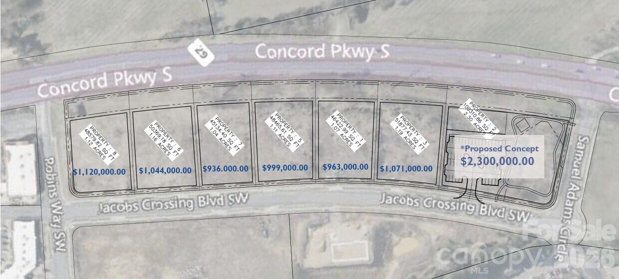 This 8.98 +/- acre tract offers over 1,000 feet of visibility on Concord Parkway (Hwy 29) and provides easy access off Jacobs Crossing Blvd, with multiple points of ingress/egress. This tract has infrastructure in place, five curb cuts, and can be subdivided. Ideal for medical, professional, retail, or special-purpose uses.