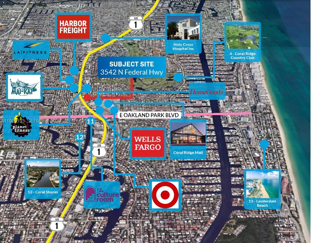 A rare opportunity to acquire a fully occupied retail/office flex property along one of Fort Lauderdale’s most prominent commercial corridors. Strategically positioned on US-1, the asset benefits from strong daily traffic counts, affluent surrounding demographics, and continued residential and mixed-use growth along the Federal Highway corridor. The property serves established neighborhoods including Coral Ridge, Imperial Point, and Coral Ridge Country Club Estates, providing a dense, high-income consumer base that supports sustained retail demand. Zoned B-1 (Community Business District), the site allows for a wide range of retail, office, medical, and service-oriented uses. With stable in-place income and projected upside to a pro forma NOI of $170,000, the property offers both immediate cash flow and long-term growth potential.
