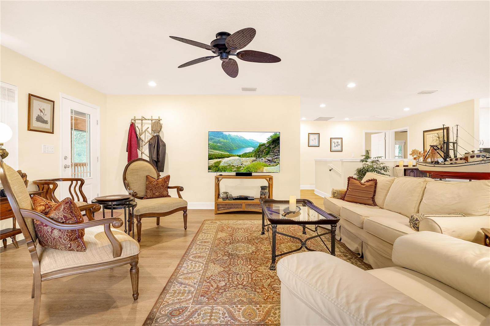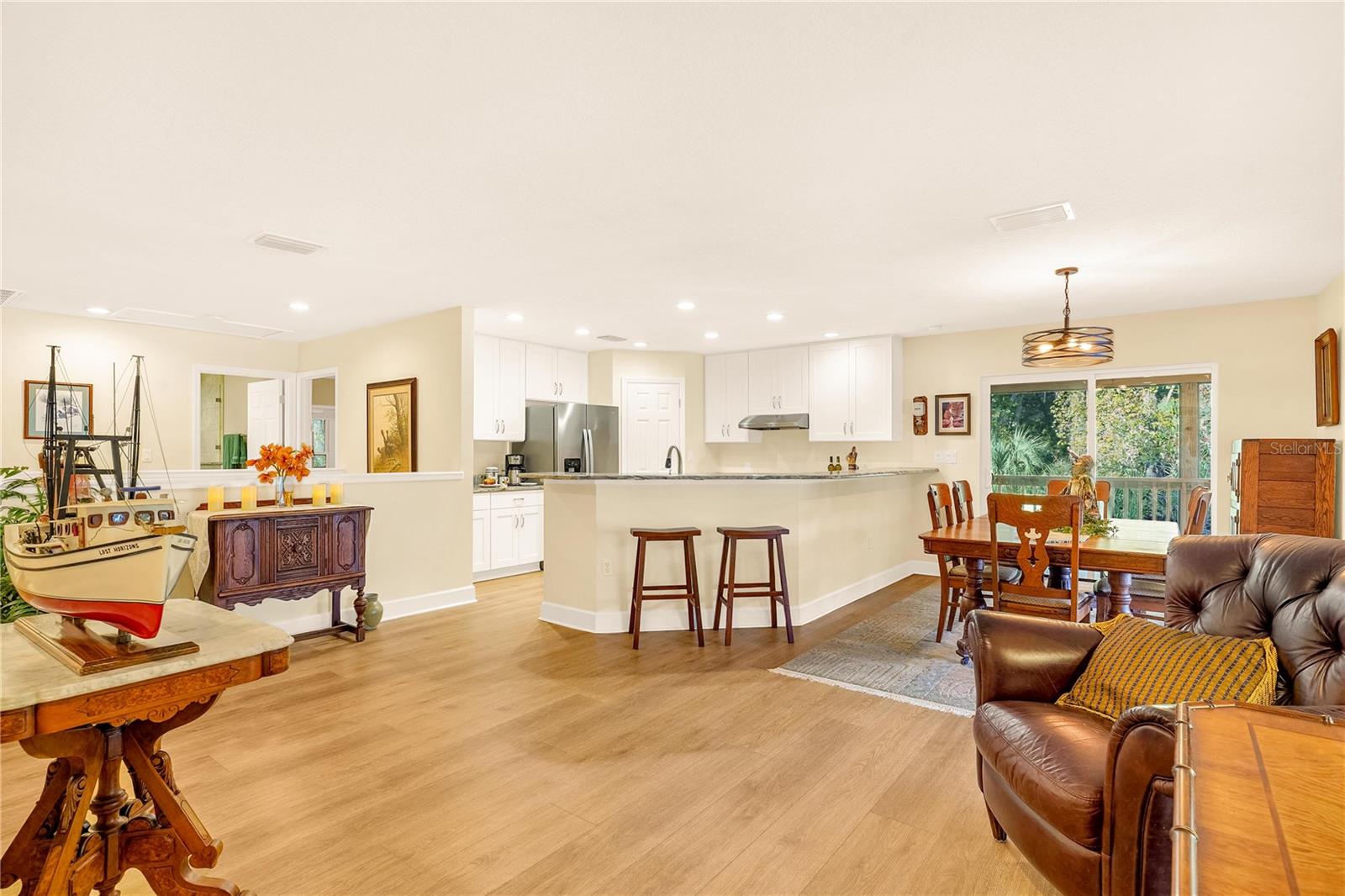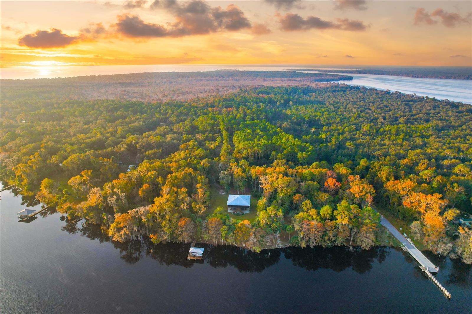 Experience exceptional riverfront living on this 6.37-acre retreat with 284 ft along the scenic St. Johns River. Set on two separately deeded, buildable waterfront lots, this meticulously maintained 2 bedroom, 2.5 bath residence offers uncommon privacy, long views, and a natural connection to the landscape. Designed to sit among the treetops, the home captures sweeping water and wooded vistas from 1,915 sq ft of interior space and 1,536 sq ft of wraparound screened porches. Offered turnkey furnished—including a 21’ center-console boat and trailer. The open great room features a gas fireplace and expansive river-facing sliders for seamless indoor-outdoor living. The kitchen includes hand-selected granite, abundant cabinetry, and a generous walk-in pantry. The primary suite opens to the porch and includes a large walk-in closet and dual-vanity bath with custom tile shower. The guest suite enjoys tranquil wooded views. Durable, low-maintenance features include elevated 2017 construction spray-foam insulated walk-able attic, an artesian well with clean reliable water, and a water softener system. Waterfront improvements include a concrete seawall, private dock, and a remote-controlled covered boat lift (5,000-lb capacity). Ground-level amenities include a mudroom with half bath, additional refrigerator, and functional storage. Outdoor features include a covered paver patio, fire pit, irrigated fenced garden, RV hookup, and custom 12×20 shed. Lawn and landscaping equipment, including a zero-turn mower, conveys. Located on historic Drayton Island, accessible by private vessel or county ferry, with direct boating access to Lake George and nearby freshwater springs. A covered mainland boat slip with lift and vehicle parking is also available. A rare opportunity for privacy, protected shoreline, and true riverfront living with ample room for expansion.