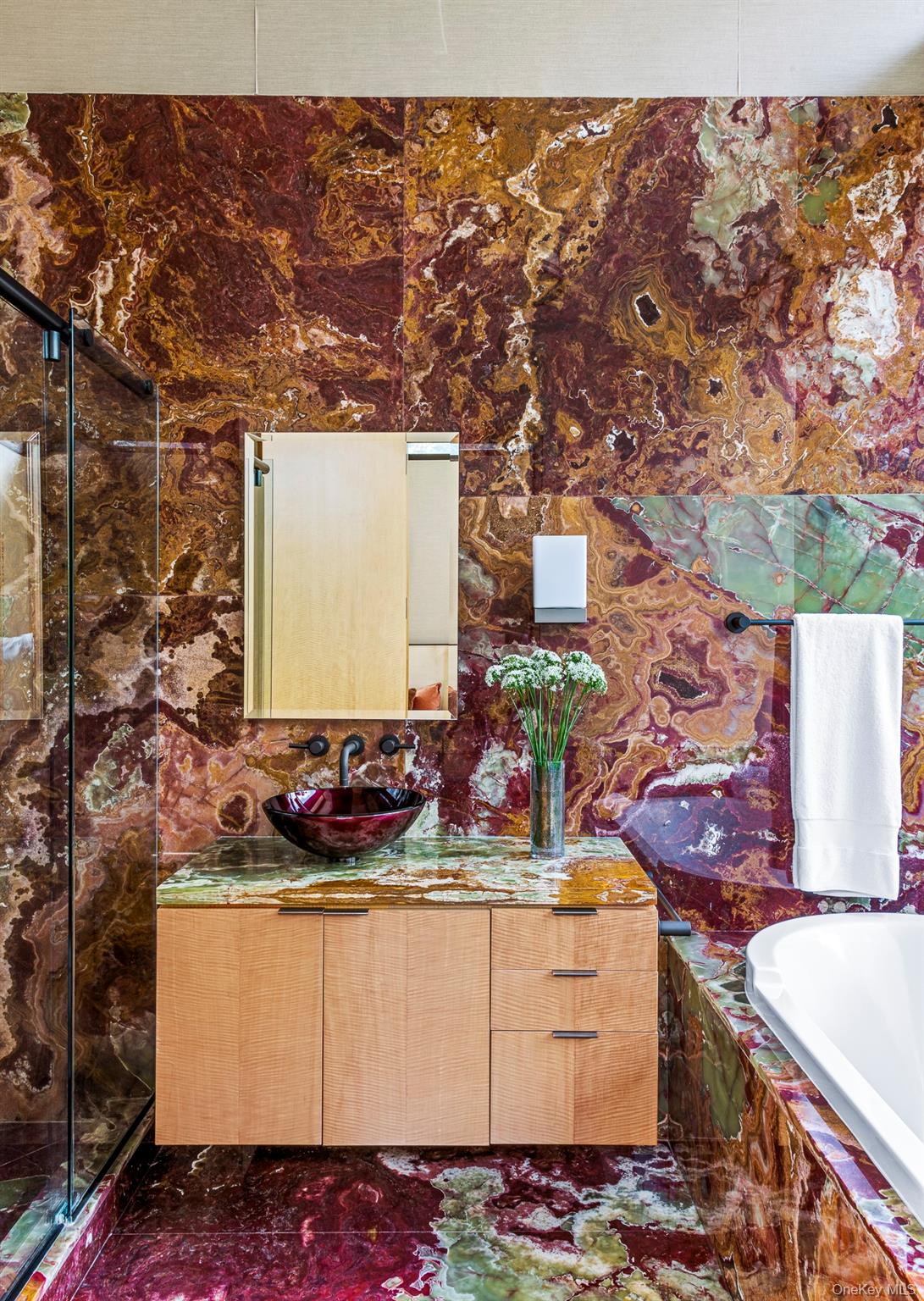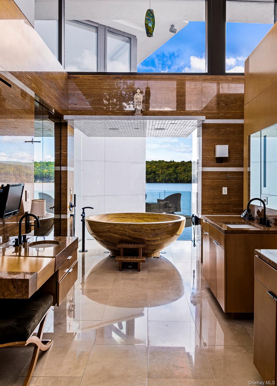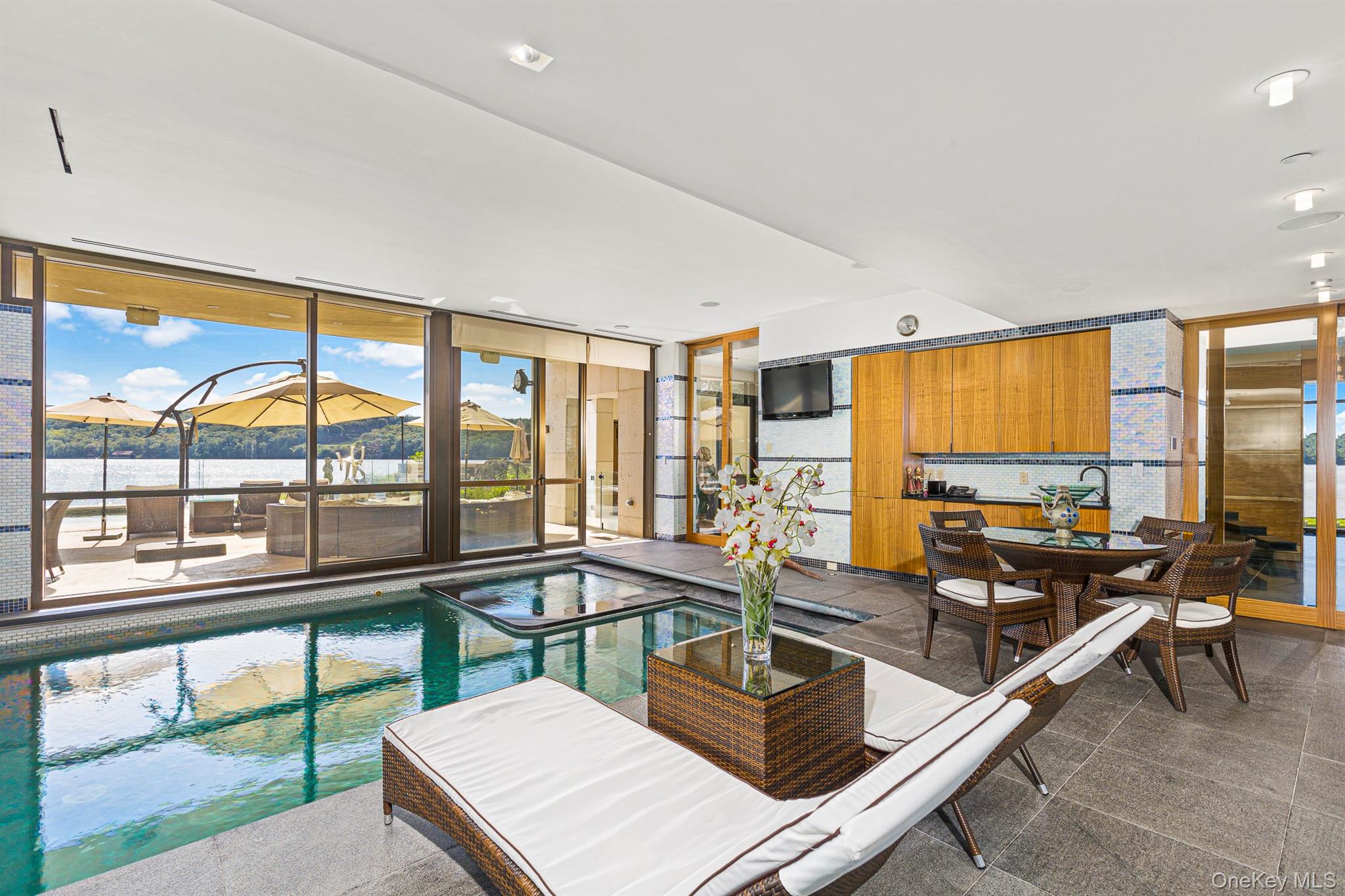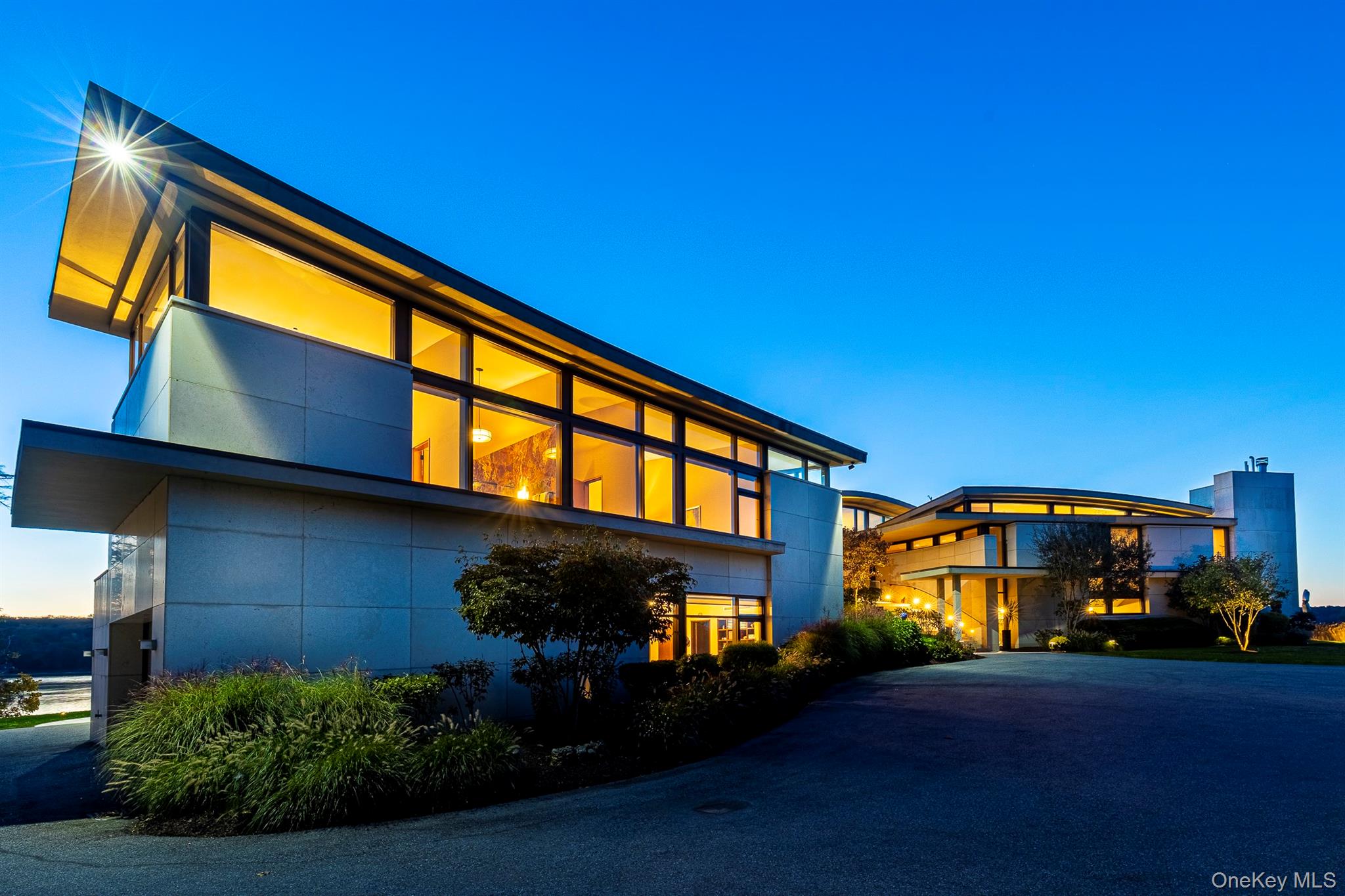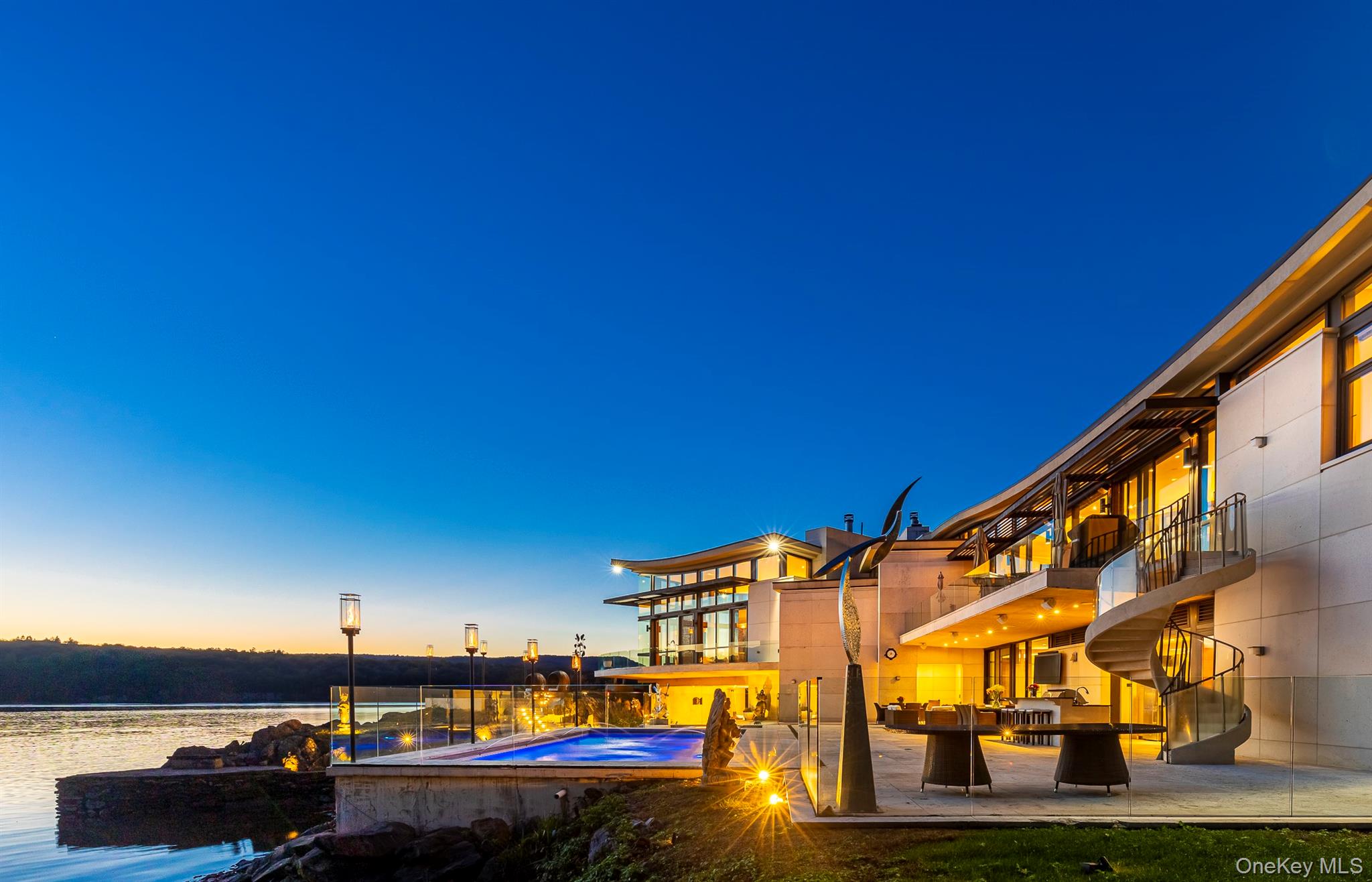 Ledgerock, the riverfront masterpiece by modern architect Lee Ledbetter is back on the market after undergoing significant infrastructure improvements. This one-of-a-kind estate offers the finest Hudson River and Catskill Mountain views on the market today and is set on 5 private acres. Constructed from the finest materials available, this gorgeous fossilized French limestone & glass compound boasts a 15,000+/- main residence offering 5 bedrooms and 7.5 bathroom plus a similarly styled guest house offering 3 bedrooms and 2 baths. Ledgerock is one of the very few properties built DIRECTLY on the Hudson River and can never be built again as current set-back laws prohibit building directly on the water’s edge. Modern lines combined with exotic wood & stone from around the world create a truly unique home designed to entertain both indoors and out. Interior features include a breathtaking, glass-walled great room with a fireplace, a formal dining room, library, billiard room, gym and & massive dine-in kitchen with separate butler’s pantry. The corner primary suite floats above the Hudson River like a houseboat and features an incomparable spa-like bathroom that includes two large dressing rooms and an office. Outside, there are two levels of travertine decks and terraces that extend from all major rooms offering jaw-dropping river and mountain views. Outdoor features include an infinity-edge saltwater pool, an elevated hot tub, fire-pit, an outdoor kitchen and a covered open-air living room. Updated mechanicals include geothermal heating/cooling, radiant heated stone floors, and state of the art security and ample indoor parking to satisfy a collector. Ledgerock is one of the most extraordinary homes available in the Hudson Valley.