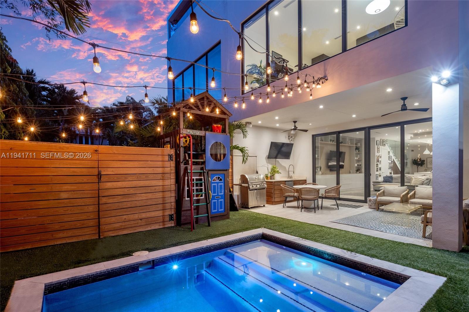 Welcome to this customized, exquisite 2019-built 4-bedroom, 3.5-bath townhouse just steps from CocoWalk in the heart of Coconut Grove. Spanning nearly 3,000 interior square feet, this modern residence features porcelain faux-wood floors, custom millwork, recessed lighting, and expansive open living areas designed for both everyday comfort and entertaining. The chef’s kitchen is outfitted with top-of-the-line Bosch appliances, including a gas stove, wall oven, wine cooler, refrigerator, freezer, Wi-Fi-enabled in-cabinet coffee maker, and an oversized island that serves as the home’s centerpiece. The primary suite offers a tranquil retreat with floor-to-ceiling windows and a spa-like bath featuring a smart Toto toilet and an oversized multi-head shower. Bedrooms 2 and 3 are connected by a Jack-and-Jill bathroom, and Bedroom 4 functions as a private guest suite with its own ensuite bathroom. All bedrooms feature custom-built closets for exceptional storage. Outdoors, enjoy a custom made salt water chlorine heated pool, summer kitchen including a gas-powered grill, outdoor shower, and a custom children's play fort ideal for entertaining or family gatherings. The expansive rooftop deck - complete with a second summer kitchen including a gas-powered grill, sink, multiple beverage coolers, and more - offers stunning views of downtown Coconut Grove and Biscayne Bay and a blank canvas to create your ultimate rooftop oasis in one of South Florida’s most desirable neighborhoods.