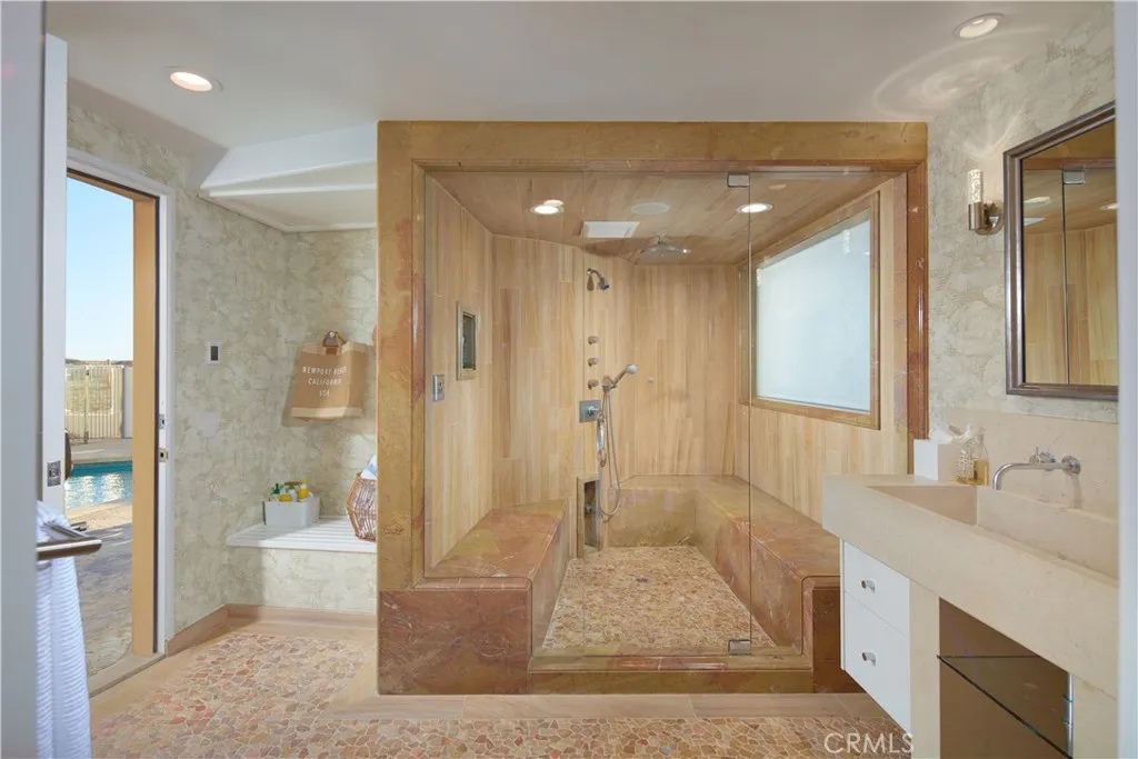 Directly on the sand in Newport Beachs prized Peninsula Point enclave, this phenomenal architectural showplace offers panoramic views, enviable privacy, and a virtually endless list of luxurious amenities. From the artistic mind of architect Michael Kollin, a main home and detached guest house with a total of 7 bedrooms and 10.5 baths in approximately 7,083 square feet occupy a rare double lot with 80 feet of beach frontage and no boardwalk infringing on privacy. A magnificent double-height foyer with a floating circular staircase and a domed skylight welcomes you into the residence, which has been featured in print and on TV. Emphasizing the homes upscale modern aesthetic, a remodeled kitchen showcases a large island and separate peninsula bar, stone countertops with a full tile backsplash, a walk-in pantry, sleek white cabinetry, and stainless steel appliances, including a five-burner Wolf gas cooktop, Dacor double wall oven, Bosch dishwasher, and built-in Sub-Zero refrigerator. The kitchen flows seamlessly to a spacious dining room and family room, where sliding glass pocket doors open to the beachfront patio. Impressive entertaining is easy in the lower levels bar and media lounge, which is highlighted by a massive 12-foot by 4-foot saltwater aquarium that offers underwater views of the pool. Comprising the entire oceanfront side of the second level, the primary suite is a sanctuary unto itself, complete with a view-enhanced sitting room with fireplace, a private view balcony, lofty barrel ceiling, and walk-in closet. The primary bath is illuminated by a large skylight
