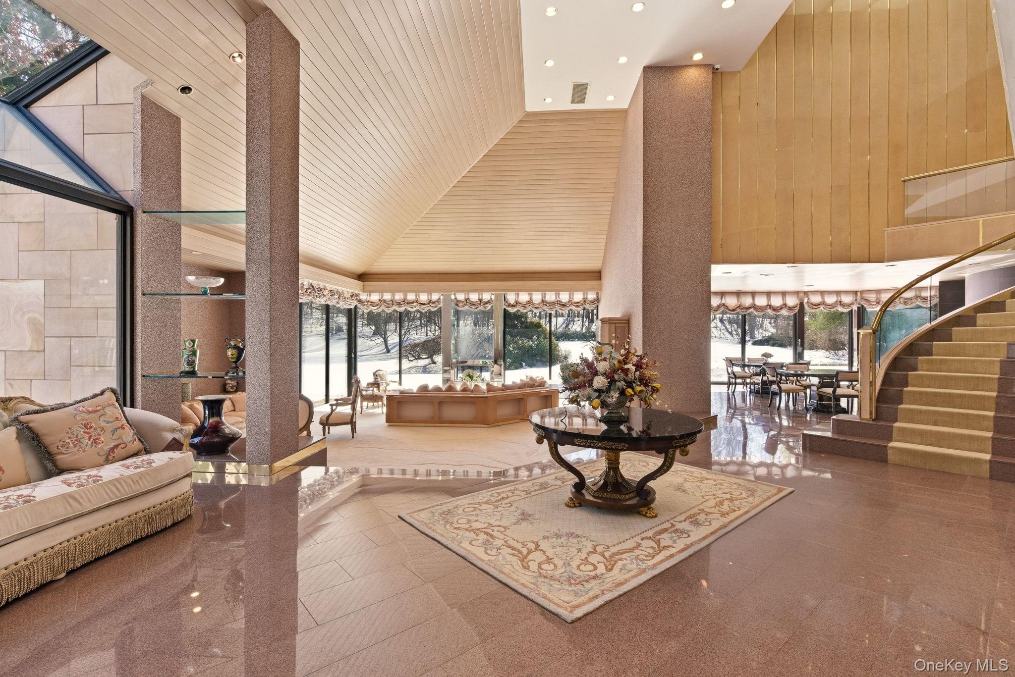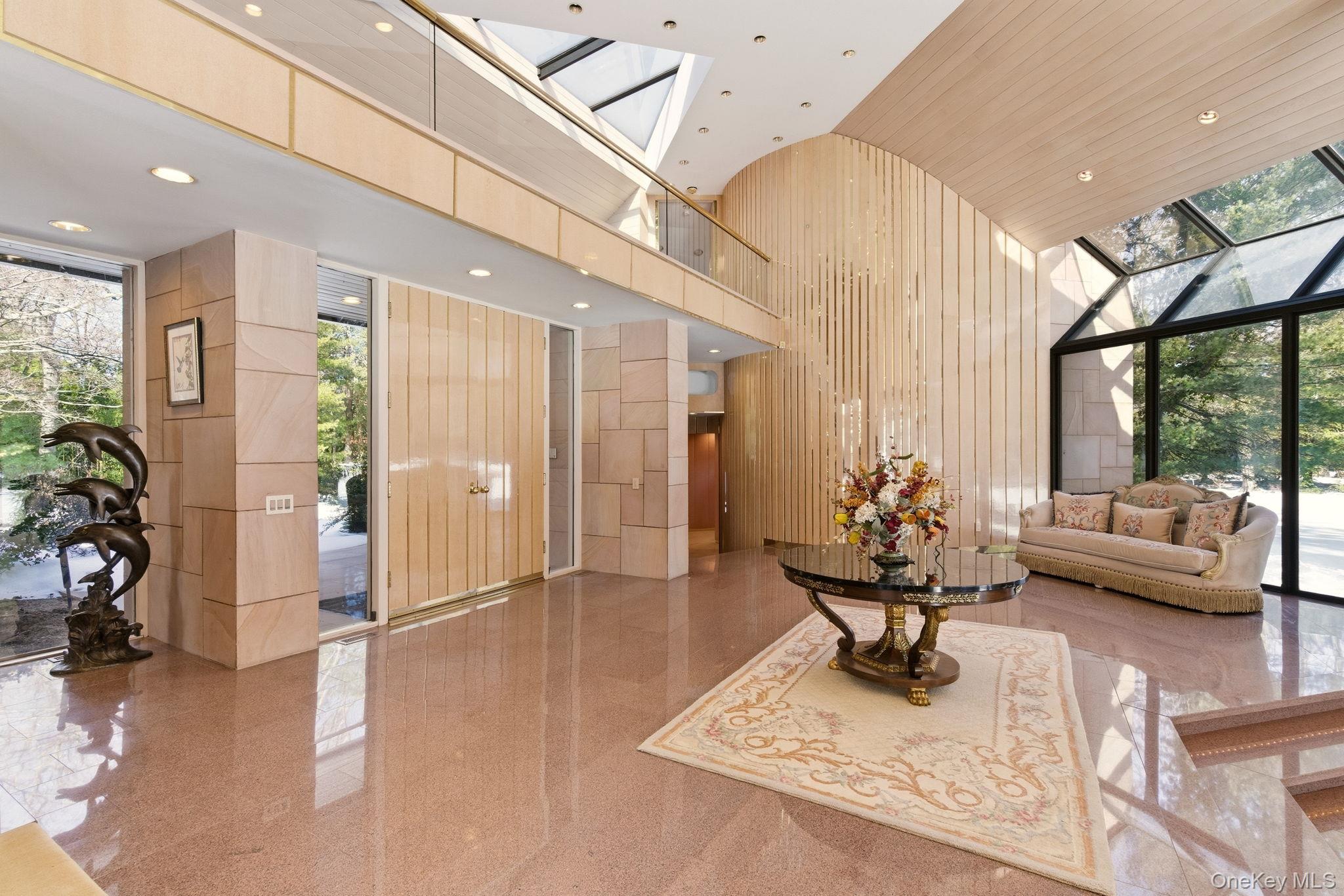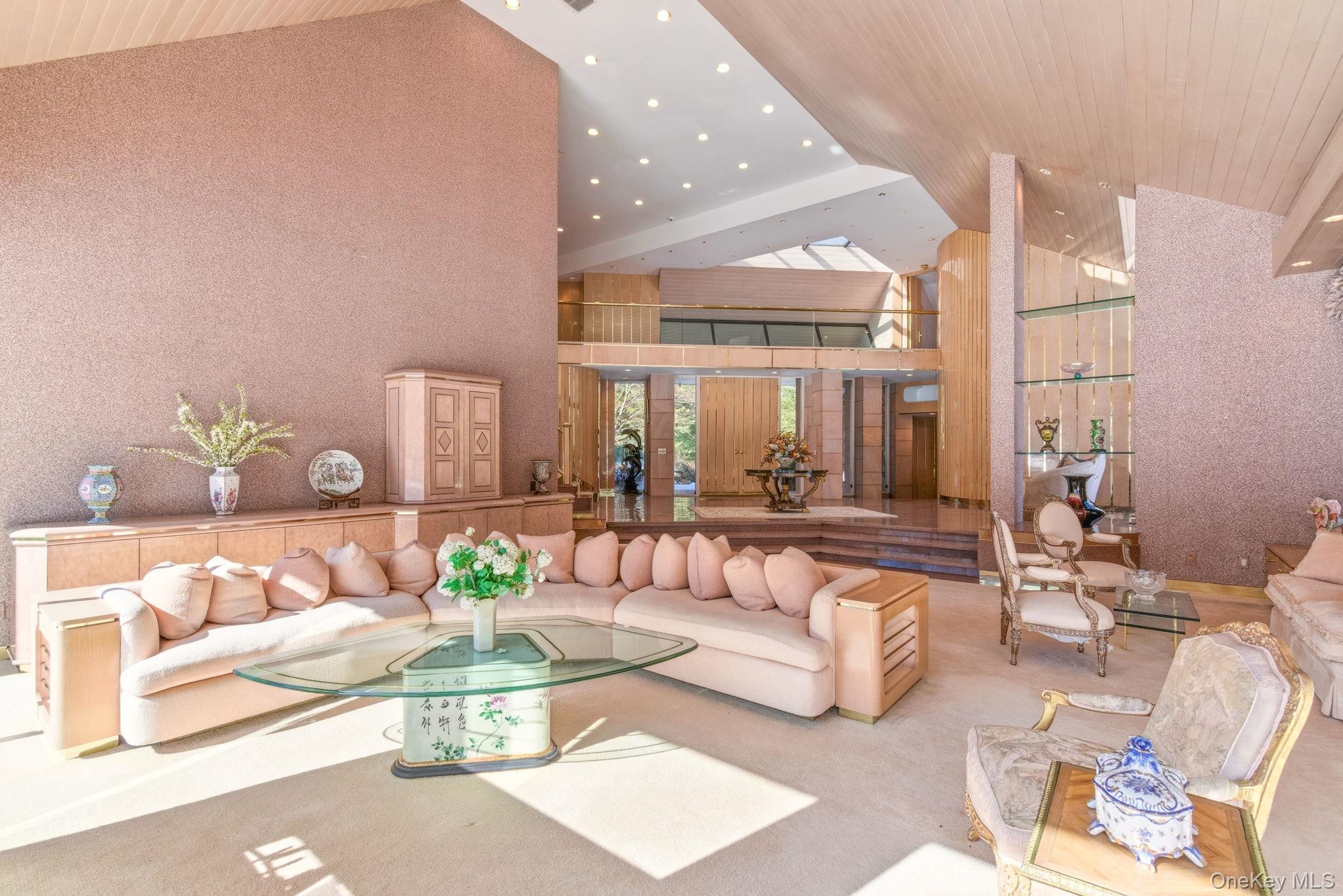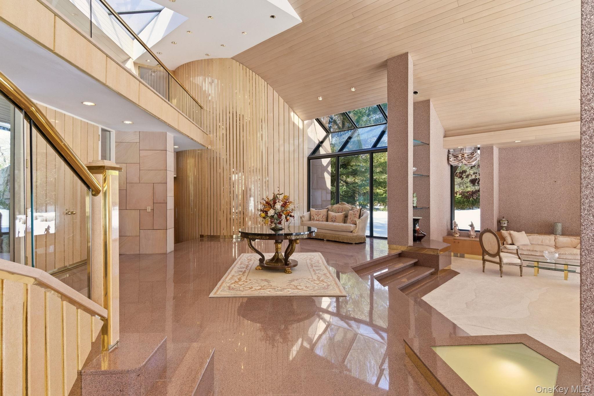 A long private drive leads you to an extraordinary 8000 + square foot classic contemporary estate set on over six pristine level park like acres in the prestigious village of Old Westbury. This one-of-a-kind residence offers a slate roof and copper entry doors, 6 gracious ensuite bedrooms and eight luxurious baths seamlessly blending architectural grandeur and timeless elegance. The impressive entry foyer opens to a dramatic formal living room featuring a 30 foot soaring ceiling, walls of floor to ceiling glass, and a striking glass fireplace creating a breathtaking setting filled with natural light. An impressive formal dining room provides the perfect backdrop for elegant entertaining on a grand scale. The expansive chef's kitchen features a generous center island with gas burners, slate roof, custom wood cabinetry, and stainless-steel appliances. The kitchen opens seamlessly to a sun-filled breakfast area plus an inviting den, creating an ideal space for both everyday living and entertaining. Also on this level are private guest quarters with private entrance, offering an ensuite bedroom, office, and additional half bath, perfect for extended stays or work-from-home flexibility. A serene primary marble suite is a luxurious private oasis featuring an expansive spa-like marble bath and 2 designer walk in closets. It also includes a sauna and private office, for the ultimate retreat. The second floor features an expansive sun-drenched landing that leads to three generously-sized ensuite bedrooms with access to a shared balcony. This level also provides access to the primary suite’s private sauna and Home Office, both offering serene, picturesque views of the beautiful, manicured estate. The resort-style lower level is designed for ultimate wellness and entertainment. Features include a state-of-the-art fitness center with a private sauna, custom 2-tier home theatre, temperature-controlled wine cellar, and a full-service bar. The expansive recreation area offers billiards and table tennis, while a dedicated entertainment studio includes professional karaoke equipment, pull down screen, mirrored dance floor, and a ballet barre. An exceptional space for both relaxation and hosting at the highest level. Encompassing 6 acres of exquisitely landscaped grounds, this remarkable property features a stunning stone and glass pool house, pool, and a professional Har-tru tennis court, creating a resort caliber experience. Three car attached garage. Jericho schools. Old Westbury is perfectly located on the North Shore of Long Island's Gold Coast, offering riding trails, the Meadowbrook Polo Club, prestigious country clubs, and in close proximity to the Americana Shopping Center, known for world-class shopping and fine dining. Nearby, the renowned Old Westbury Gardens offers beautiful grounds and cultural experiences. This home is half-way to the Hamptons and only 30 min to Manhattan, offering the best of both worlds.