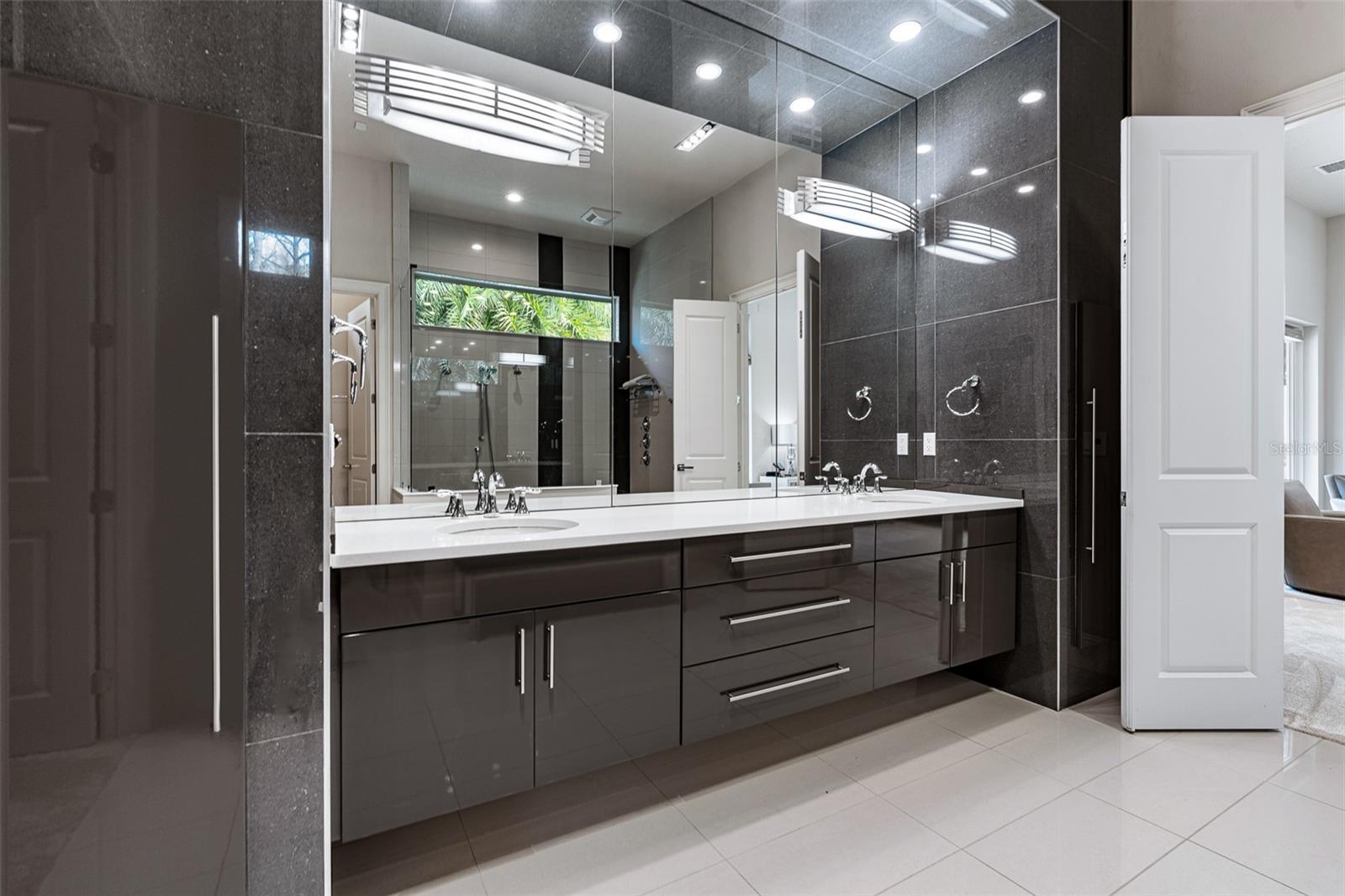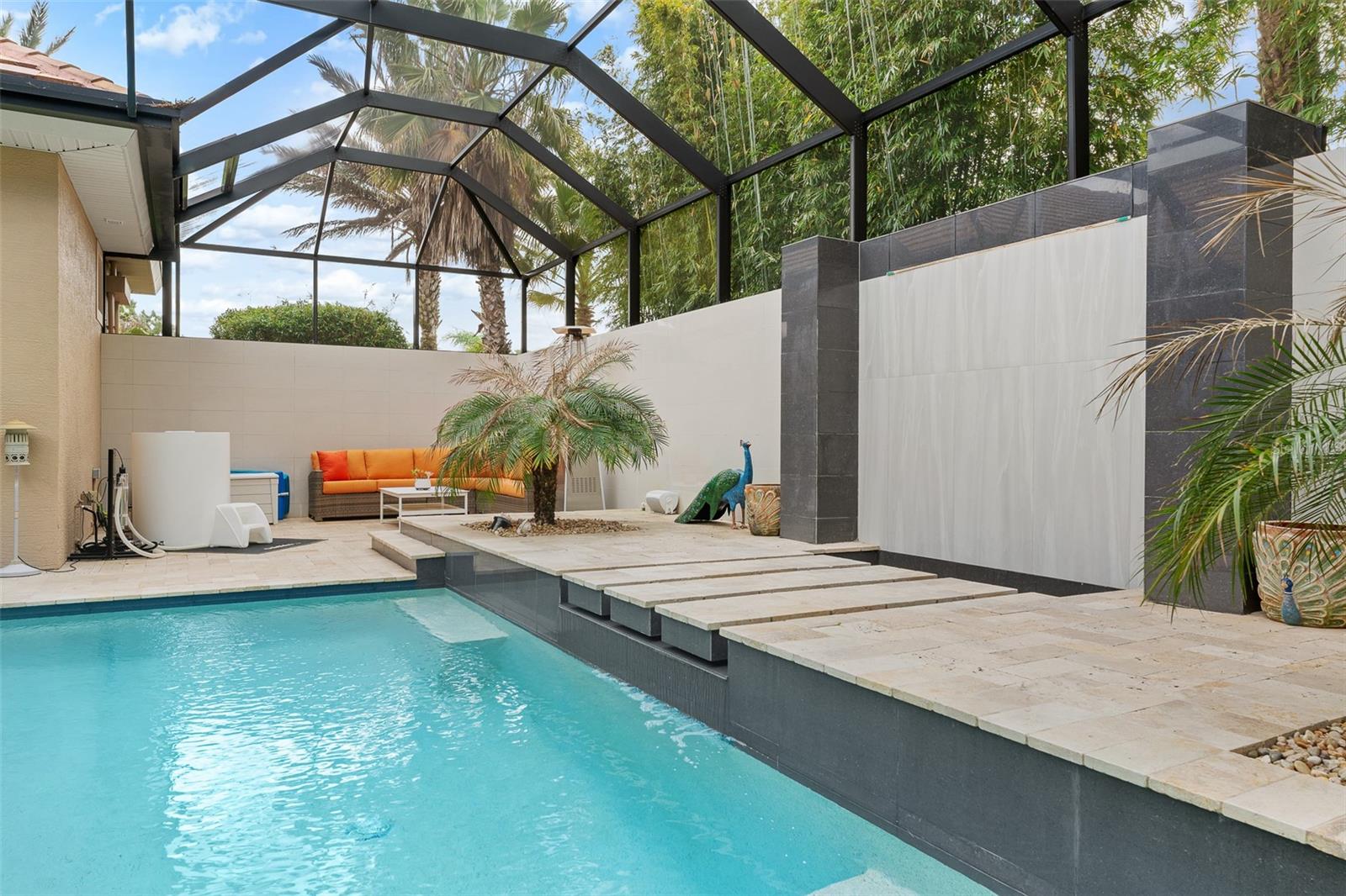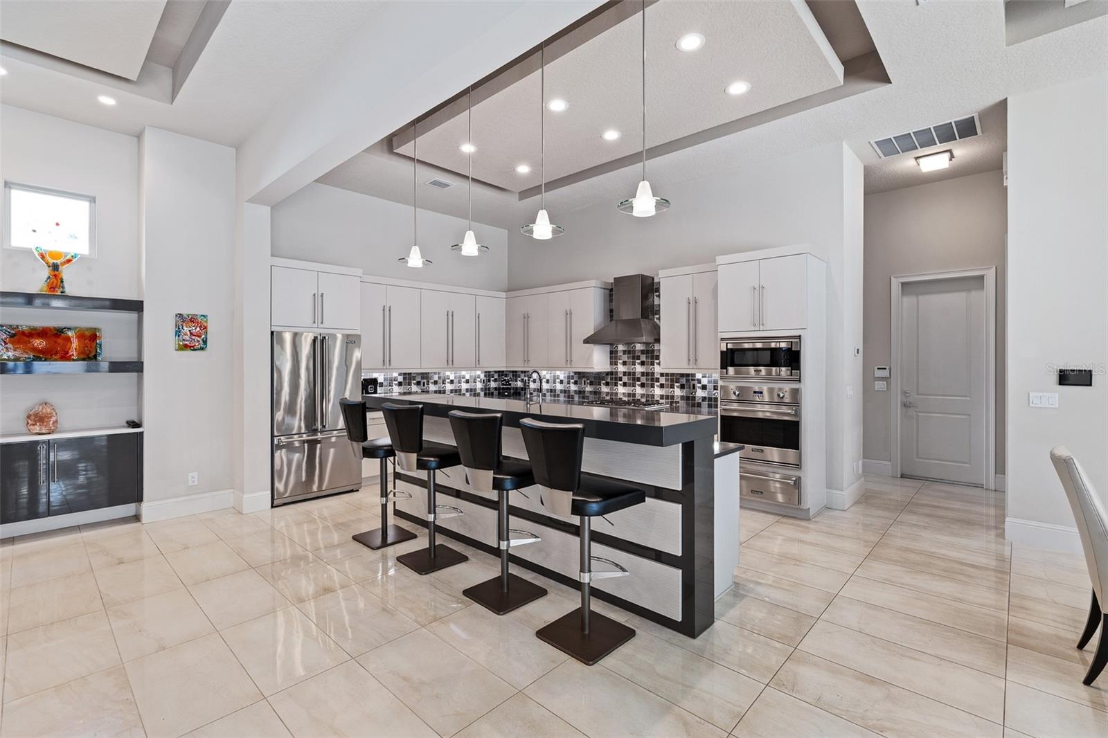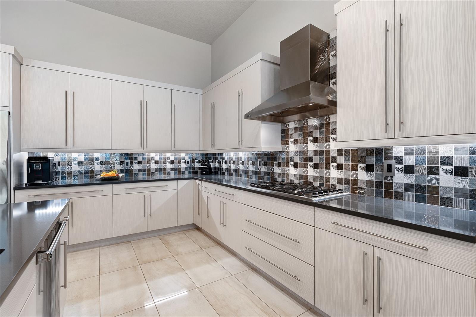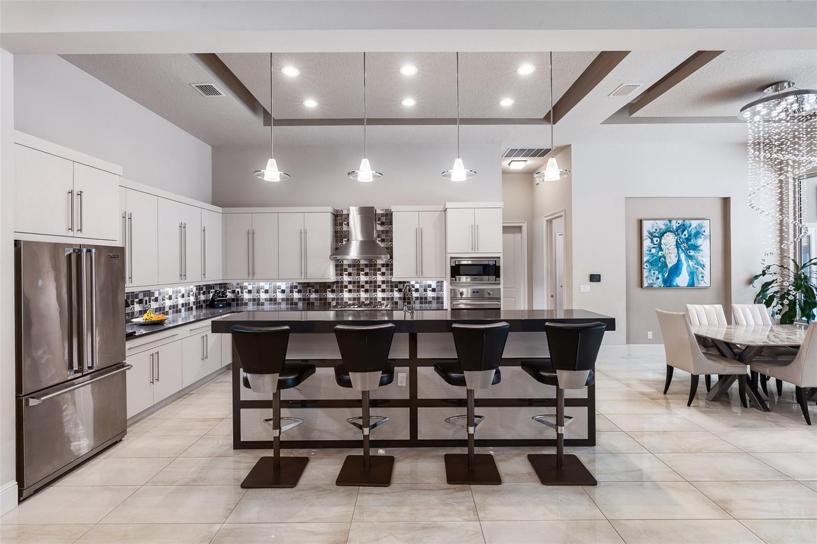 Welcome to 410 Wingspan Drive, a custom luxury courtyard estate in the private Woodbridge Estates of Plantation Bay Golf & Country Club. Built by renowned Kargar Construction Group, this energy-efficient home combines craftsmanship, smart home technology and resort-style outdoor living on a private preserve lot. Guests enter through double glass doors with electronic locks and wireless doorbell into a grand foyer with polished porcelain floors and crystal chandelier. The family room, the heart of the home, features porcelain floors, a floating tray ceiling with LED accent lighting, and custom built-in cabinetry with floating shelves. Four 10-foot sliding glass doors open to the lanai, creating seamless indoor-outdoor living. The chef's kitchen offers Cambria quartz countertops, mosaic tile backsplash, all-wood cabinetry with soft-close drawers, and an elevated island with breakfast bar. A premium Viking appliance package (Series 3 with Series 5 cooktop) includes refrigerator, dishwasher, oven, range/cooktop, gas hood, warming drawer and microwave. The dining room is highlighted by a crystal chandelier and oversized windows overlooking the pool. The owner's retreat features new carpet, tray ceilings to 13 feet, and glass doors overlooking the pool. The spa-inspired bath offers a tiled feature wall, oversized walk-in shower with three shower heads and pebble tile flooring, double quartz vanities, mirror accents, hidden storage towers, private water closet, and custom walk-in closet. Bedroom two, currently a gym, has newer carpet and shares a bath with custom vanity and tiled shower. Bedroom three enjoys pool views and an en-suite bath, while the private casita (bedroom four) offers tile floors, tinted windows, walk-in closet, en-suite bath, and doors to the pool courtyard. Laundry includes built-in cabinetry, sink, and extended counter space. The outdoor space features a saltwater solar-heated pool with waterfall wall, chemical-free heated Jacuzzi, French-pattern travertine lanai with multiple covered seating areas, sunbathing spaces, and outdoor kitchen with Blaze grill, sink, and refrigerator. Beyond the courtyard, a fenced area backs to a deep preserve with sunset views. The oversized garage has 10-foot ceilings, storage shelving, and its own AC mini-split system. Smart home and mechanical upgrades include: whole-house generator, buried 1,000-gallon propane tank with wireless monitoring, two instant hot water heaters, three-zone HVAC, whole-house water filtration with UV, Control4 audio system, 1GB WiFi, central vacuum, security with nine cameras, and remote pool control. Foam insulation, upgraded PGT windows, and large picture windows enhance energy efficiency. Exterior features stone accents, tile roof, Rhino Shield paint with transferable 25-year warranty, rock flower beds, landscape lighting, and extended paver driveway. Interior details include solid core doors, polished chrome hardware, Cambria quartz counters, and LED lighting. Additional conveniences: attic storage, termite bond, irrigation stubs, custom mailbox. Residents enjoy a gated, golf-cart-friendly community with lush landscaping, championship golf, optional access to 45 holes, clubhouse dining, fitness, tennis, pickleball, spa services, and resort-style pools. Buyers receive a substantial discount on club initiation fee—ask agent for details. 410 Wingspan Drive is a rare opportunity to own a custom estate combining craftsmanship, technology, and resort-style living.