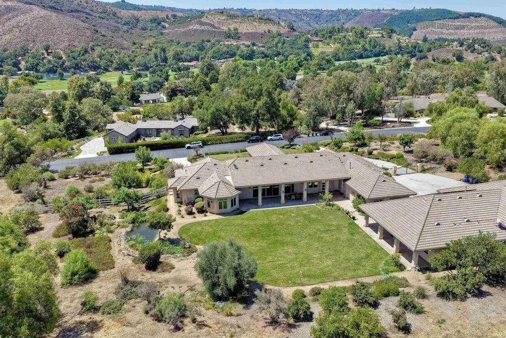 FABULOUS FIND IN PARADISE! Nestled in Pauma Valley Country Club Estates, a private, safe gated community, with 24/7 roaming security guards. This stunning retreat offers a private oasis of luxury and unparalleled amenities. Key features and benefits include: Brazilian cherry hardwood floors and Vaulted beamed ceiling. His and hers offices, media room, and 950 sq ft guest house. 3 car garage, Woodworking shop, RV garage, Circular driveway and 3.2 acres of private land. 4 bedrooms including a 1 bedroom guest house. Expansive front lawn, stone-pillared entry, and mountain views. Owned Solar. Two Koi ponds and 36 fruit trees including, Cherry, Peach, Apricot, Kumquat, Persimmon, Tangerine, Blood Orange, Orange, Pomegranate, Jujube Apple, Mexican Guava, Longan, Cherimoya, Pomelo, Plum, Nectarine, Champagne Grapes and Walnut. As you step through the front door, you'll be welcomed into a home of relaxed comfort and seamless indoor-outdoor living. The wall of large sliding doors not only floods the space with natural light, but transforms the outside into an extension of your living area, showcasing the picturesque mountain views and park-like backyard. This exceptional property is the ultimate retreat for discerning executives and families seeking the utmost in privacy, luxury, and customized amenities. With a large master bedroom and bath including walk-in shower and closet, dedicated offices, a state-of-the-art kitchen, Butler's pantry, Wet bar, media room, and private guest accommodations, this home caters to every lifestyle need - whether you're entertaining clients, pursuing