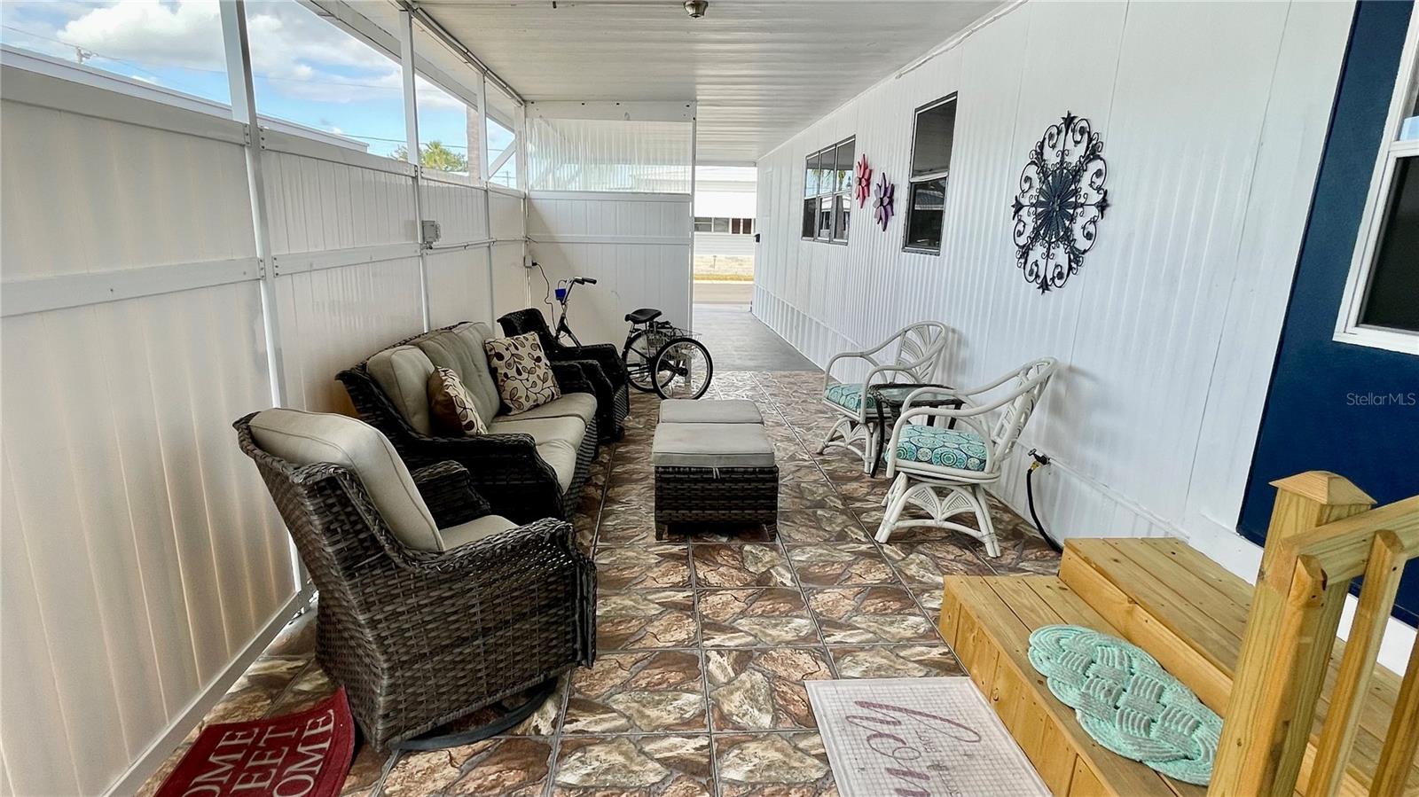 VOTED ONE OF THE TOP 5 RETIREMENT COMMUNITIES IN 2025!! 2 bed, 1.5 bath, Florida room home in a well desired 55+ park. This home comes TURNKEY, MOVE RIGHT IN... SHARE is included in list price (valued at $55,000); Home has updated touches throughout the home, #1 is the kitchen featuring ample amount of warm wood cabinetry and countertop and backsplash... newer lighted fans in both bedrooms... some updated light fixtures... water heater 2023... Roof is coated every 2 years... laminate flooring throughout, NO CARPET! Much sitting/entertaining area under the covered front patio, side patio surrounded by a privacy fence AND a sitting area added by the seller for some great sunning on the side of the privacy patio. This park is in close proximity to the beaches, airports, I – 275, churches, restaurants, all kinds of shopping, etc.… very inexpensive living at ONLY... $210 per month which includes all the amenities one could want; WATER, SEWER, and TRASH, owned clubhouse, escrows are fully funded, beautiful heated pool and spa, fitness center, library, shuffleboard, billiard table, and a small lake at the back of the park, laundry room, and your very own private entrance to the super Walmart… on foot, bicycle or golf cart… Etc., etc. GOLF CART may be negotiated.