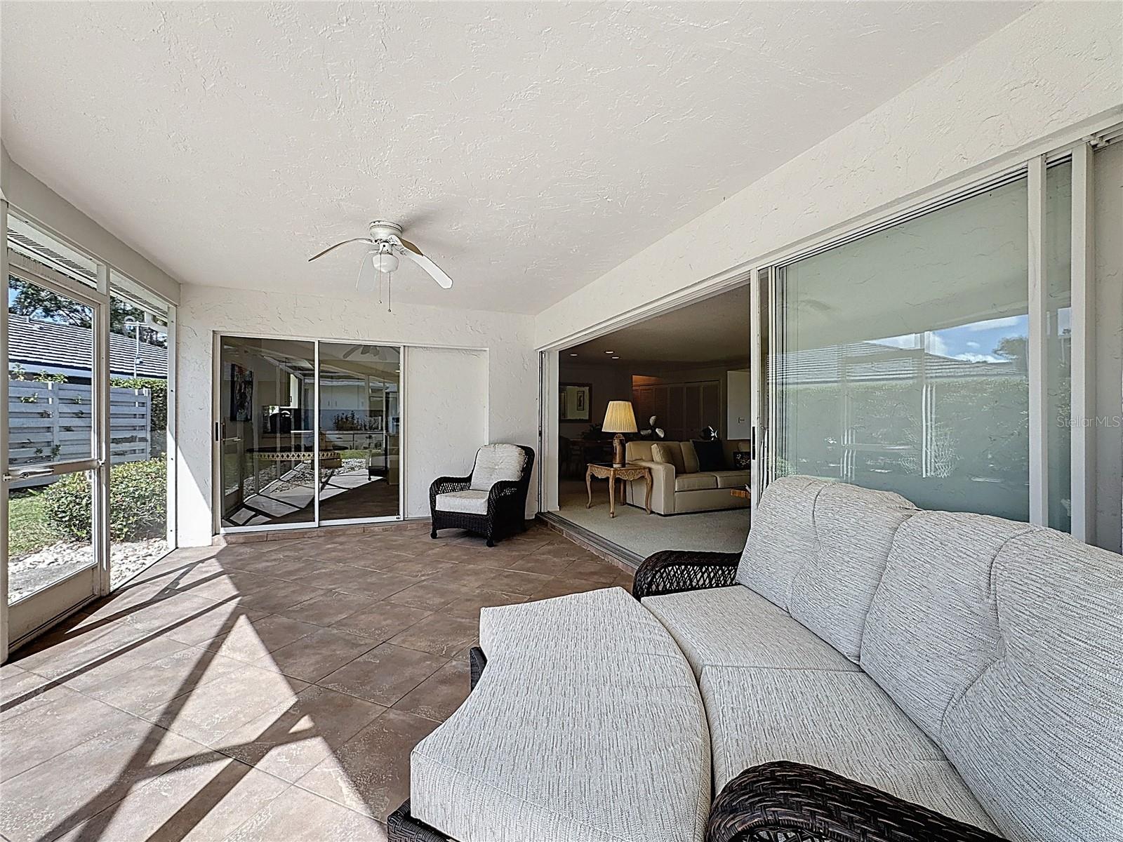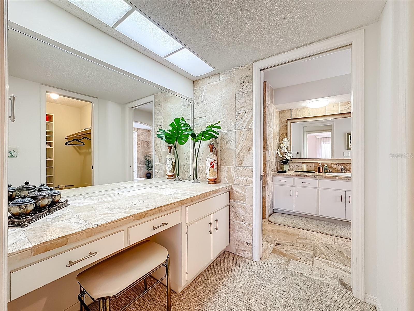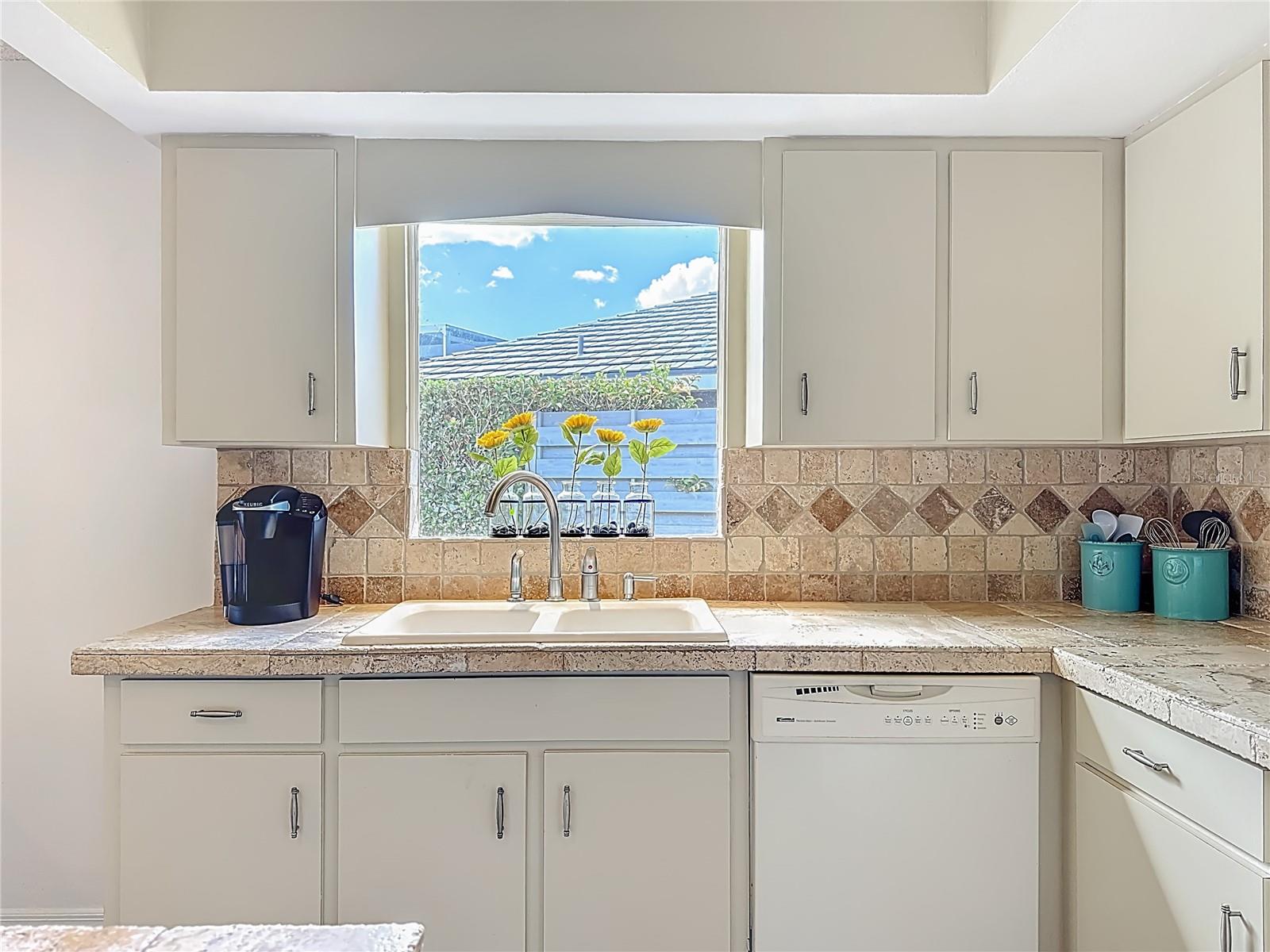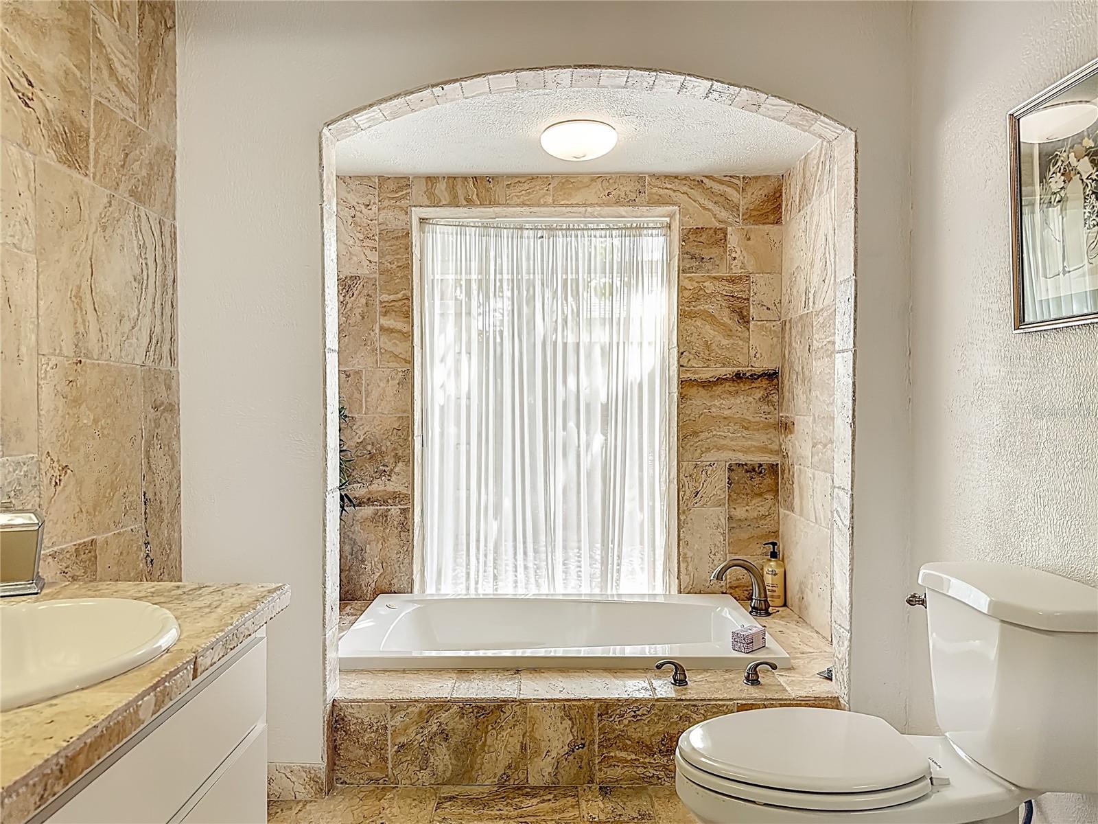 The split floor plan provides privacy for guests, while the spacious lanai offers a comfortable space for relaxing or hosting gatherings. Interior updates include custom travertine-tiled bathrooms, a spa-style primary suite with a sunken whirlpool tub and custom vanity area. Major improvements include a 2023 roof and 2025 HVAC.