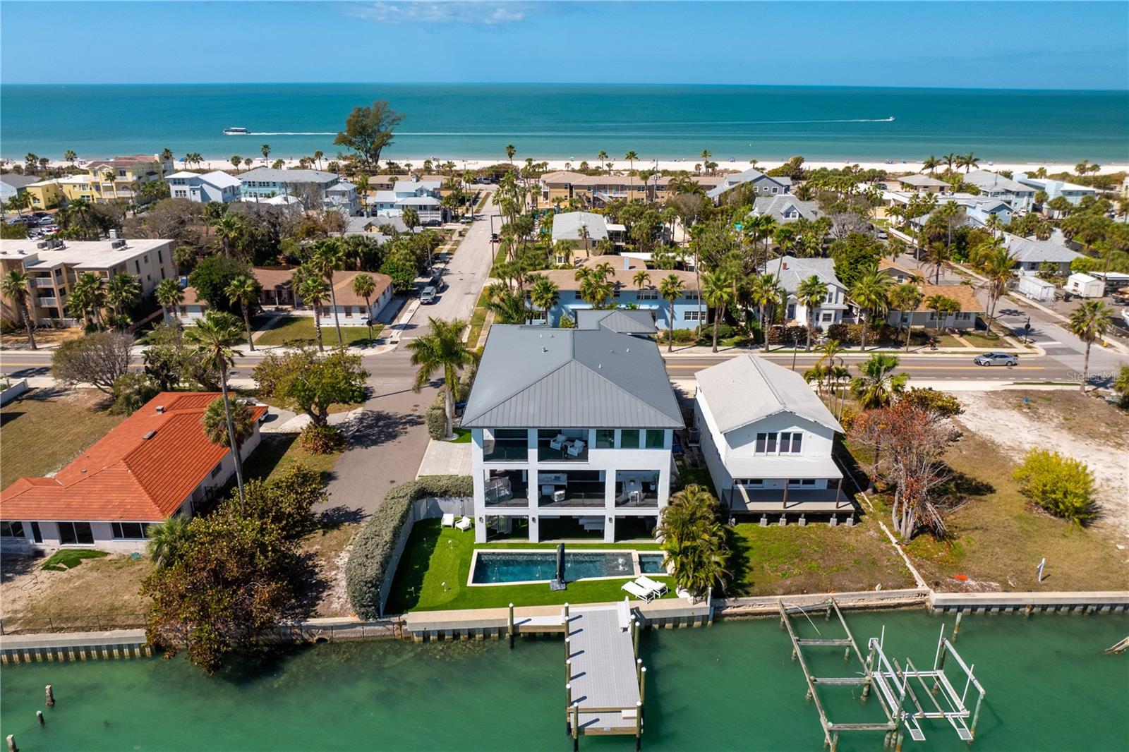 One of the best, strongest homes ever constructed in Pass A Grille Beach. This waterfront fortress sits on an oversized lot with amazing views of the intra-coastal waterway, perfect for sunrises and sunsets. This entire home is a custom masterpiece that was thoughtfully built. It is a wonderful blend of modern clean lines and coastal warmth. The location could not be more perfect. You can walk 600 ft to the beautiful sands of Pass A Grille Beach but also enjoy a private waterfront backyard, facing East for shaded afternoons complete with heated saltwater pool and spa. The backyard features a PGA putting green and new turf throughout the property. It is the ONLY home in Pass A Grille in the No Wake Zone that has a wide open water view! For boating, no bridges to the Gulf of America, straight shot south, less than a mile away. You are minutes from the interstate if you wish to travel, or you can walk to local shops and restaurants. With a south side street to access your driveway, you have plenty of private parking for guests. This property has many features that are unique to the area, that may not be able to be duplicated ever again. Photos of the interior as well as construction photos are available upon request after a provided a proof of funds.