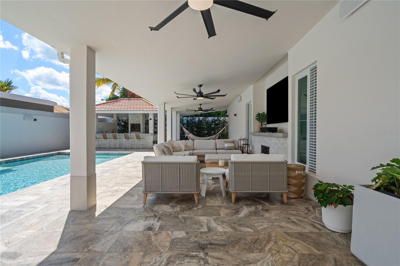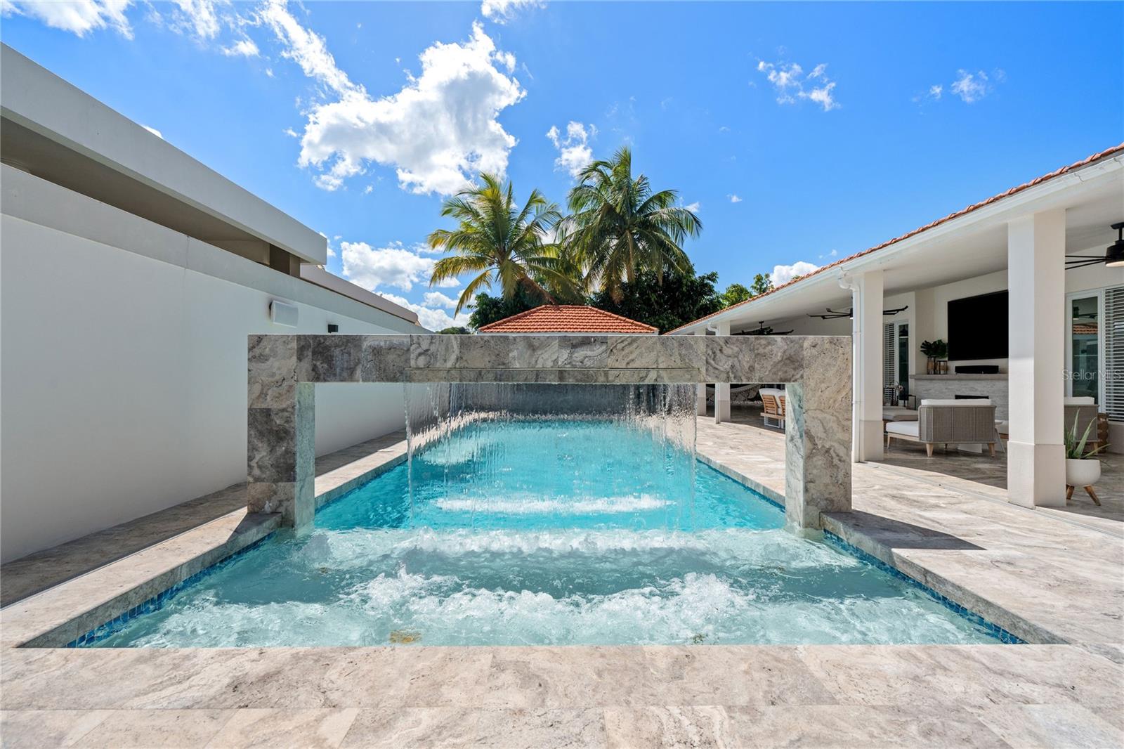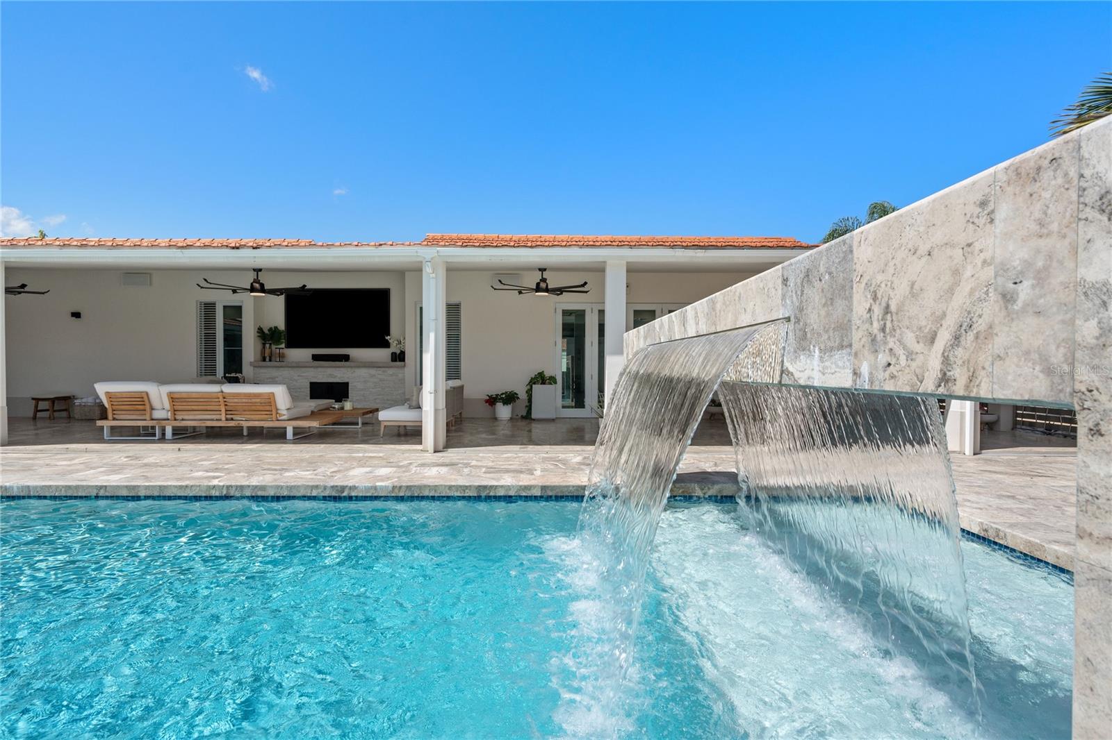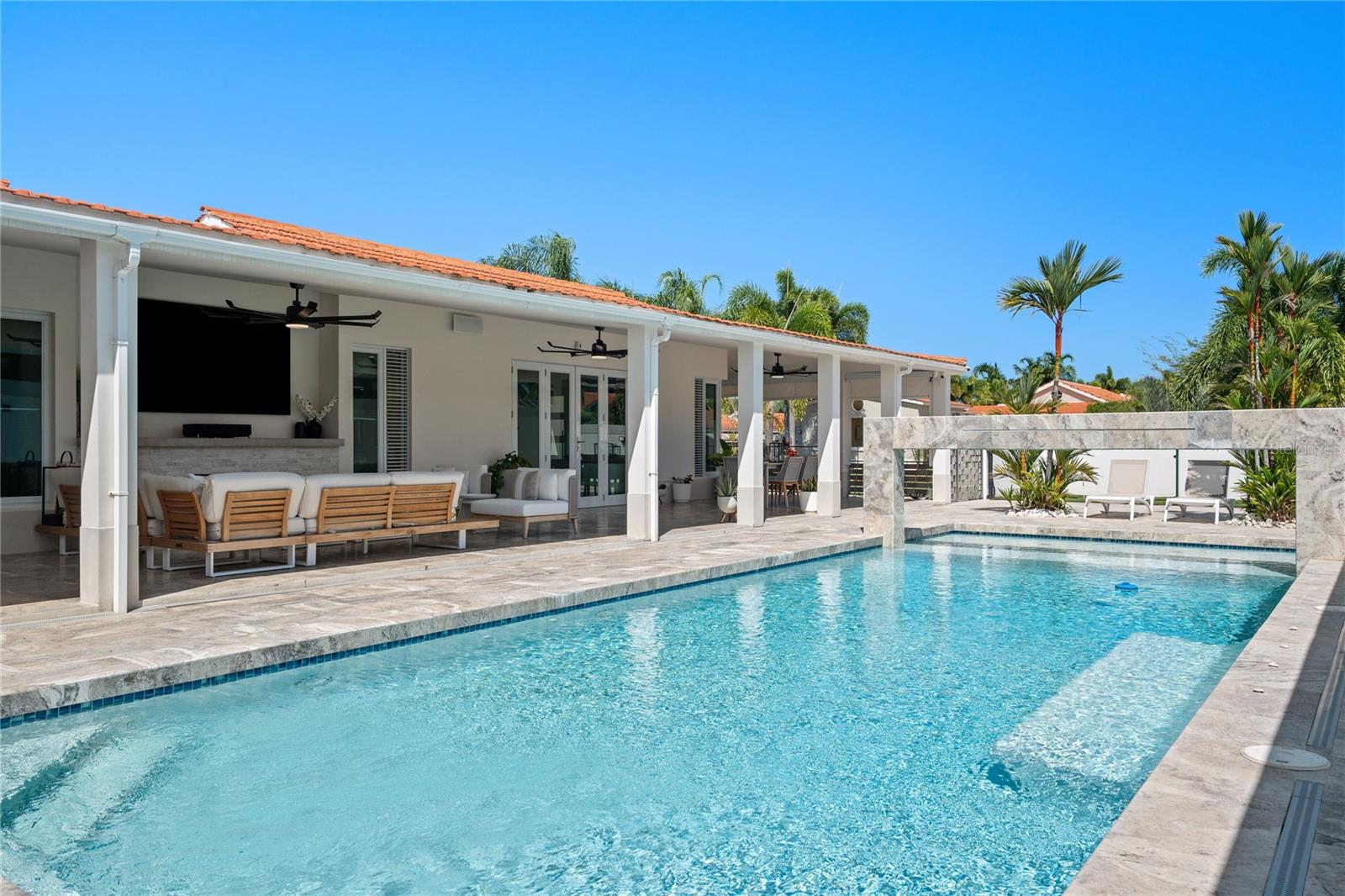 Outdoor amenities include a heated saltwater pool with waterfall, extended terrace, full outdoor kitchen with Built-in BBQ with Masonry Exhaust Hood , stove, ice maker, 85” outdoor Frame TV, and a private artificial turf putting green. The home also includes a Control4 smart home system, integrated sound system, and two wine refrigerators.