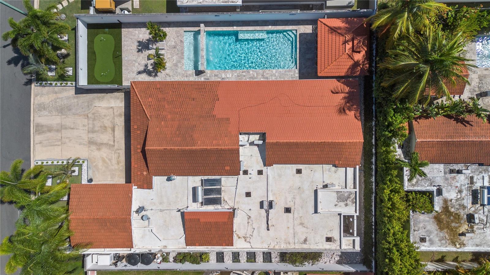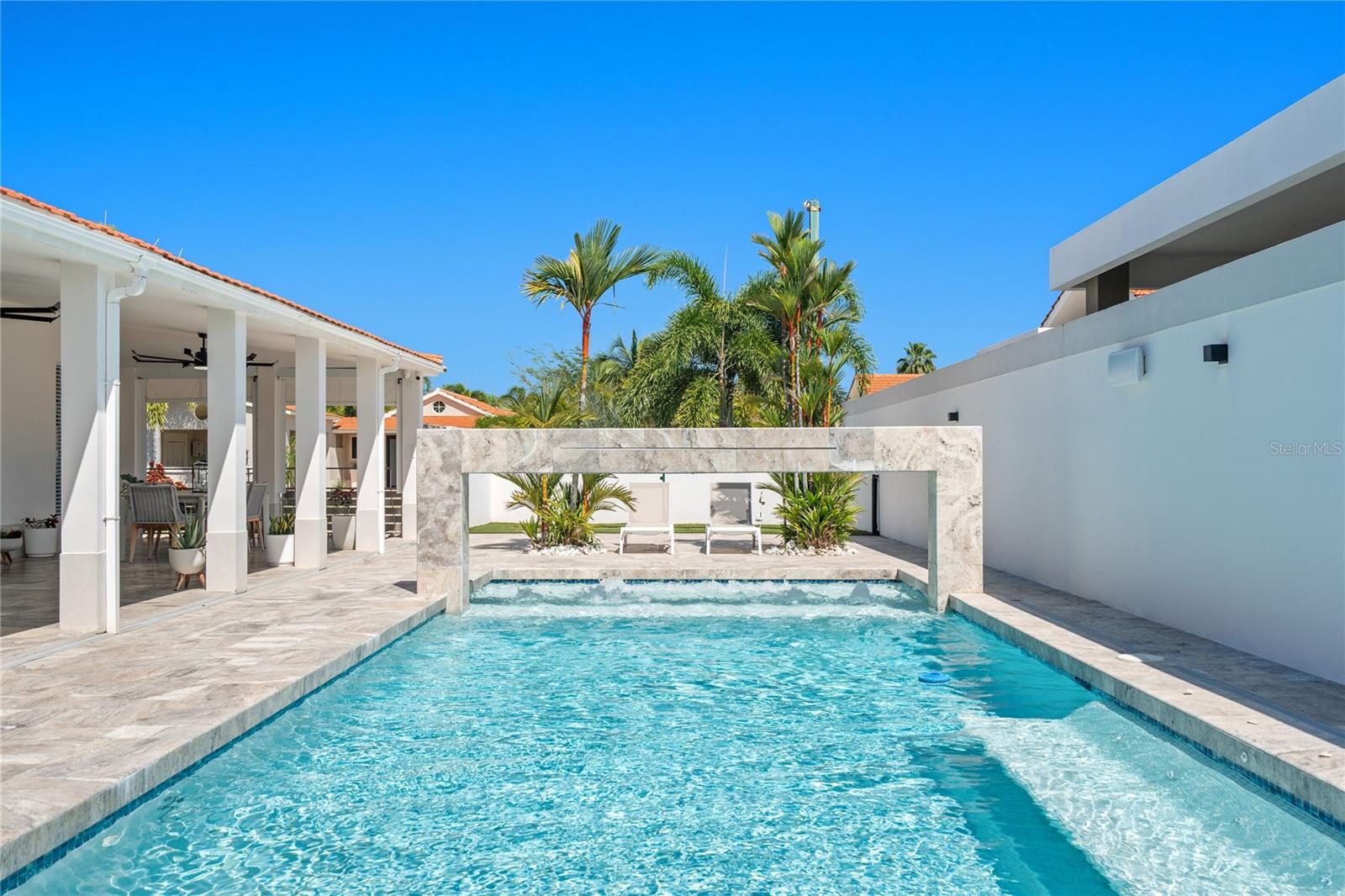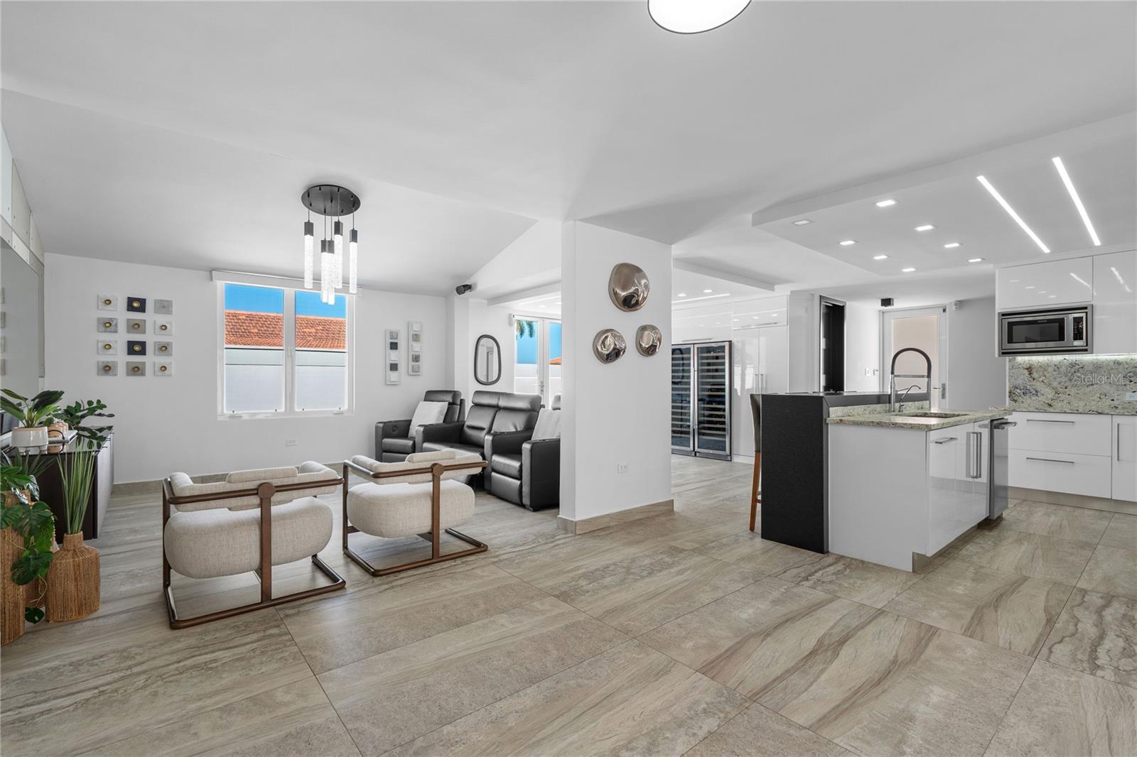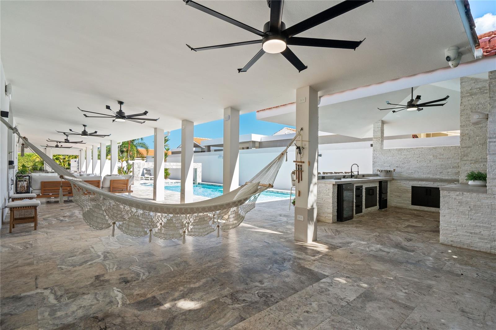 Outdoor amenities include a heated saltwater pool with waterfall, extended terrace, full outdoor kitchen with Built-in BBQ with Masonry Exhaust Hood , stove, ice maker, 85” outdoor Frame TV, and a private artificial turf putting green. The home also includes a Control4 smart home system, integrated sound system, and two wine refrigerators.
