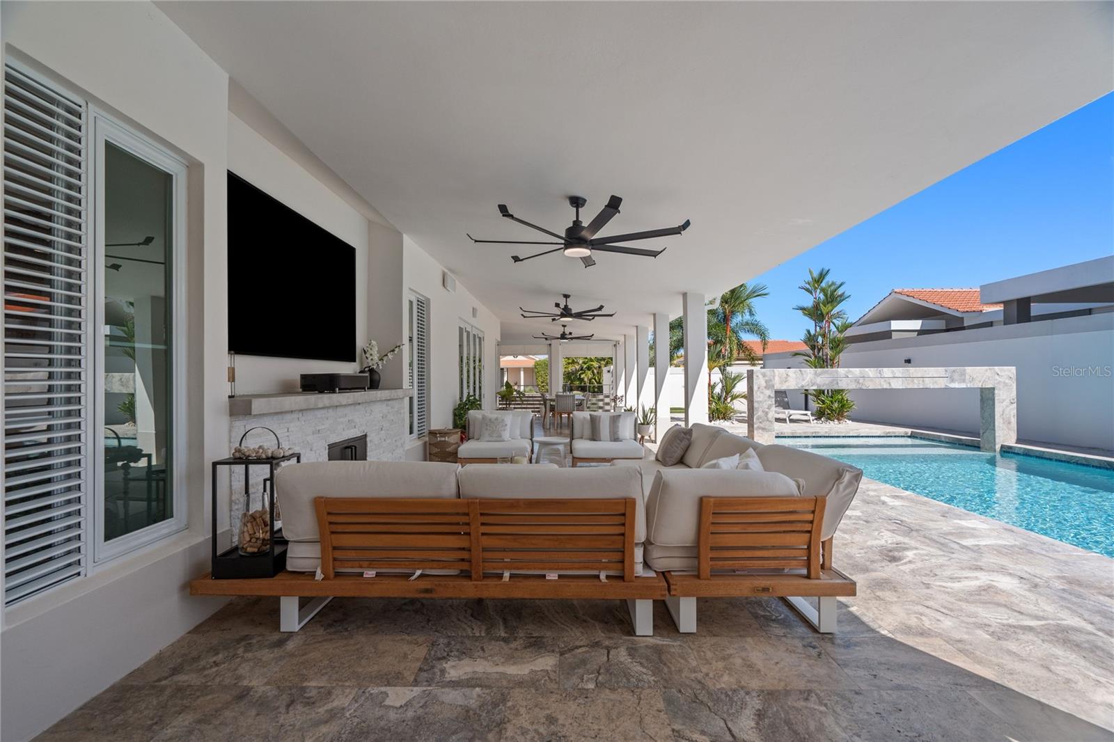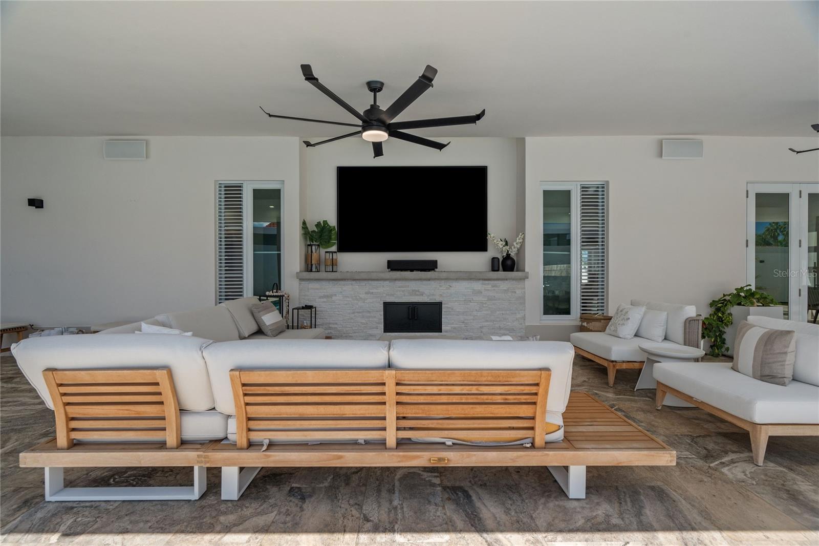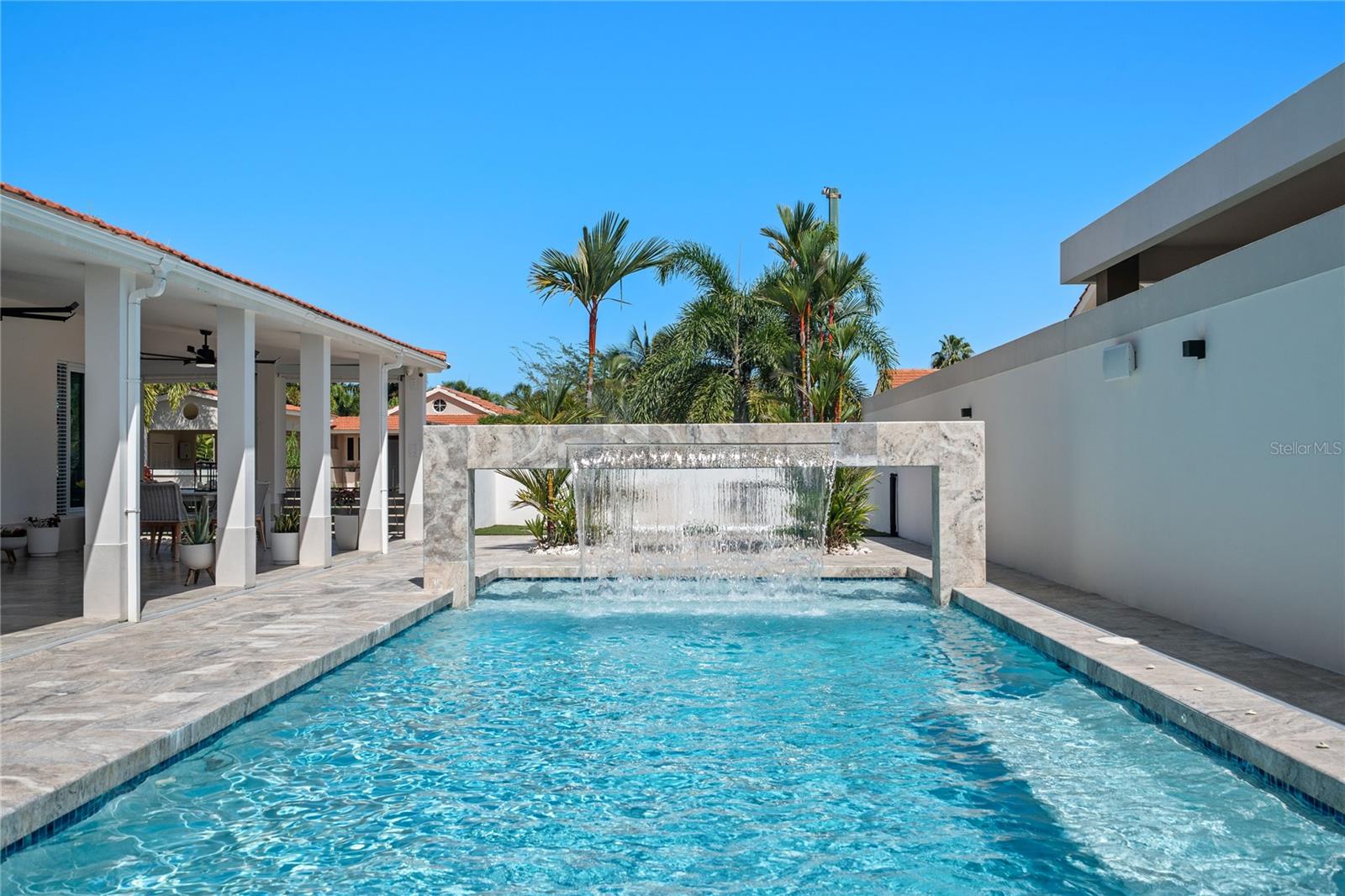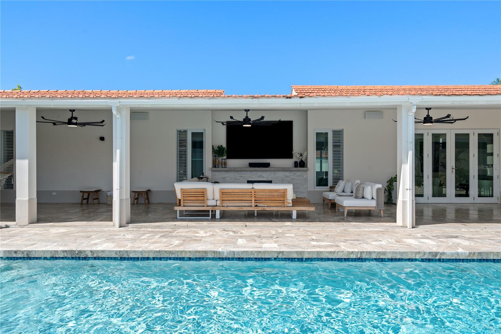 Outdoor amenities include a heated saltwater pool with waterfall, extended terrace, full outdoor kitchen with Built-in BBQ with Masonry Exhaust Hood , stove, ice maker, 85” outdoor Frame TV, and a private artificial turf putting green. The home also includes a Control4 smart home system, integrated sound system, and two wine refrigerators.