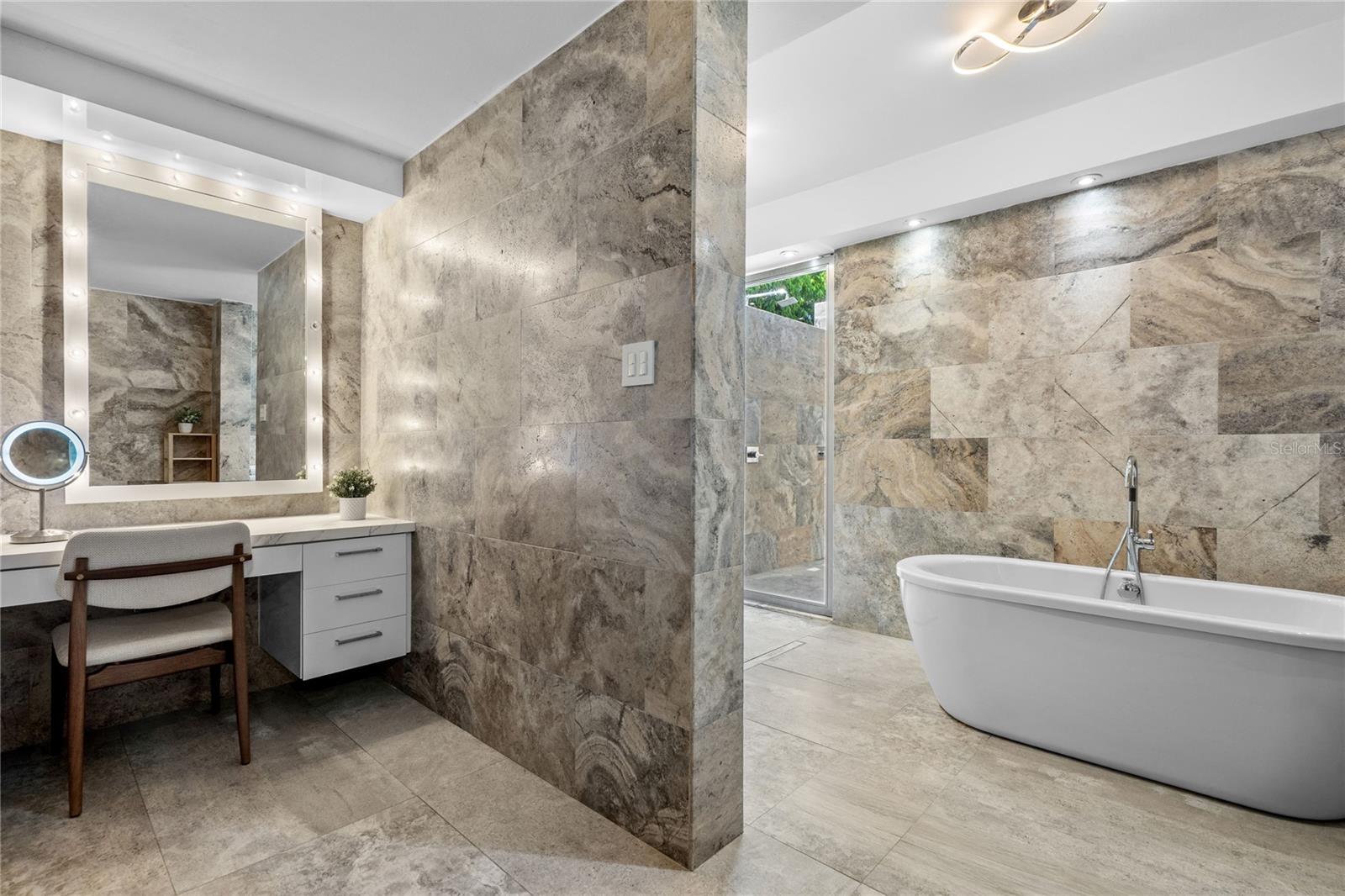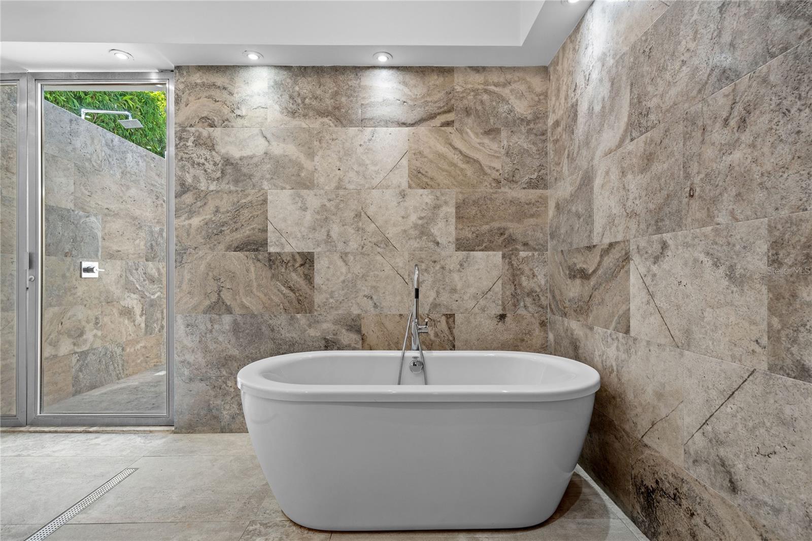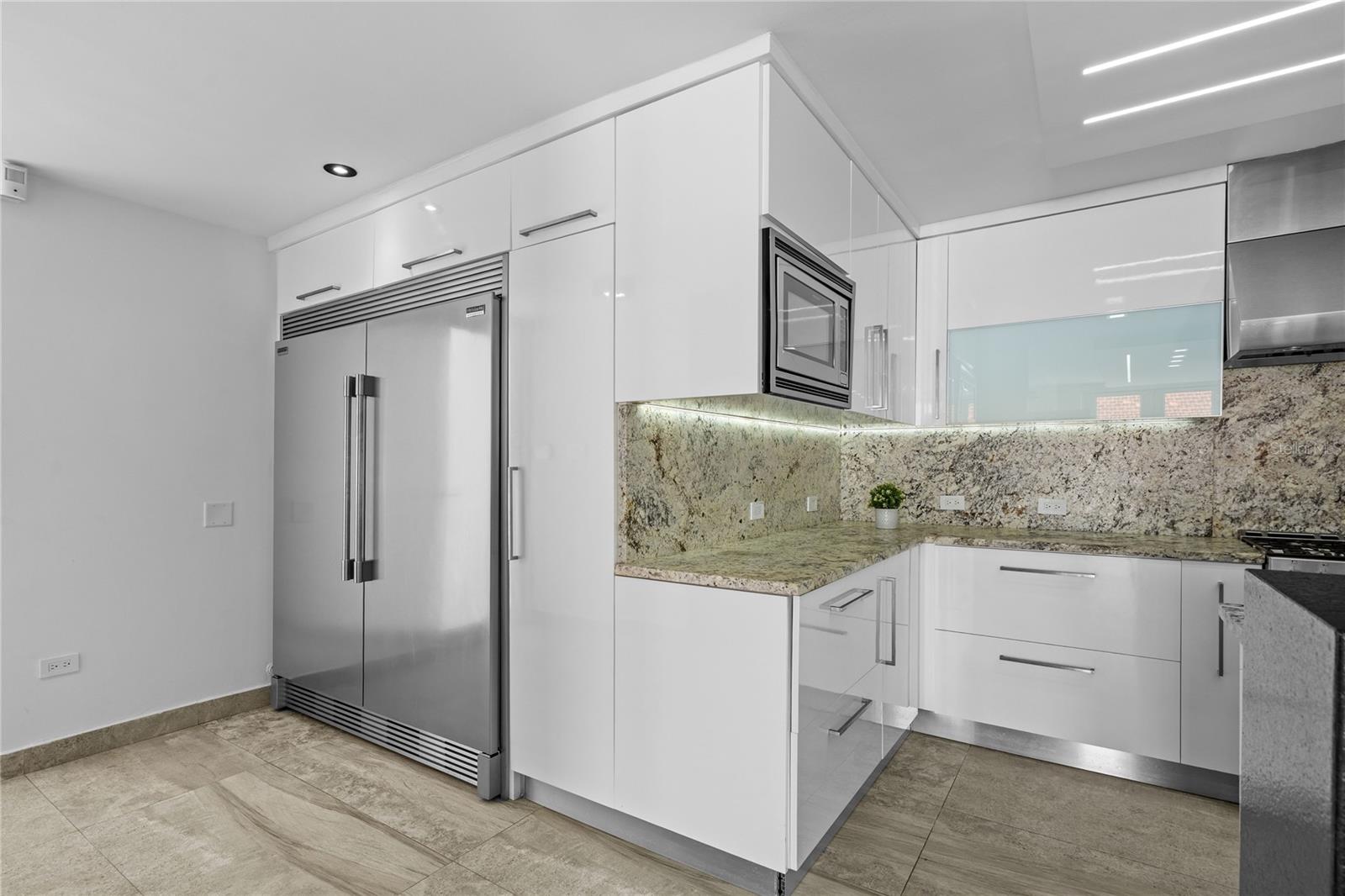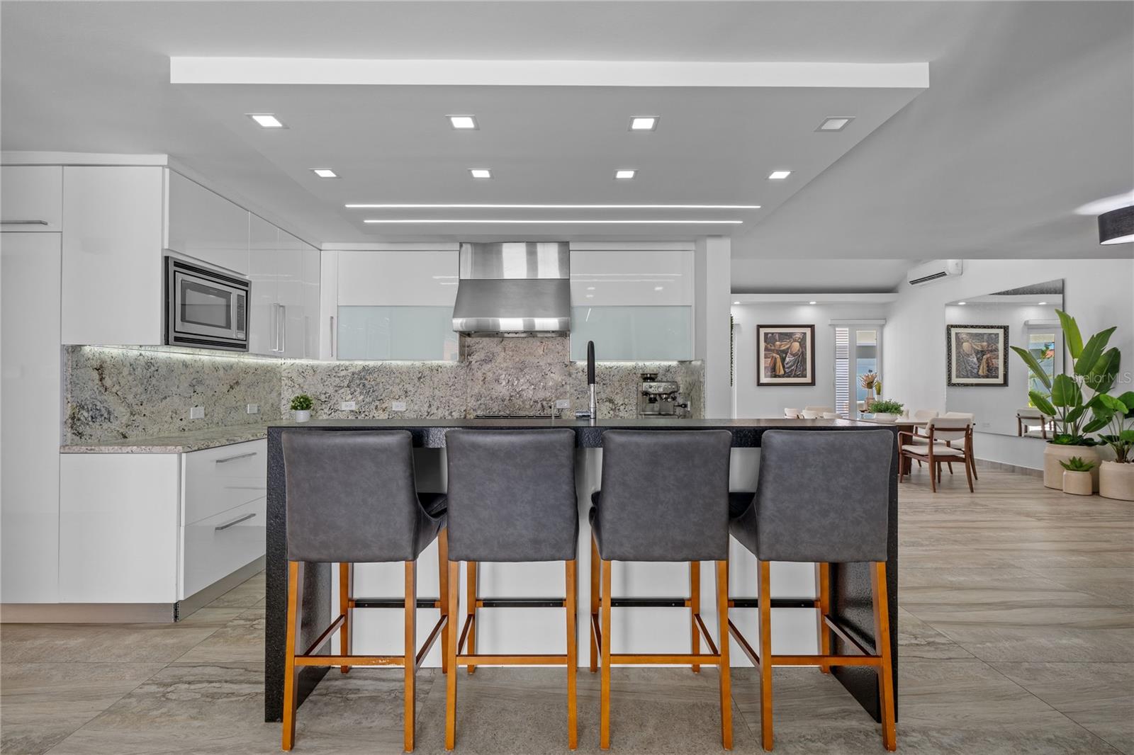 Outdoor amenities include a heated saltwater pool with waterfall, extended terrace, full outdoor kitchen with Built-in BBQ with Masonry Exhaust Hood , stove, ice maker, 85” outdoor Frame TV, and a private artificial turf putting green. The home also includes a Control4 smart home system, integrated sound system, and two wine refrigerators.