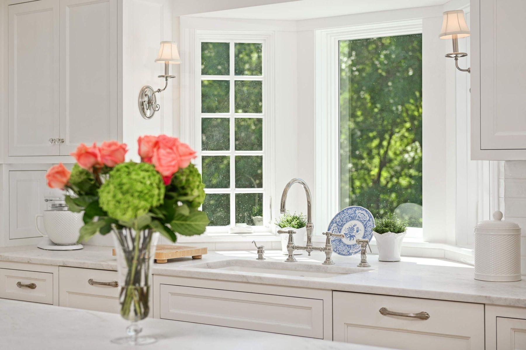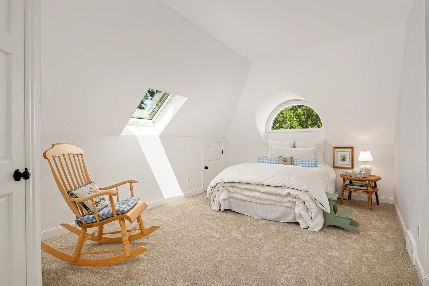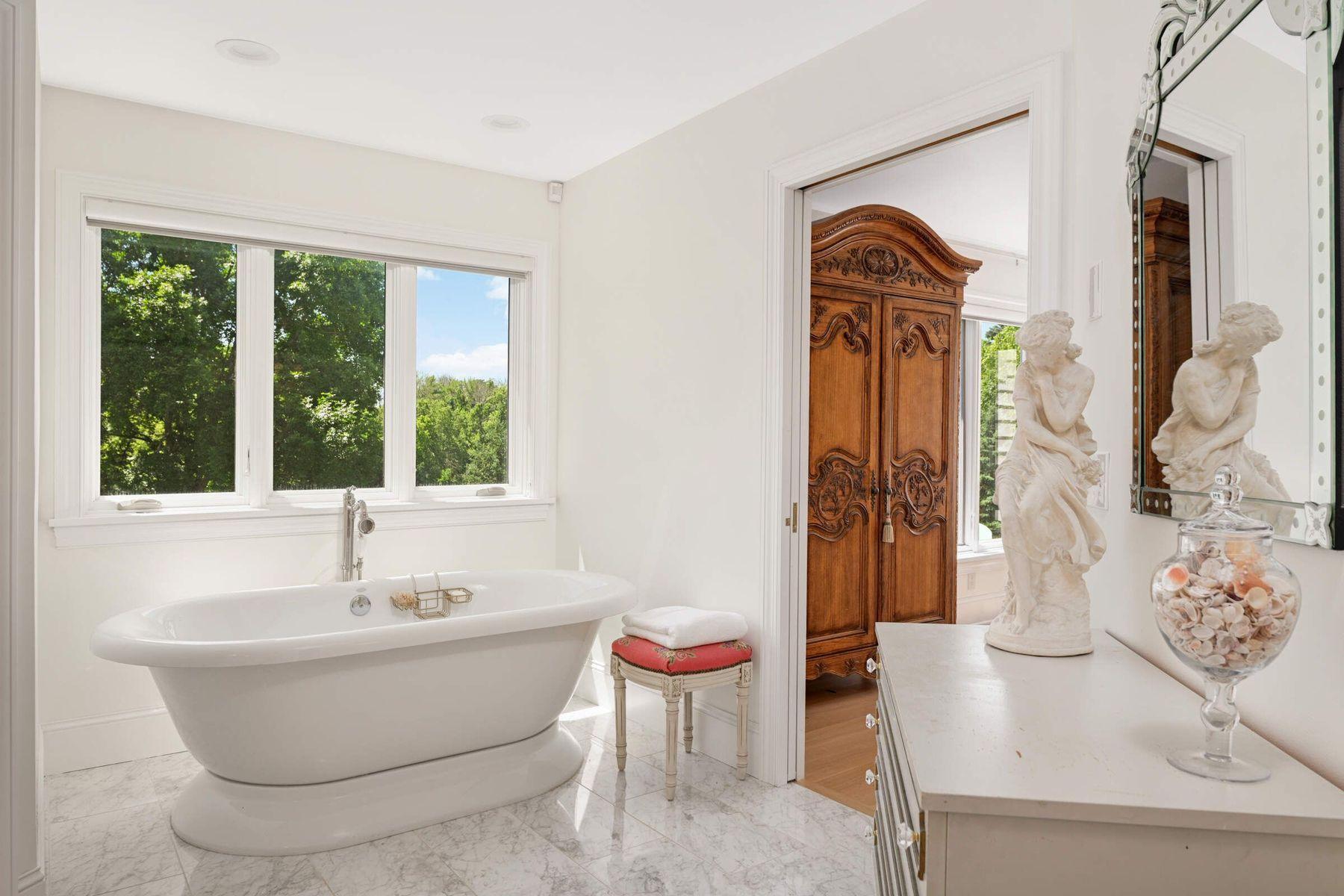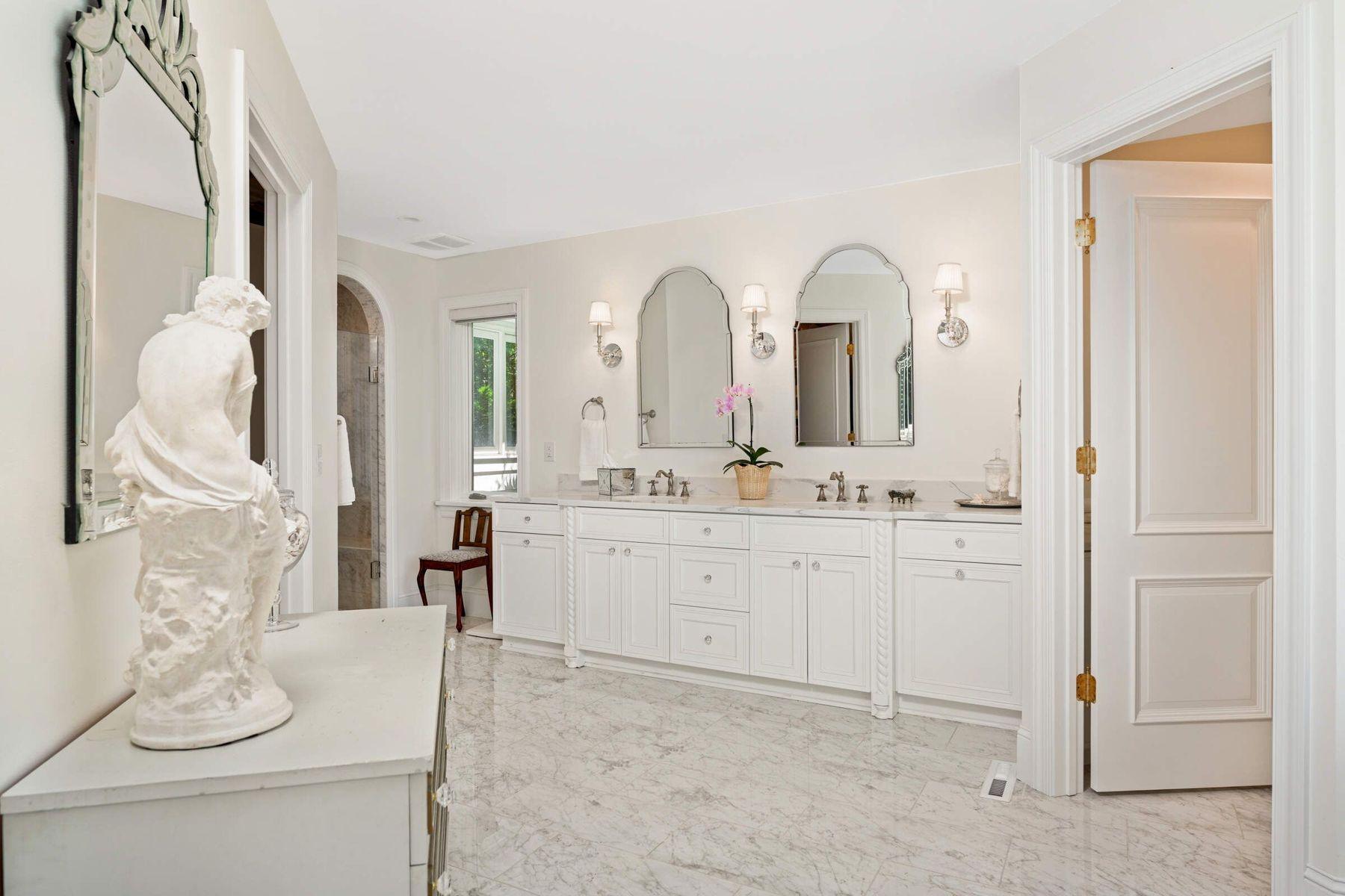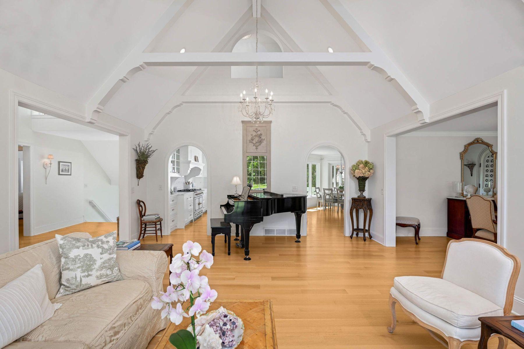 Sun-filled spaces flow seamlessly, enhanced by white oak hardwood floors, cathedral ceilings, archways, and a peaceful, sophisticated palette. The living room is crowned by a dramatic custom Palladian window-one of the home’s signature features - framing sweeping views of the wooded acreage. The stunning designer kitchen is a showpiece, highlights including custom enameled cabinetry, a 42” La Cornue range with patina brass
