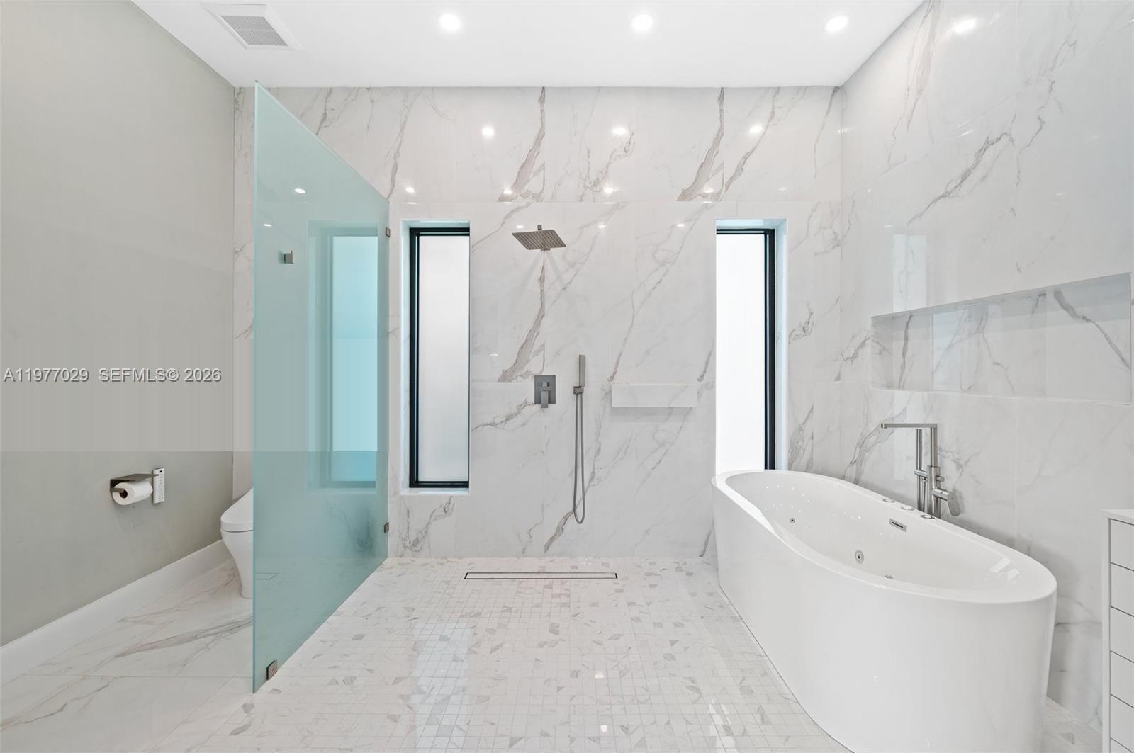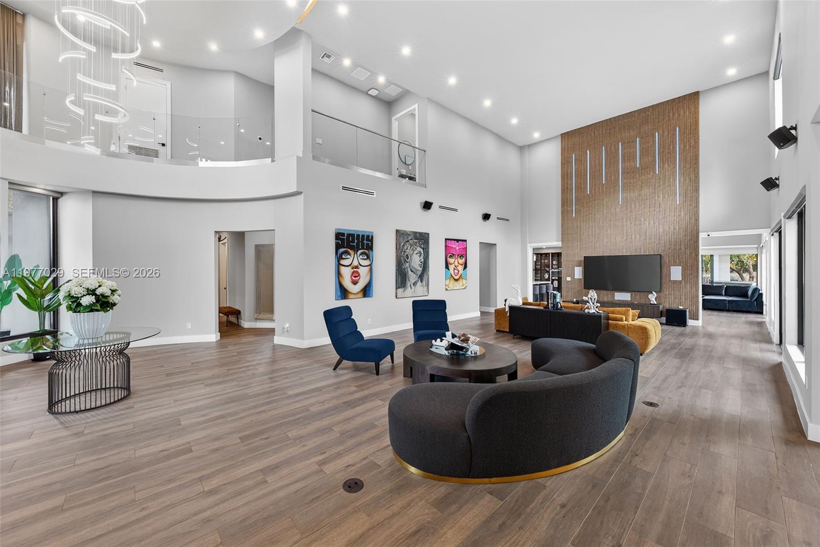 Rare offering in Windmill Ranch Estates featuring one of the largest waterfront cul-de-sac point lots currently available in the community. This exceptional property sits on a private 44,219 SF acre-plus lot with water views on both sides and remarkable privacy. The unique contemporary residence offers 5 bedrooms, 5.5 bathrooms, and a private office that can easily serve as a sixth bedroom. The home showcases dramatic 28-foot ceilings, expansive glass walls, and a striking architectural design filled with natural light. Architectural highlights include a spectacular two-story library with a spiral staircase, a grand sweeping staircase, spacious living areas, and a gourmet kitchen with quartz countertops and stainless steel appliances. The primary suite features dual bathrooms and oversized walk-in closets. Outdoor spaces include a pool, multiple terraces, and a summer kitchen, ideal for entertaining while enjoying beautiful sunset and water views.